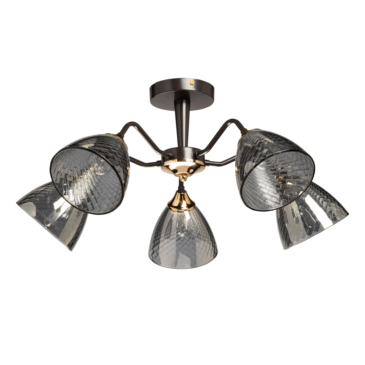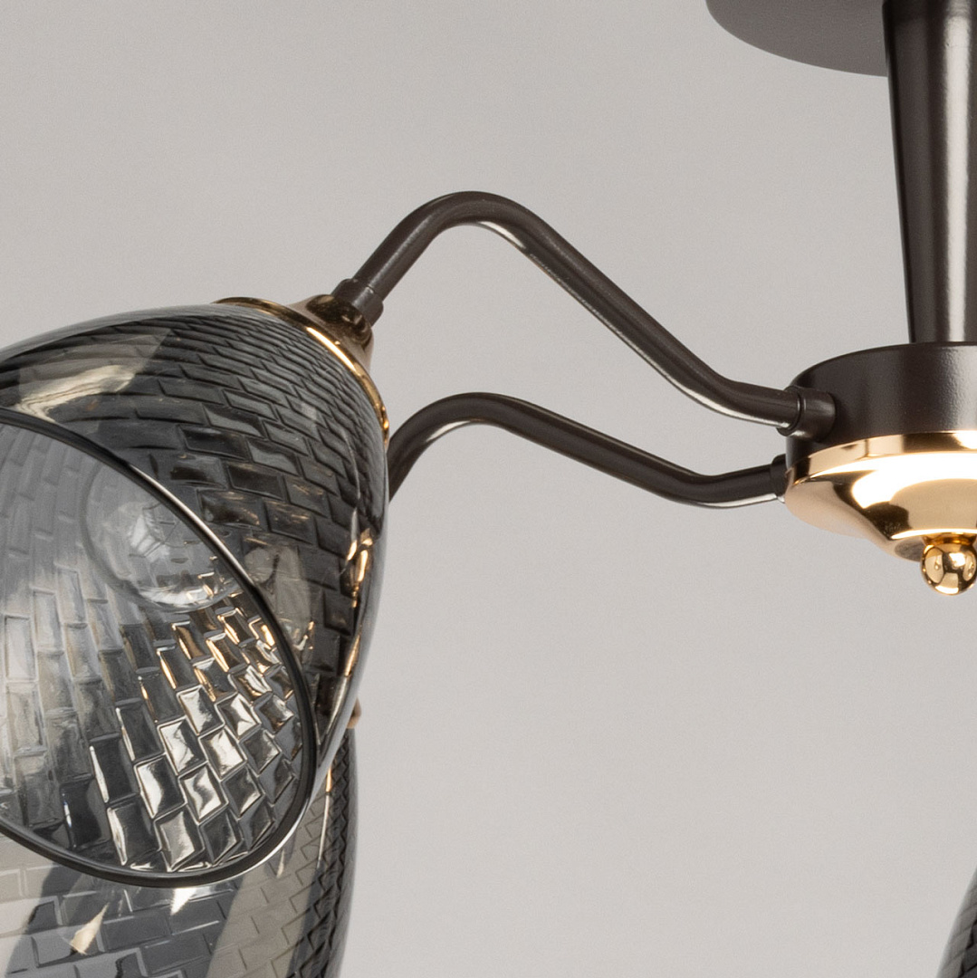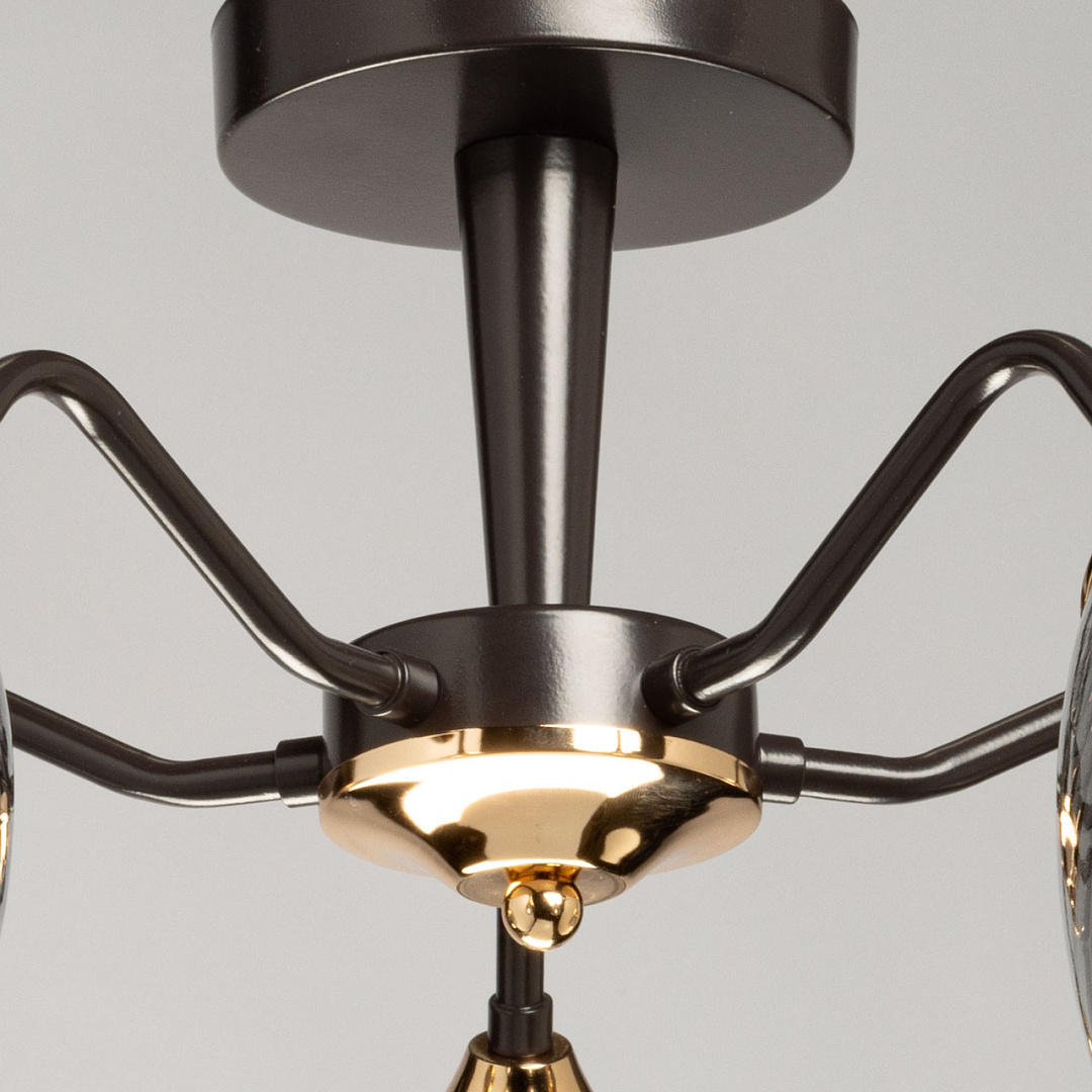 Комбинация металлов цвета кофе и золота является стильным и современным решением, которое придает люстре изысканный и элегантный вид. Темная глубина металла эффектно подчеркивается золотыми акцентами.Плафоны, гальванизированные в дымчатый цвет мягко рассеивают свет.Компактная высота светильника оптимальна для стандартной высоты потолка.Заменяемые источники света удобны в эксплуатации.