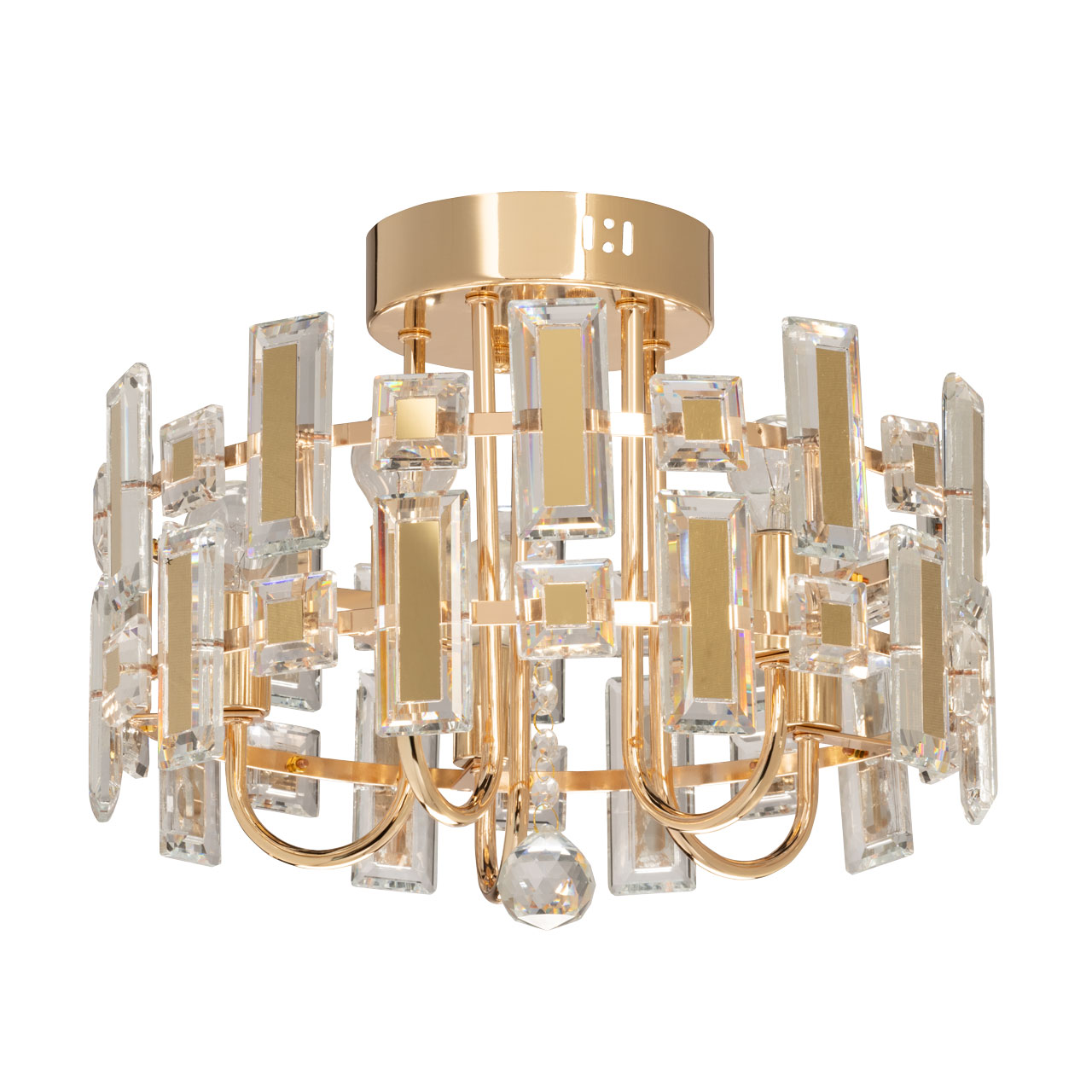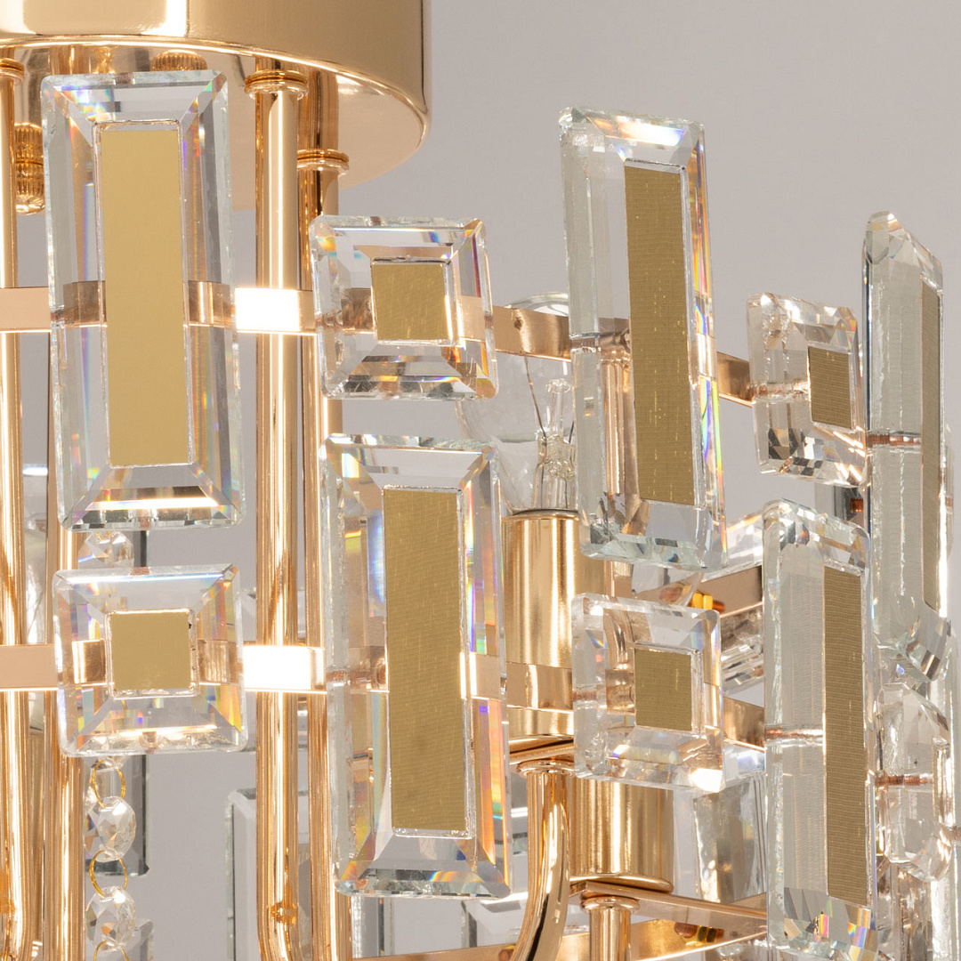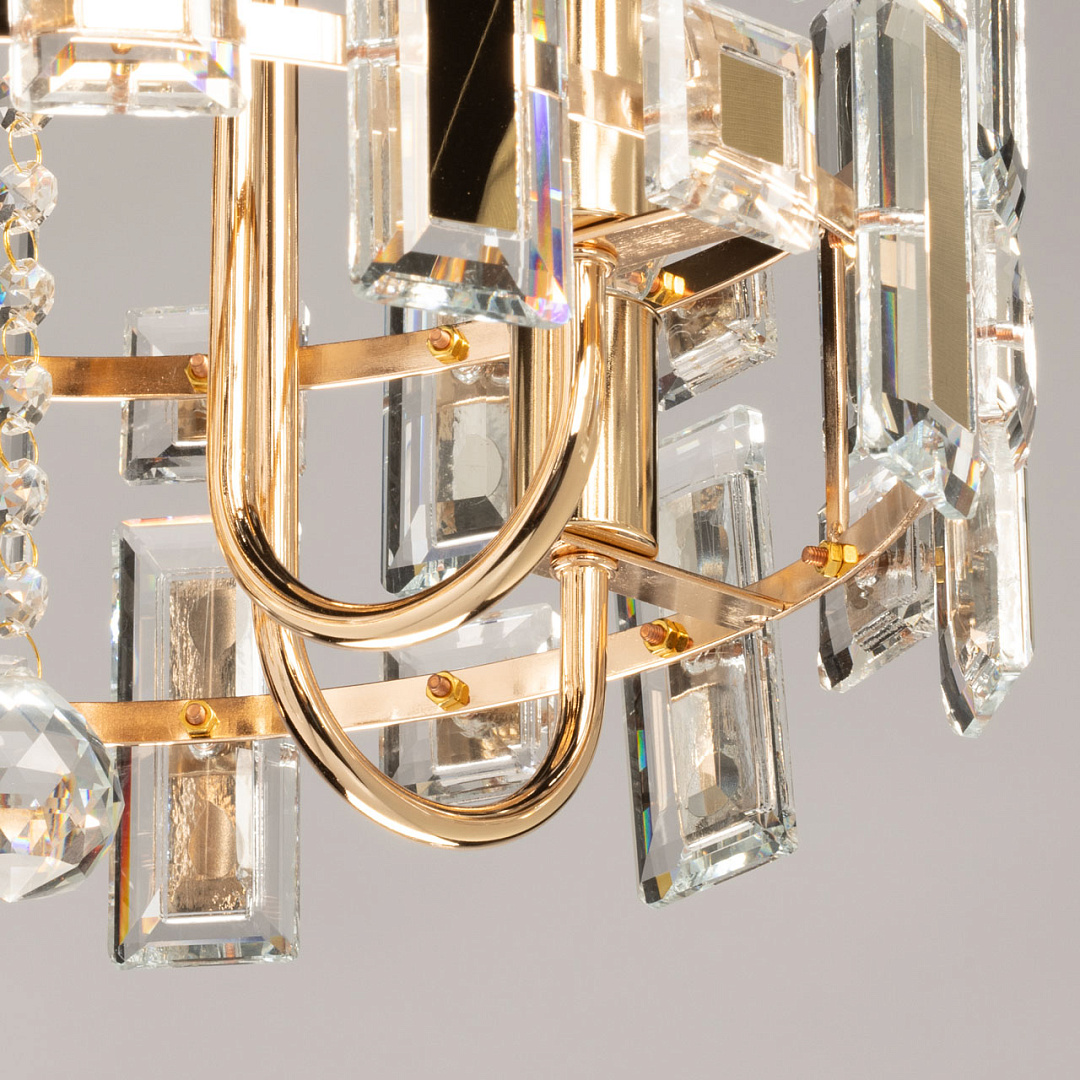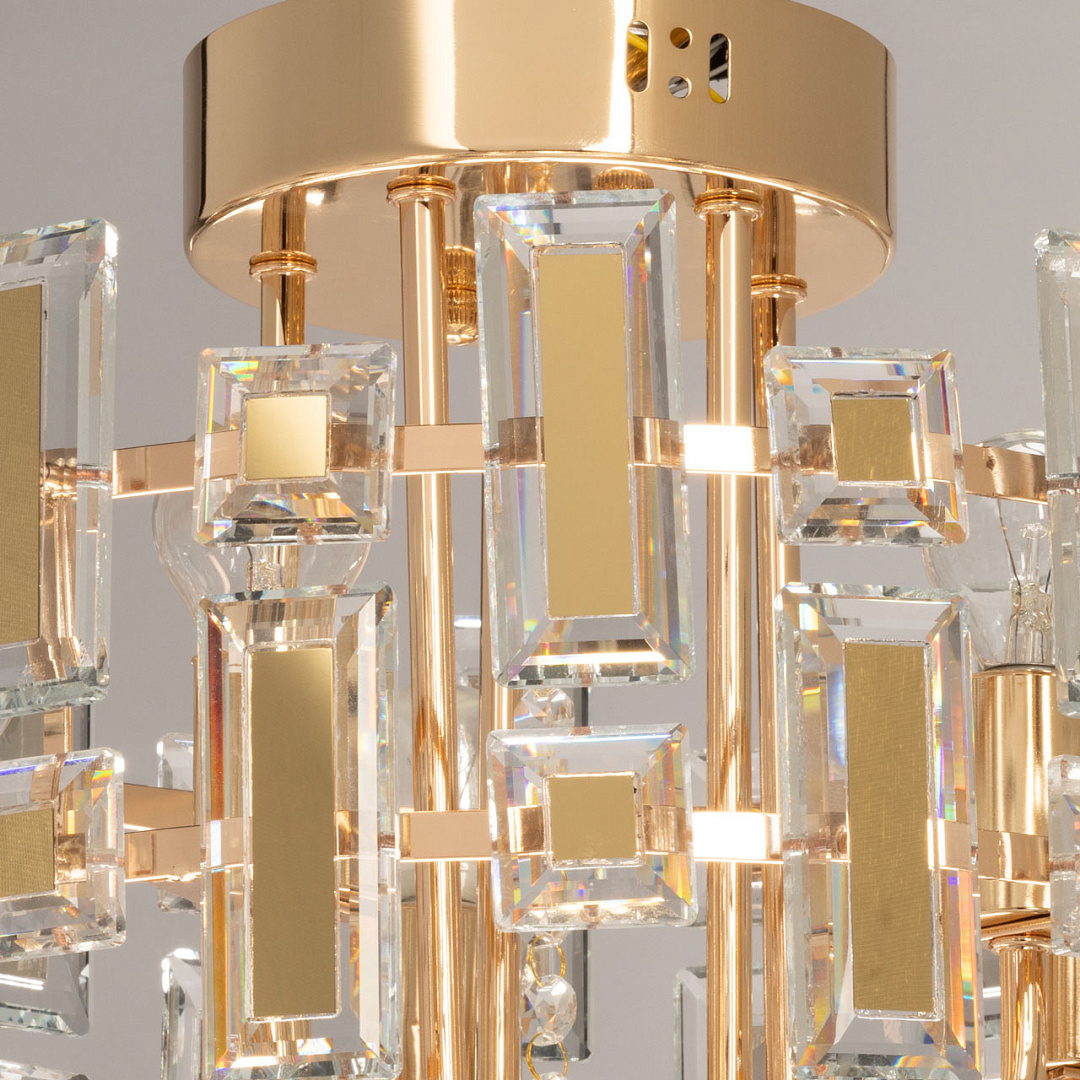 Цвет французского золота придает потолочной люстре приятный визуальный эффект. Прямоугольный хрусталь красиво преломляет свет, а металлические пластины на хрустале добавляют люстре индивидуальность. Гармоничное сочетание классического цвета основания, оригинального декора и минимализма в дизайне делает потолочную люстру ярким акцентом в интерьере. Заменяемые источники света удобны в эксплуатации. Компактный светильник для стандартной высоты потолка.