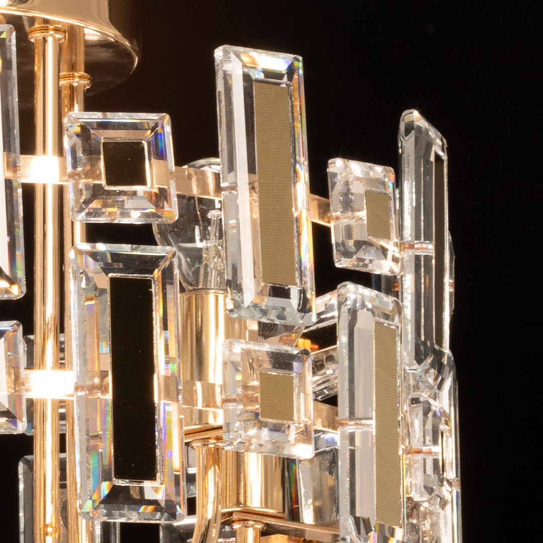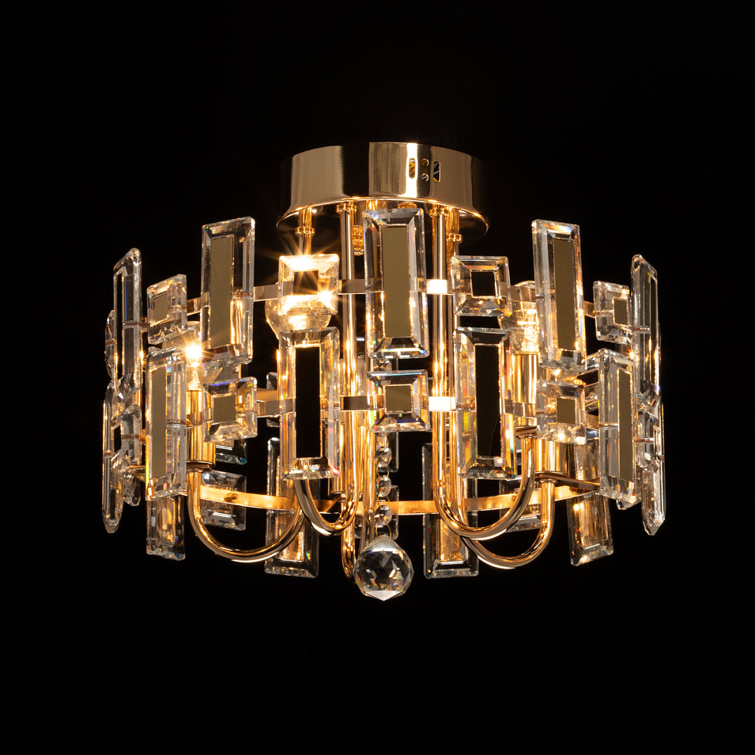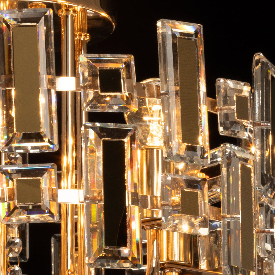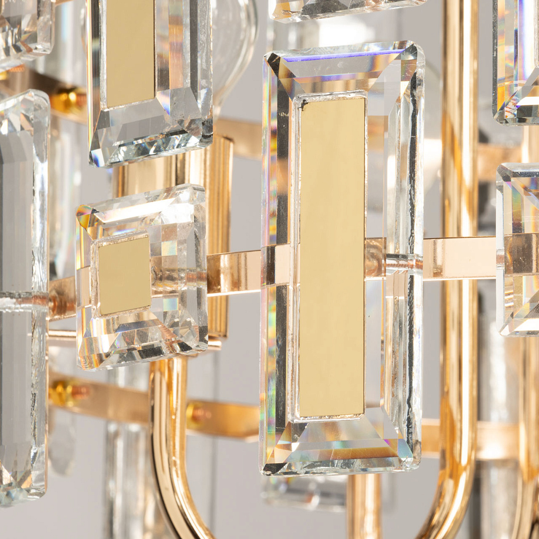 Цвет французского золота придает потолочной люстре приятный визуальный эффект. Прямоугольный хрусталь красиво преломляет свет, а металлические пластины на хрустале добавляют люстре индивидуальность. Гармоничное сочетание классического цвета основания, оригинального декора и минимализма в дизайне делает потолочную люстру ярким акцентом в интерьере. Заменяемые источники света удобны в эксплуатации. Компактный светильник для стандартной высоты потолка.