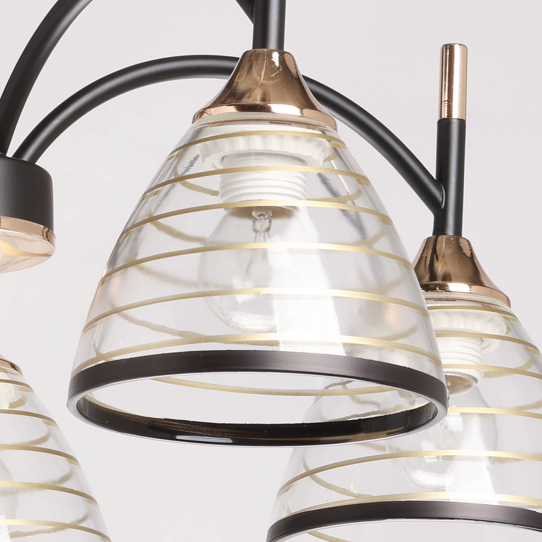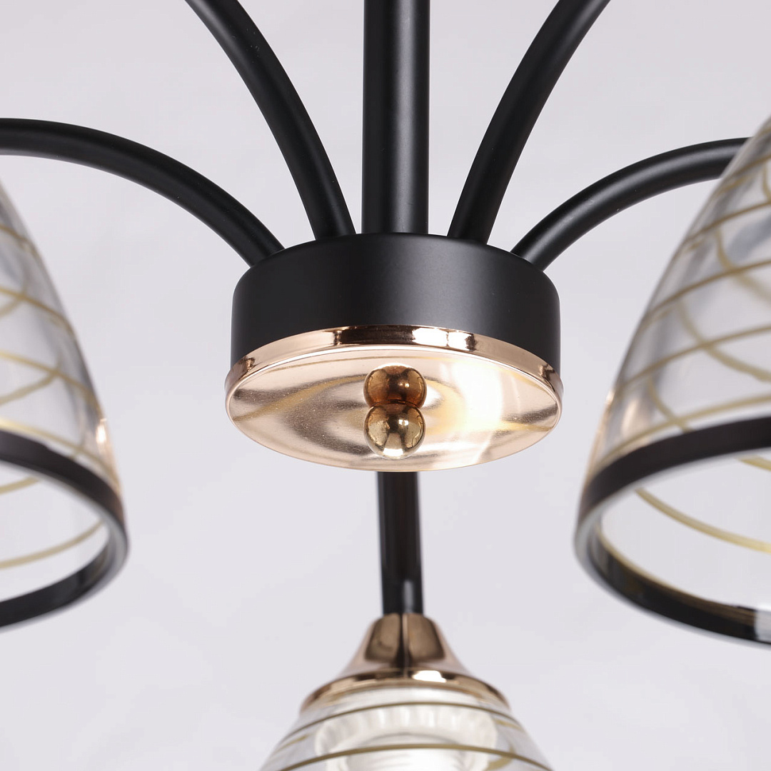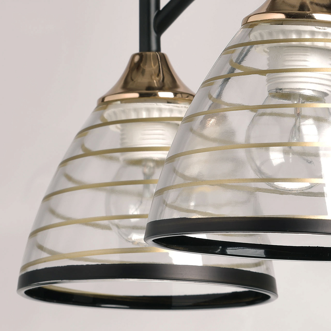 Черный цвет основания потолочной люстры подойдет к брутальному интерьеру в стиле лофт. Контрастное сочетание черного и золотого эффектно выделит люстру на потолке. Стеклянные плафоны с линейным рисунком красиво смягчают освещение. Заменяемые источники света удобны в эксплуатации. Компактный размер люстры сохраняет пространство комнаты и подходит для стандартных потолков.