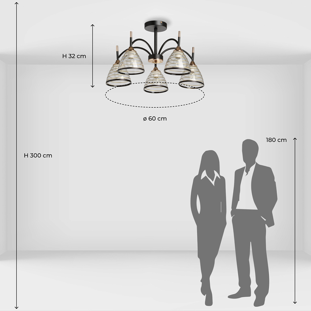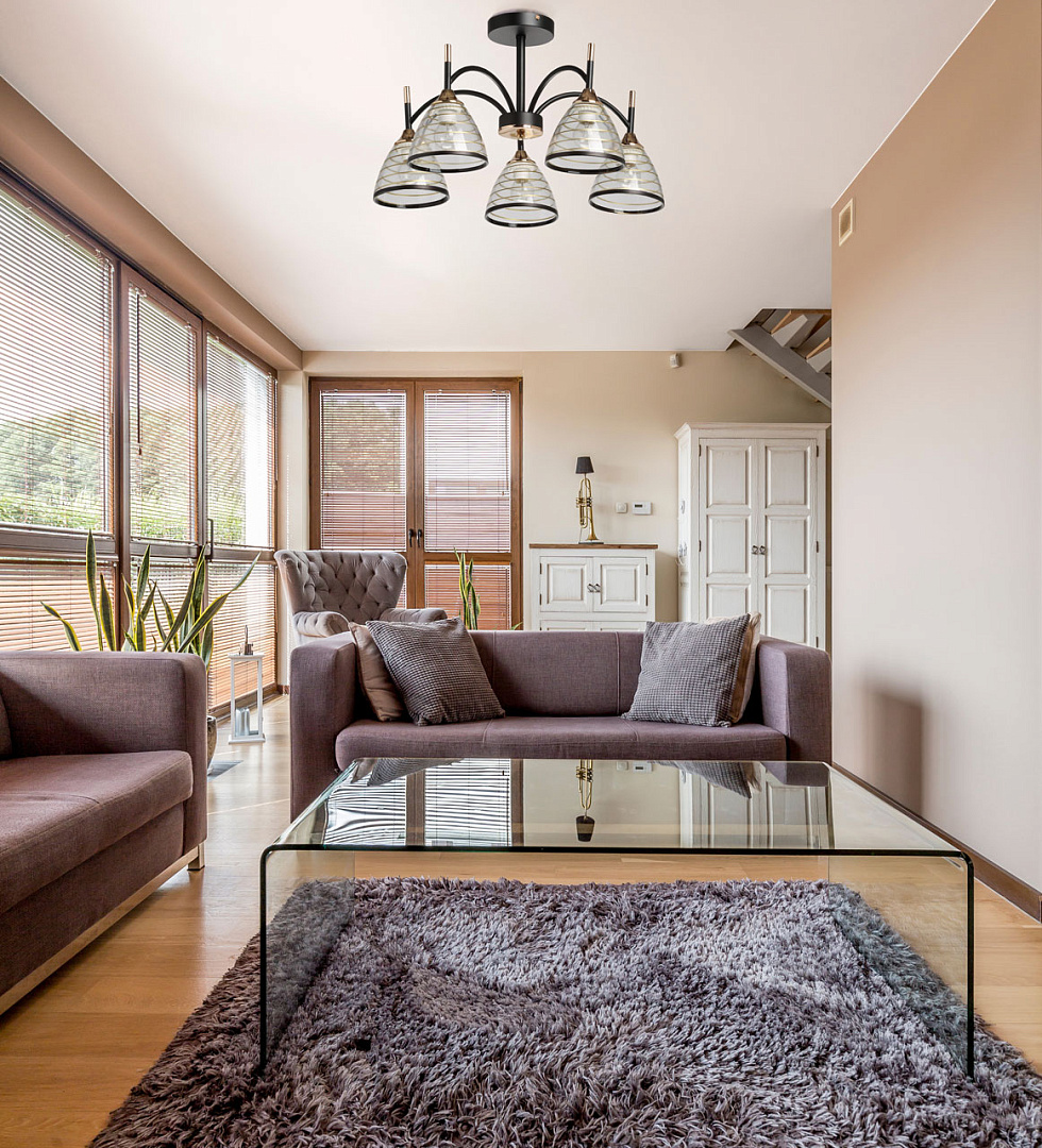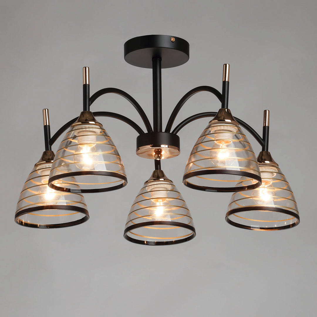Черный цвет основания потолочной люстры подойдет к брутальному интерьеру в стиле лофт. Контрастное сочетание черного и золотого эффектно выделит люстру на потолке. Стеклянные плафоны с линейным рисунком красиво смягчают освещение. Заменяемые источники света удобны в эксплуатации. Компактный размер люстры сохраняет пространство комнаты и подходит для стандартных потолков.