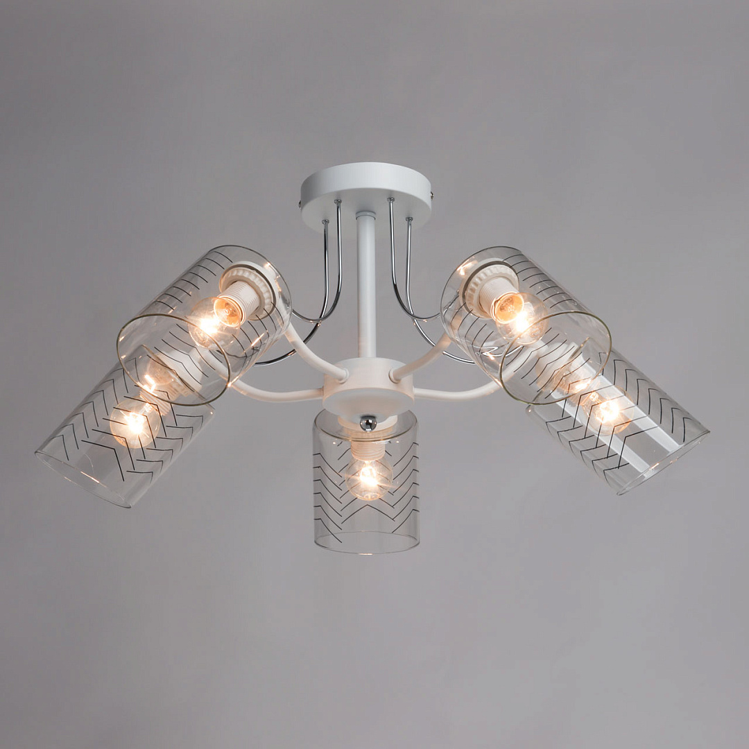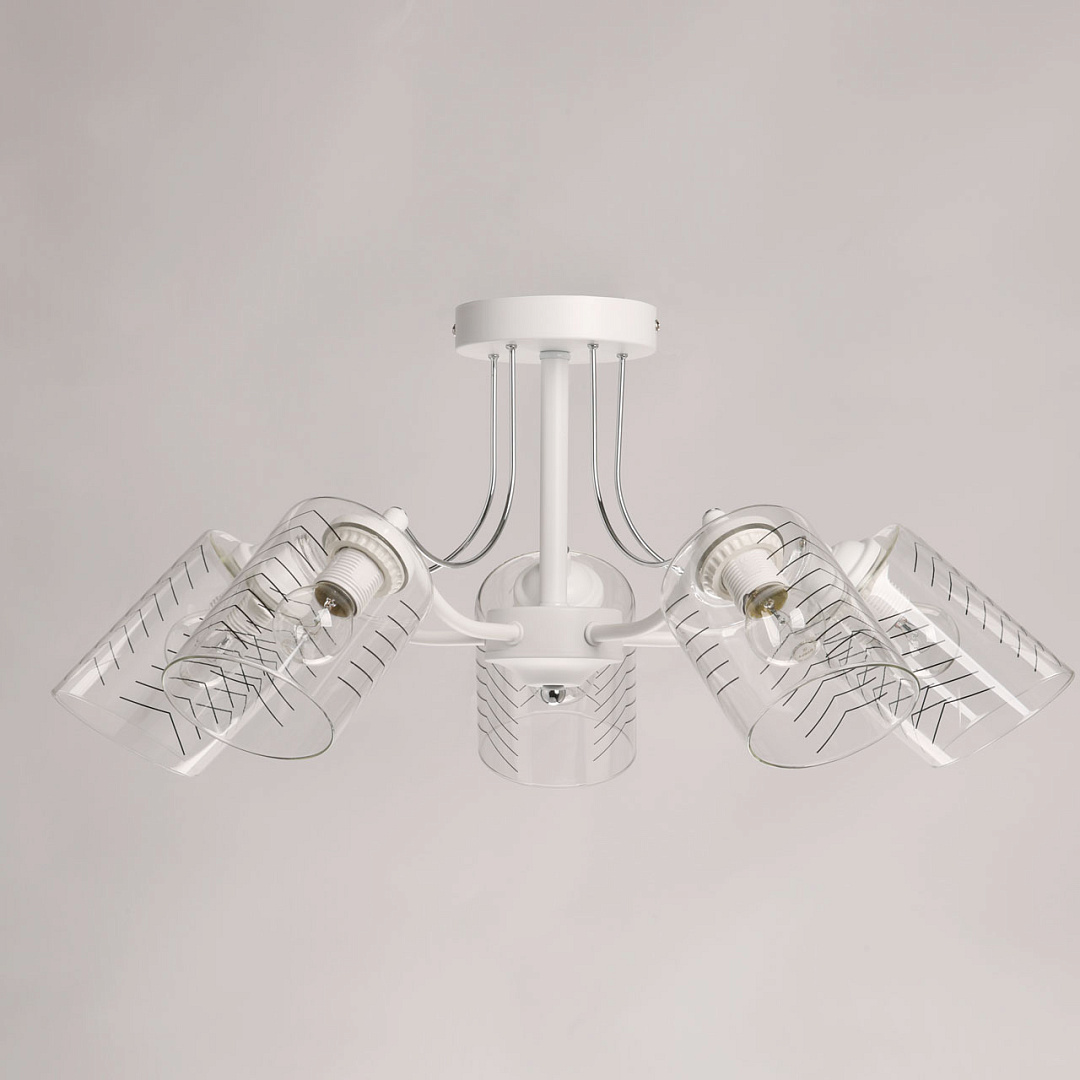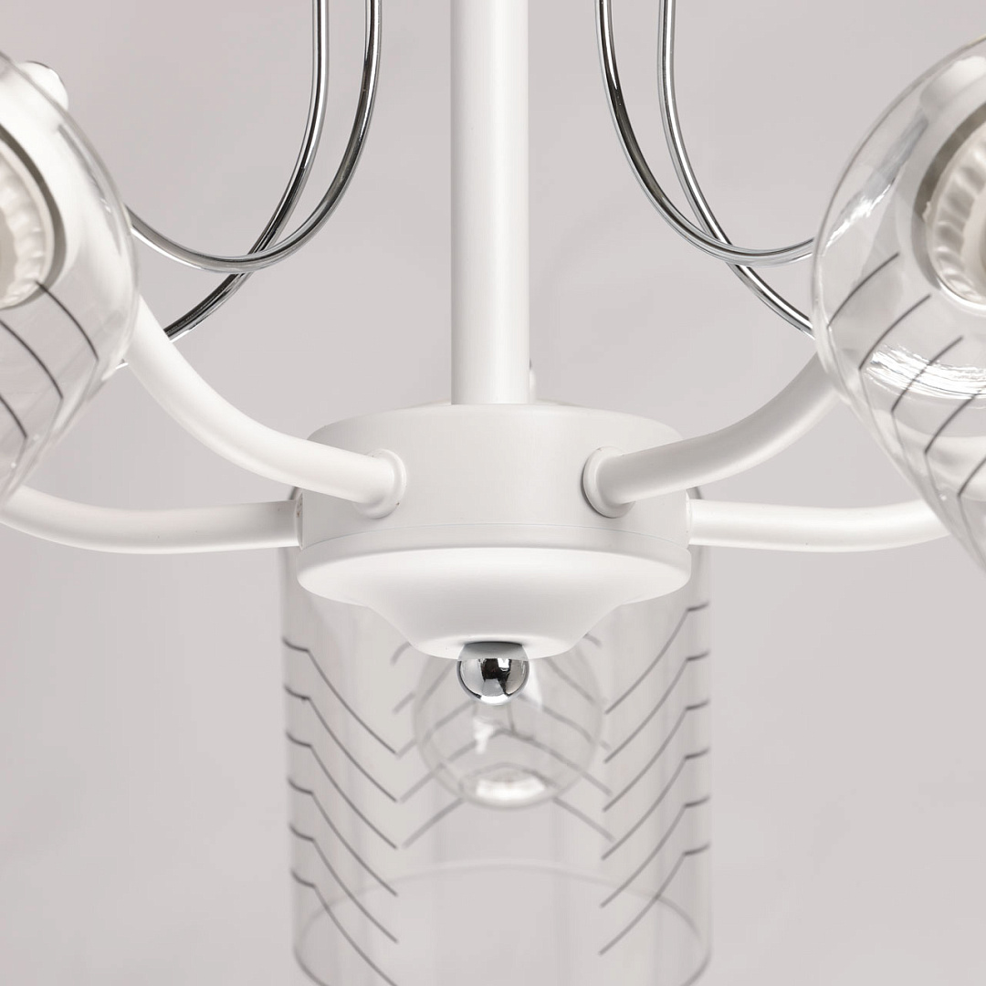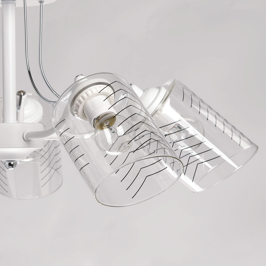 Белый цвет основания потолочной люстры подойдет для любого интерьера. Стеклянные плафоны с геометричным орнаментом красиво смягчают освещение. Расположение плафонов под 45` позволяют хорошо осветить большую площадь. Заменяемые источники света удобны в эксплуатации. Компактный размер люстры сохраняет пространство комнаты и подходит для стандартных потолков.