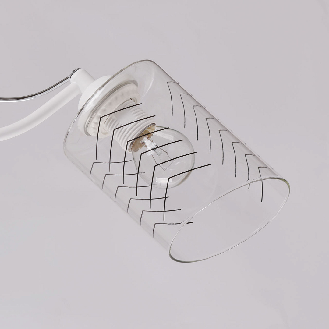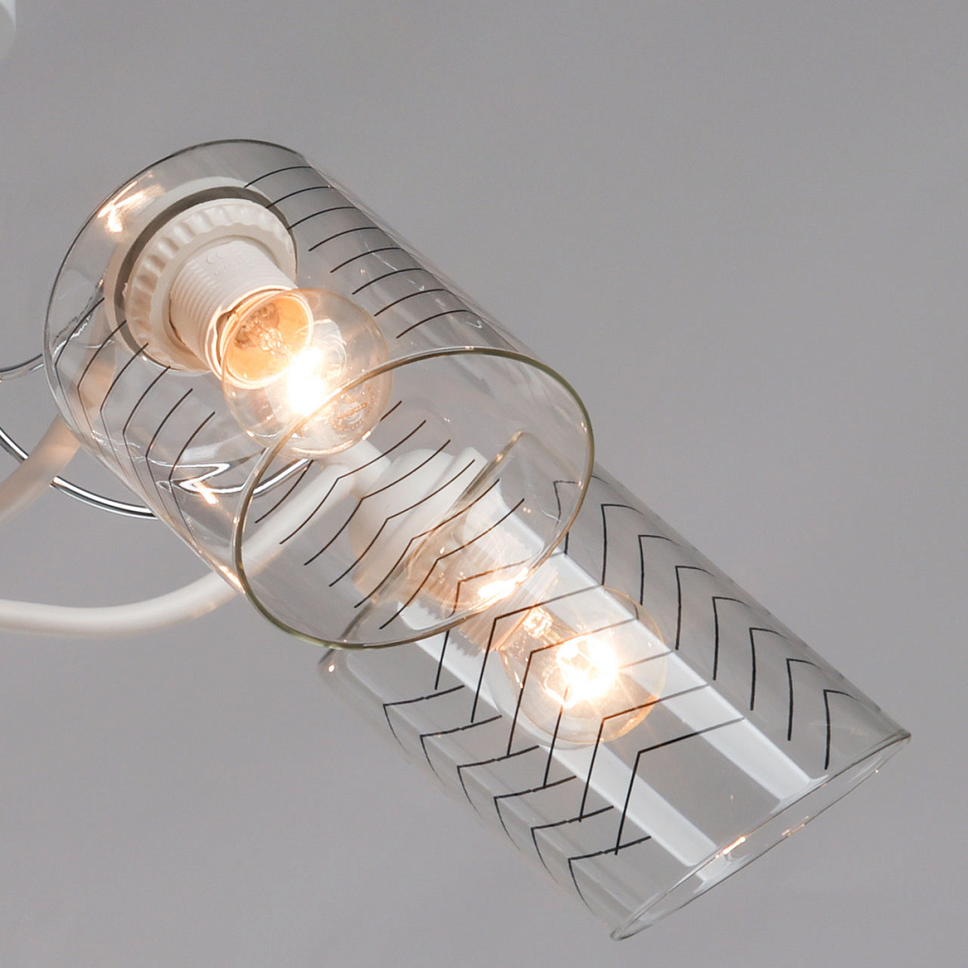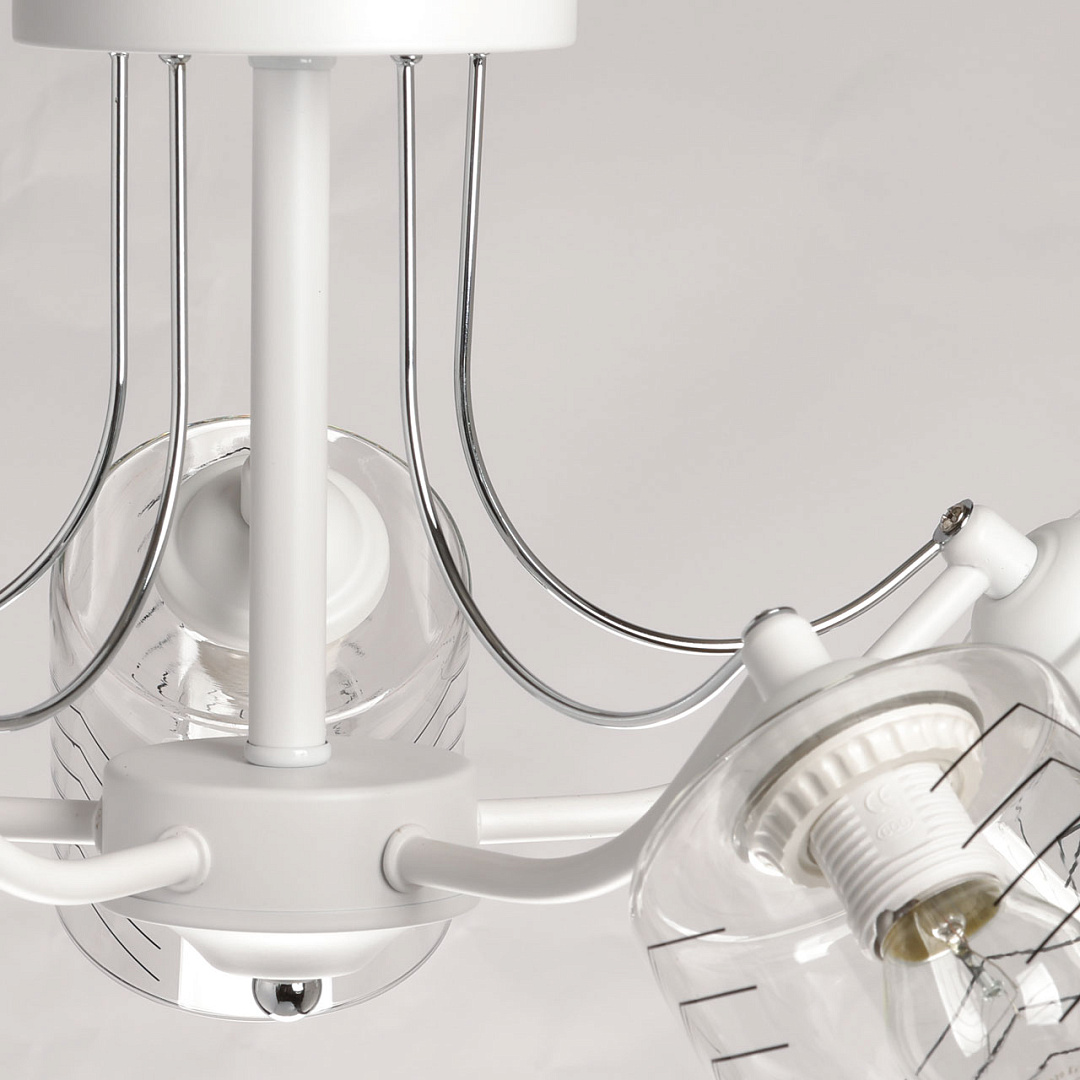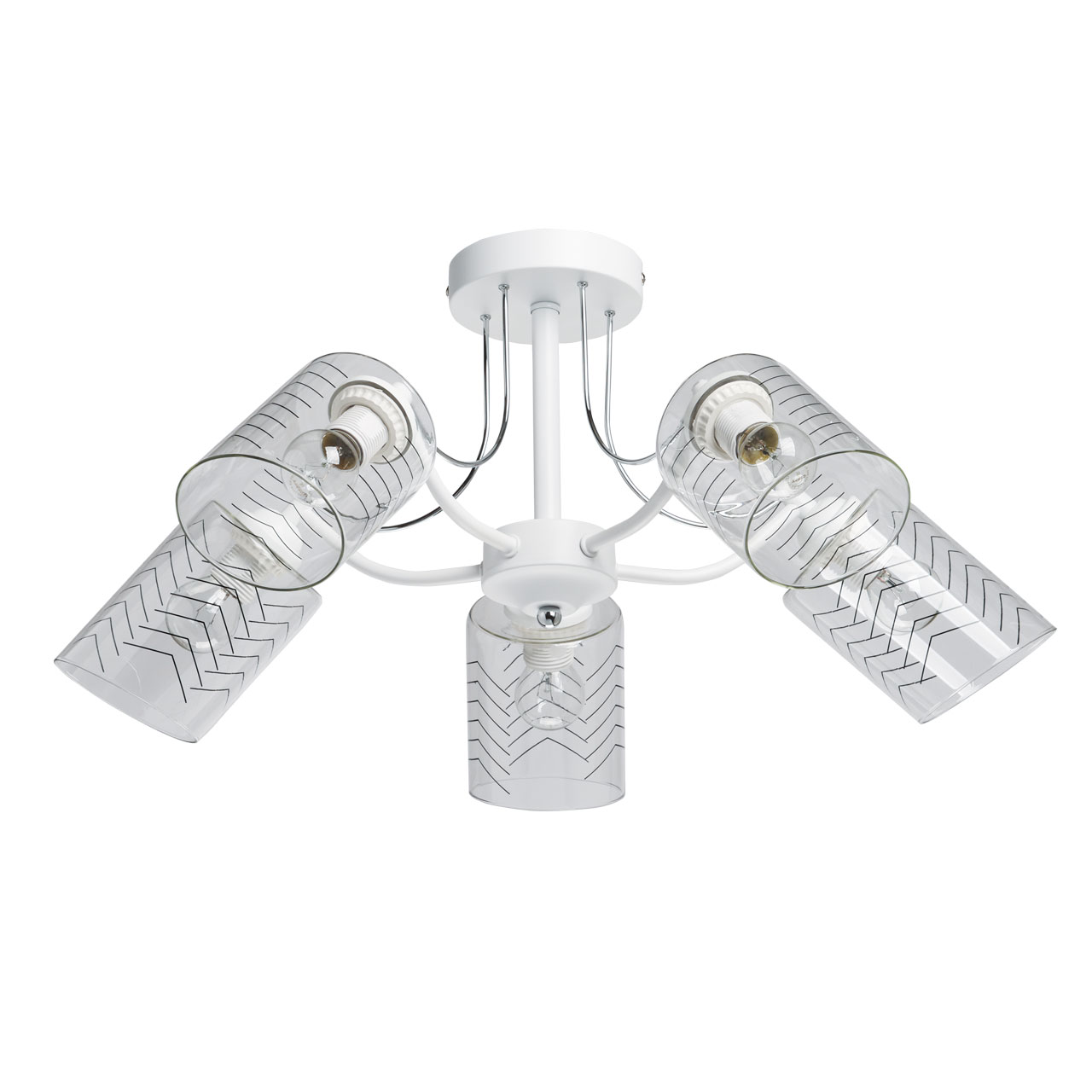 Белый цвет основания потолочной люстры подойдет для любого интерьера. Стеклянные плафоны с геометричным орнаментом красиво смягчают освещение. Расположение плафонов под 45` позволяют хорошо осветить большую площадь. Заменяемые источники света удобны в эксплуатации. Компактный размер люстры сохраняет пространство комнаты и подходит для стандартных потолков.
