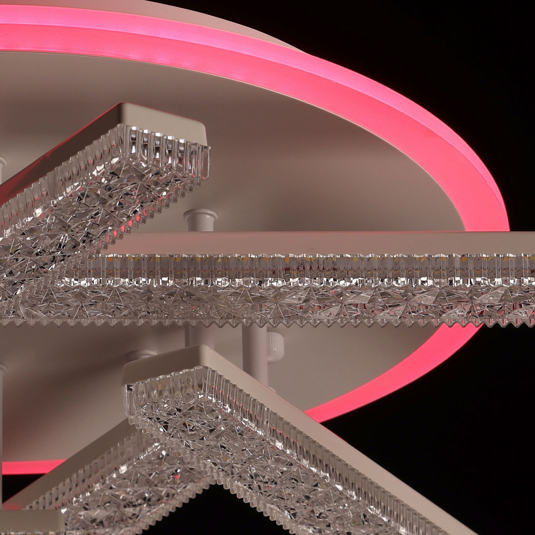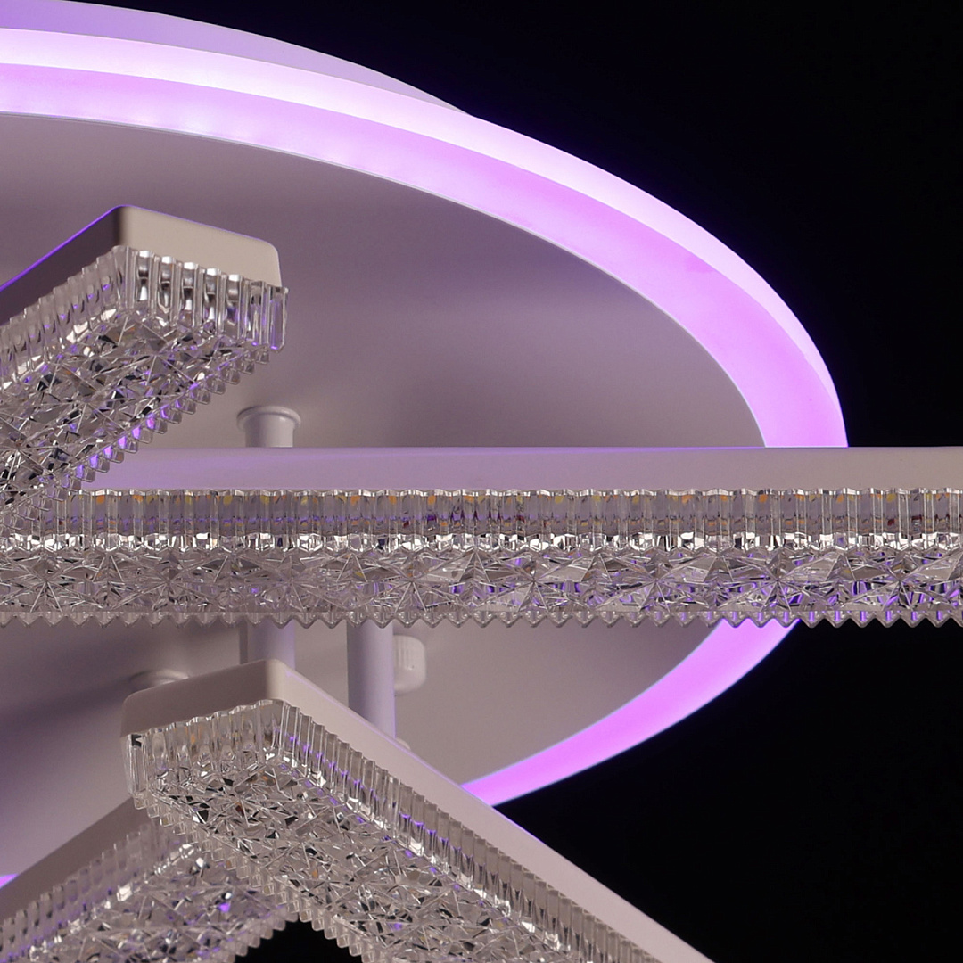Жизнерадостный дизайн потолочной люстры создает приподнятое настроение. Прозрачный фактурный акрил красиво преломляет свет. Плавное диммирование позволяет регулировать интенсивность освещения всего пространства комнаты. Изменение цветовой температуры света от холодного до теплого спектра создает комфортные условия. RGB подсветка формирует атмосферу. Наличие пульта делает удобным управление функциями светильника. Светодиодные источники света безопасны и экономичны. Компактные размеры светильника сохраняют пространство комнаты и подходят для стандартных потолков.
