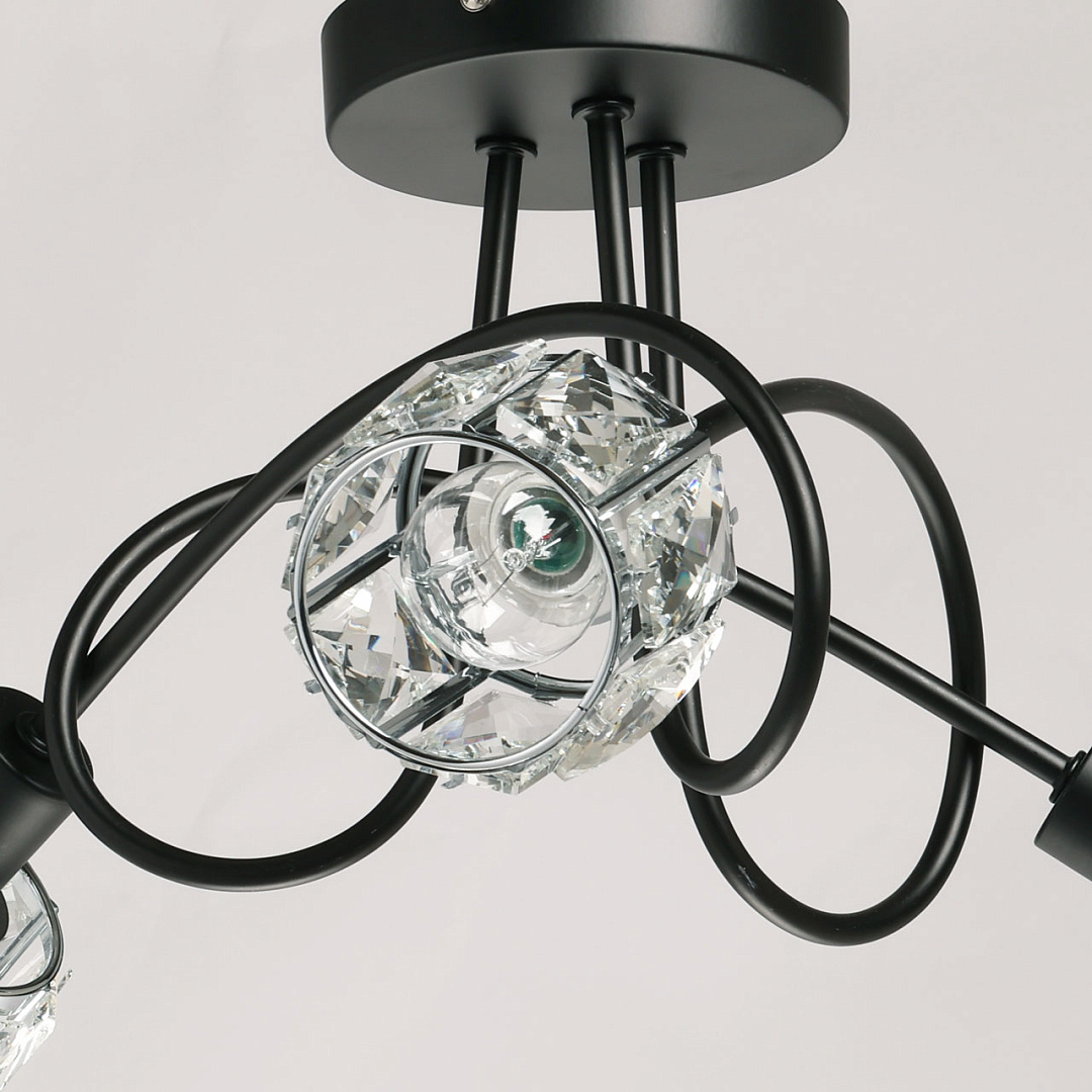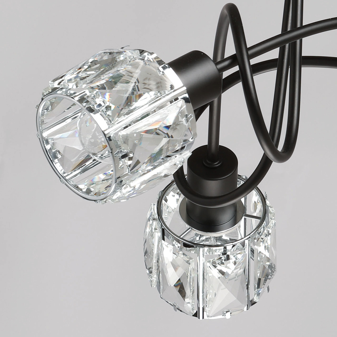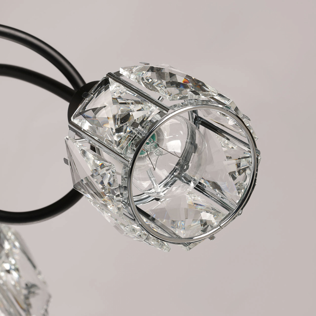 Минималистичный дизайн подходит для современных интерьеров. Черный цвет основания прекрасно подойдет для брутальных интерьеров в стиле лофт. Светильник выполнен в стиле эклектики и модно соединяет минимализм в дизайне, черный цвет основания и классический хрусталь. Оригинальное переплетение рожков привлекает к себе внимание. Хрусталь с острыми гранями создает красивый свет. Заменяемые источники света удобны в эксплуатации. Компактный размер потолочной люстры позволяет сохранить пространство при стандартных потолках.