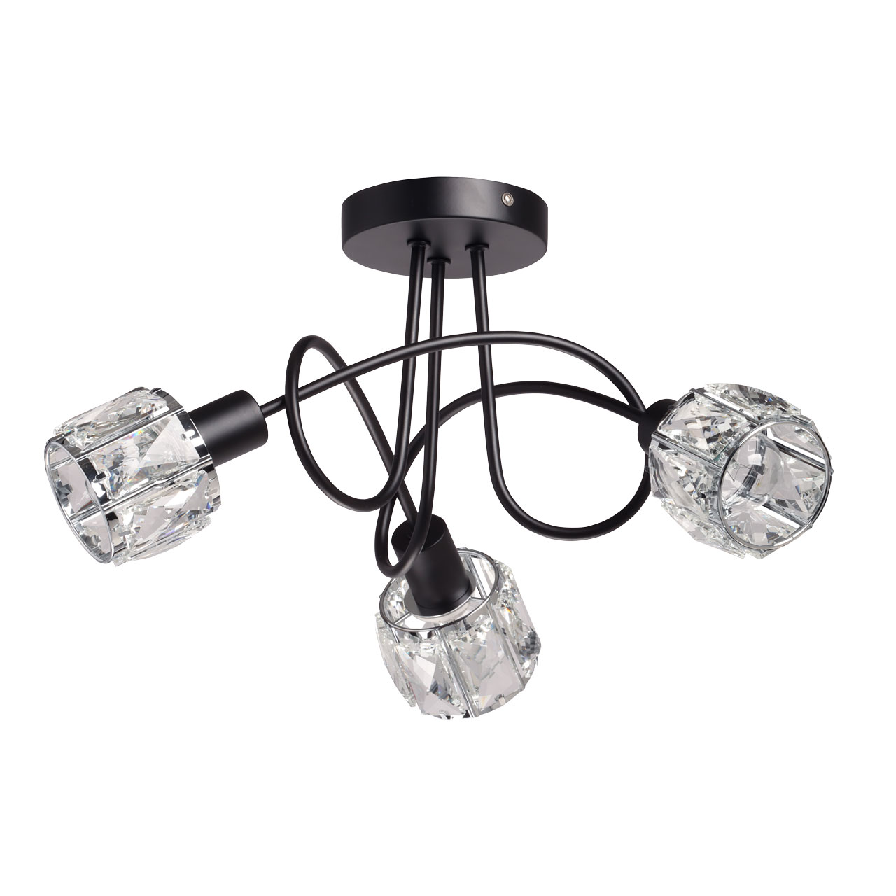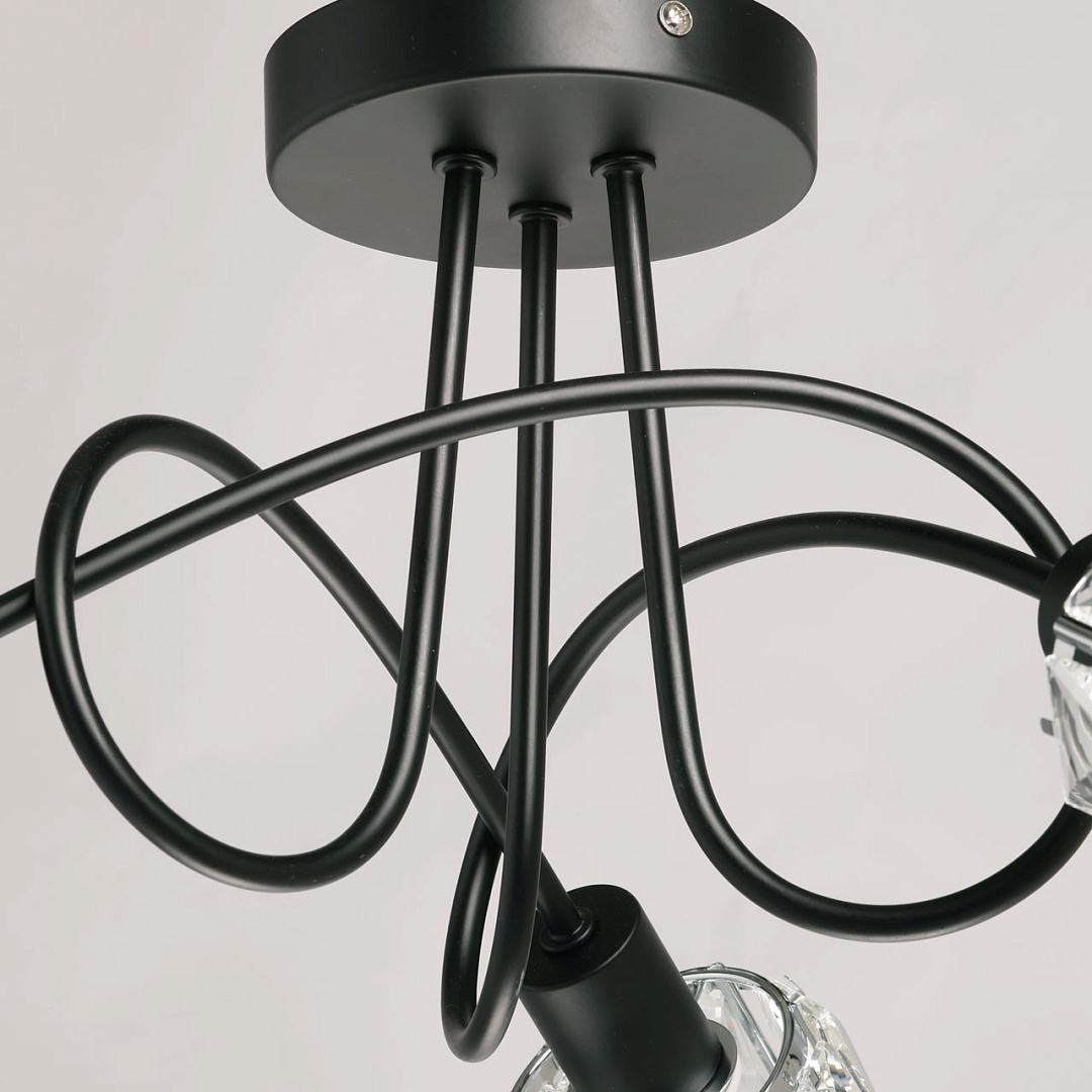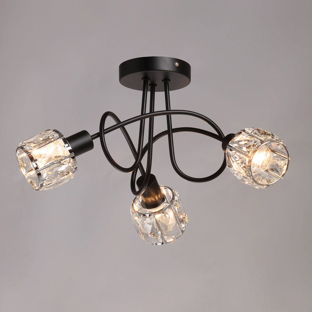 Минималистичный дизайн подходит для современных интерьеров. Черный цвет основания прекрасно подойдет для брутальных интерьеров в стиле лофт. Светильник выполнен в стиле эклектики и модно соединяет минимализм в дизайне, черный цвет основания и классический хрусталь. Оригинальное переплетение рожков привлекает к себе внимание. Хрусталь с острыми гранями создает красивый свет. Заменяемые источники света удобны в эксплуатации. Компактный размер потолочной люстры позволяет сохранить пространство при стандартных потолках.