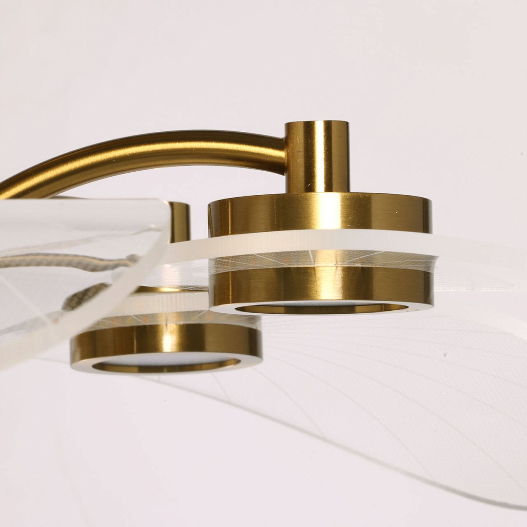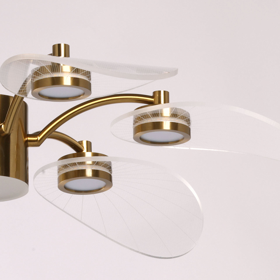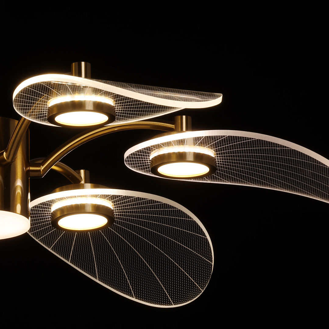 Цвет латуни прекрасно сочетается с современными формами и материалами. Светодиодные источники света закрыты прозрачным многогранным акрилом, создающим эффект красивой игры бликов света. Многорежимность освещения от 3000К до 6000К позволяет подобрать комфортную температуру света. Диммирование поможет выбрать необходимую интенсивность светового потока, а ПДУ обеспечит удобную эксплуатацию люстры. Качественные светодиоды экономичны и безопасны.