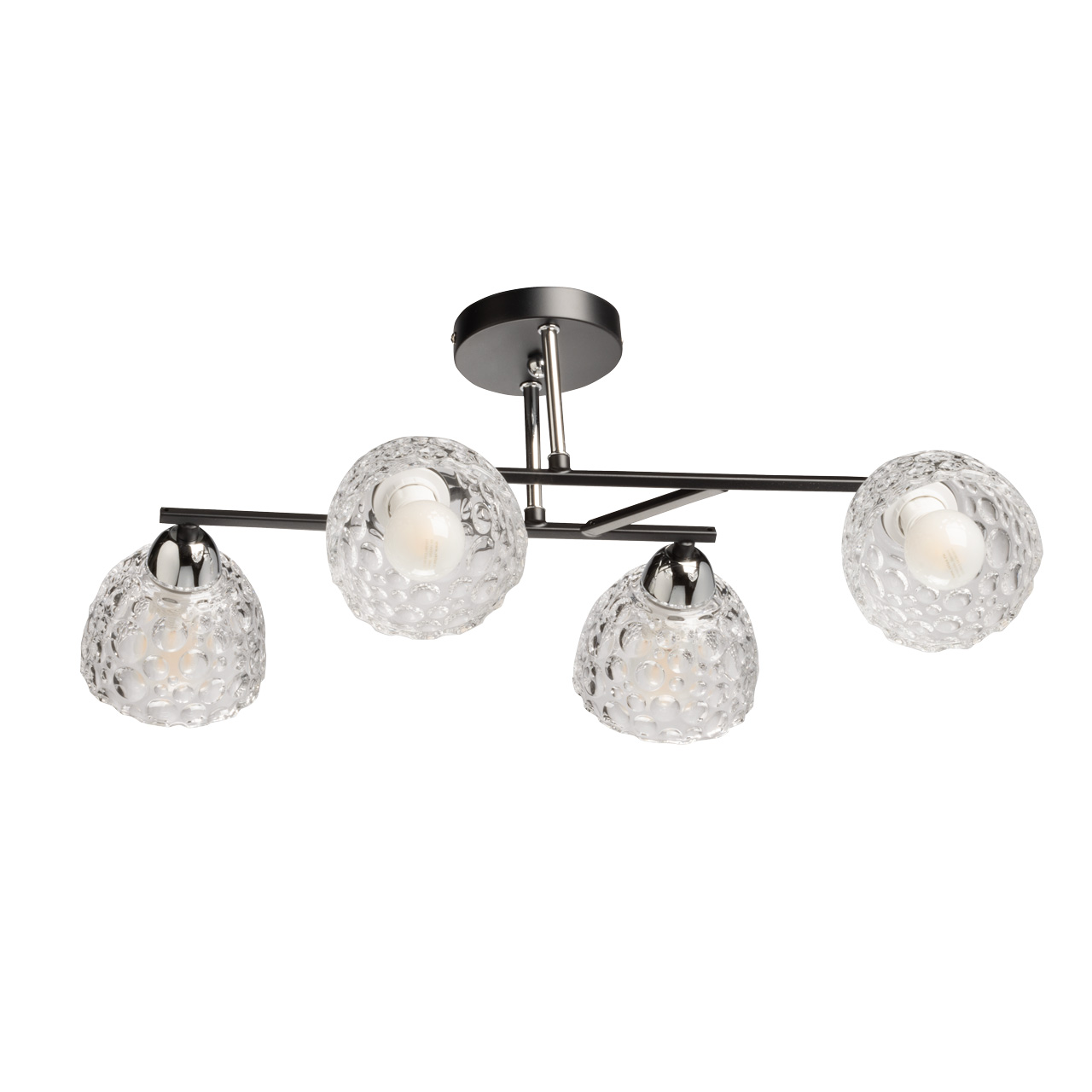 Основание светильника выполнено в форме квадрата из прочного металла, окрашенного в глубокий черный цвет. Этот цвет не только придает изделию строгость и элегантность, но и делает его универсальным элементом, который легко впишется в различные стили интерьера. Плафоны светильника выполнены из прозрачного стекла, отлитого в уникальную форму с текстурным рисунком. Этот интересный дизайн не только добавляет визуального интереса, но и создает эффект игры света и тени, наполняя комнату мягким и уютным светом. Прозрачное стекло позволяет свету свободно проходить, а пузырьковая текстура придает плафонам оригинальность и шарм.Светильник оснащен четырьмя плафонами на шарнирах, что позволяет менять направление света в зависимости от ваших потребностей. Это особенно удобно для создания локального освещения, когда необходимо выделить определенные зоны в комнате, например, рабочую область или угол для чтения. Возможность регулировки направления света делает этот светильник универсальным инструментом для освещения.Цоколь E14 позволяет использовать лампы различной мощности, что дает возможность адаптировать яркость освещения под конкретные задачи. Такой светильник отлично подходит для освещения комнат площадью до 8 кв. метров, что делает его идеальным выбором для небольших помещений.Светильник из коллекции Торес прекрасно вписывается в различные стили интерьера. Его минималистичный дизайн идеально подходит для современных интерьеров в стиле минимализм, где важна простота и функциональность. В то же время, черный металл и текстура стекла делают его отличным дополнением к интерьеру в стиле лофт, где преобладают индустриальные элементы и открытые пространства.