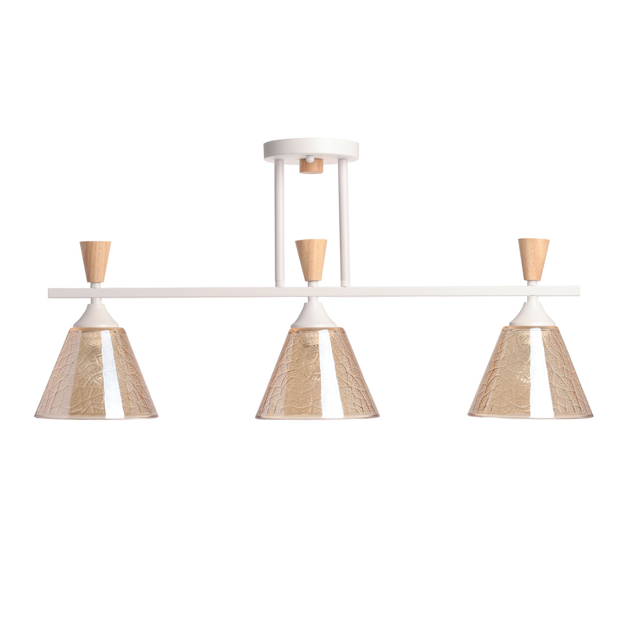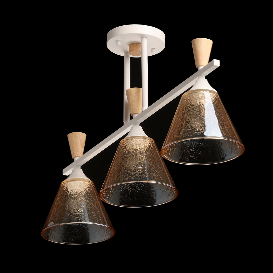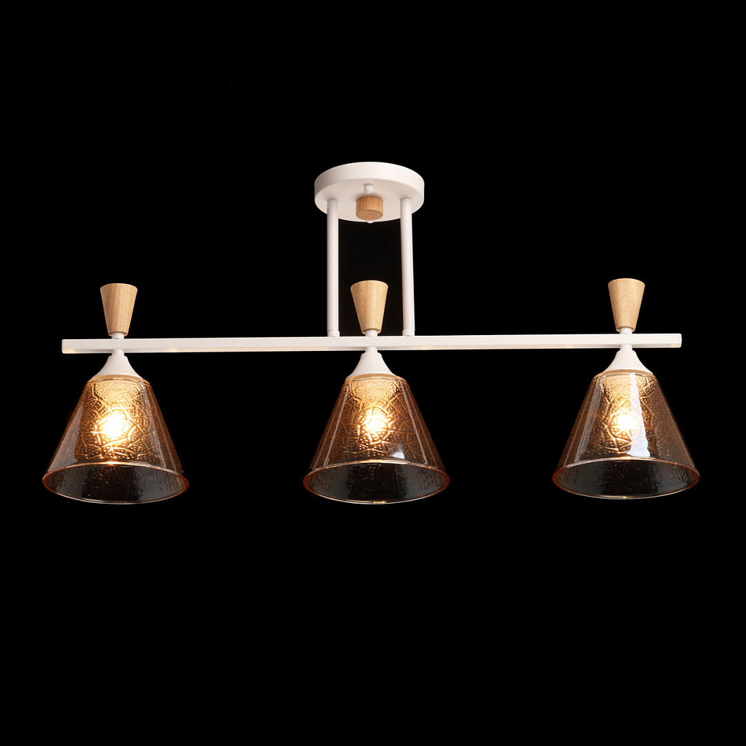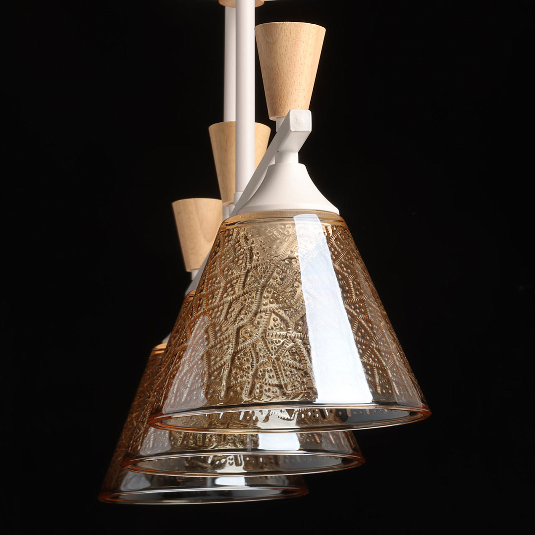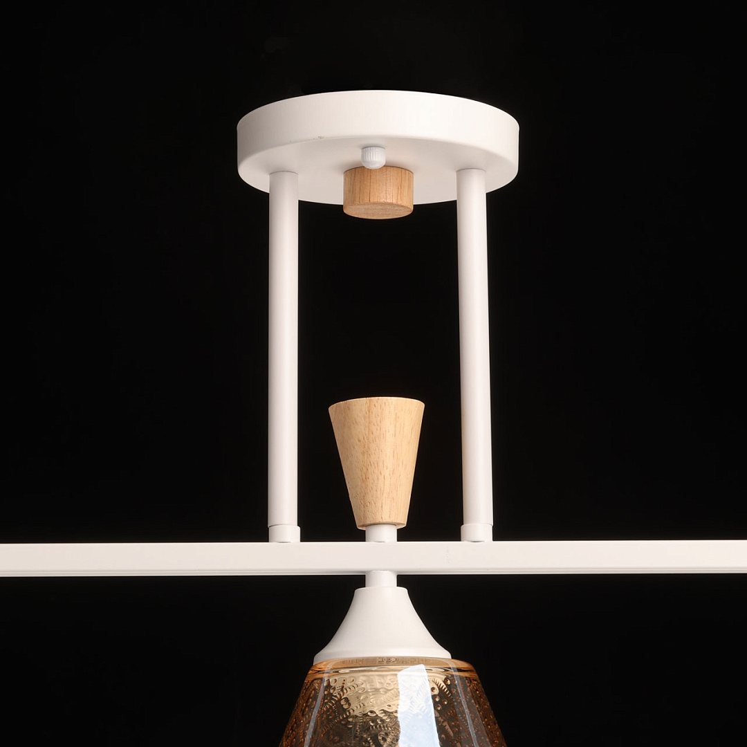 Универсальный белый цвет потолочной люстры подходит к любому интерьеру. Изящная фактура стеклянных плафонов в сочетании с насыщенным коньячным цветом создают красивую игру света. Декор из натурального дерева в тренде природности. Заменяемые источники света удобны в эксплуатации. Компактный размер потолочной люстры сохранит пространство комнаты при стандартных потолках.