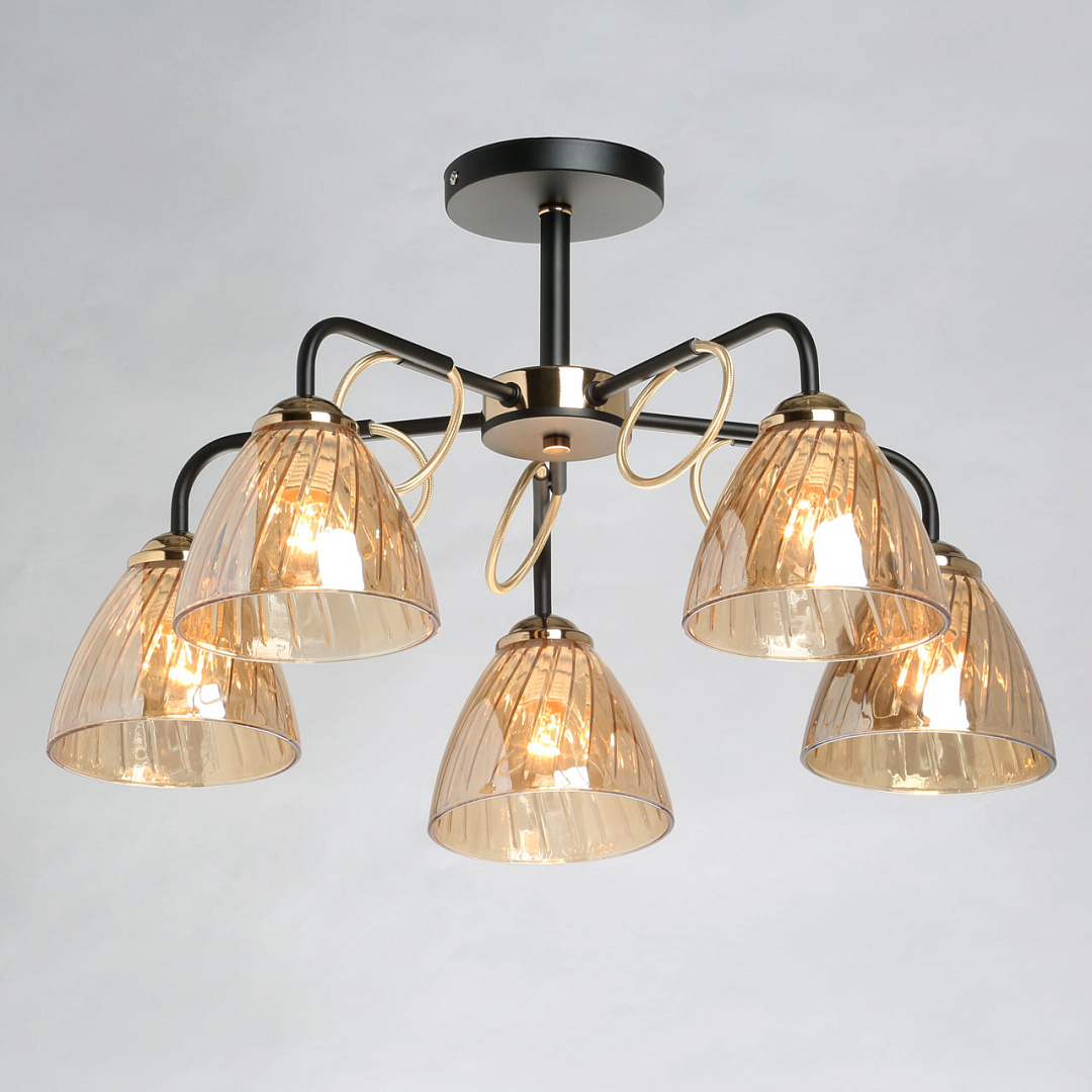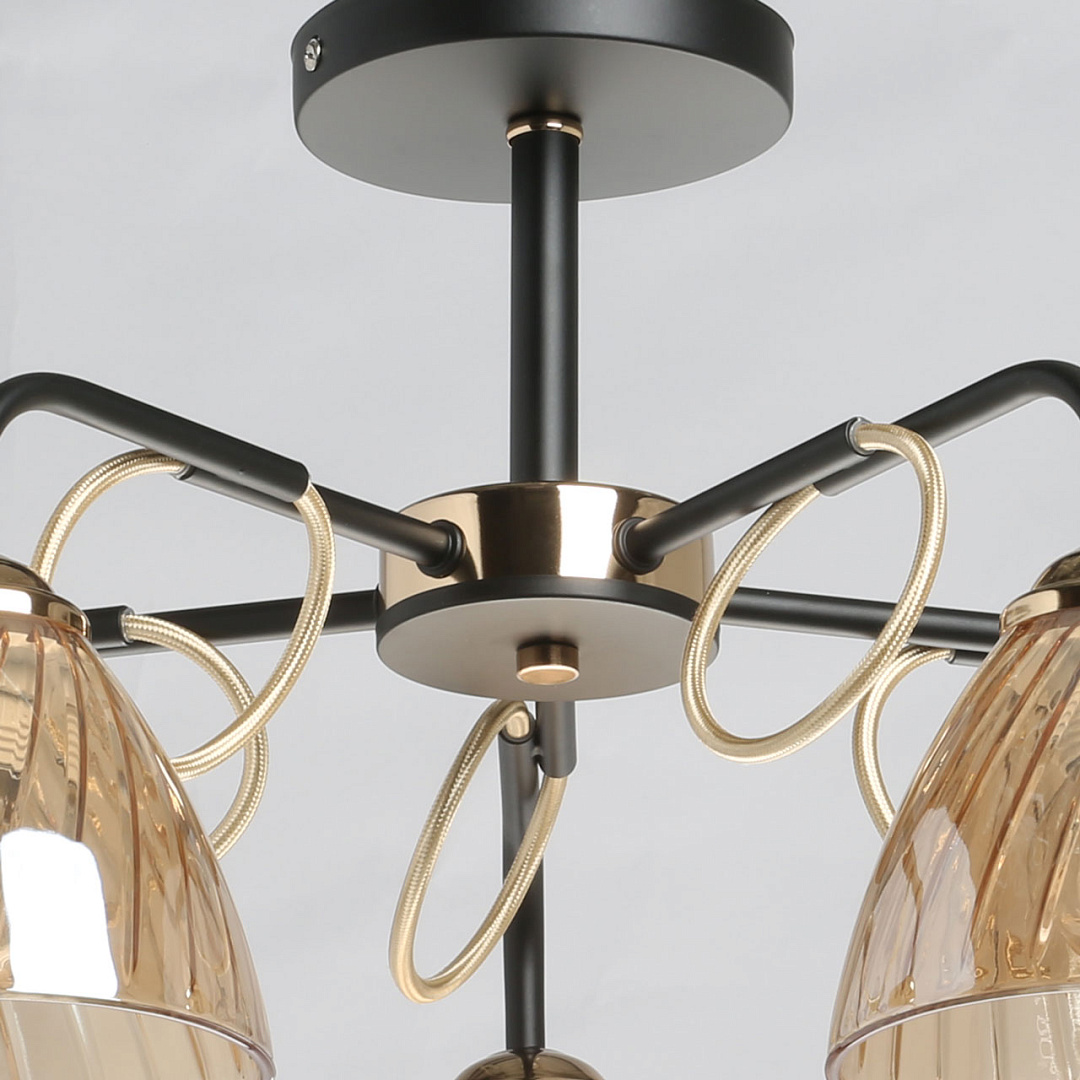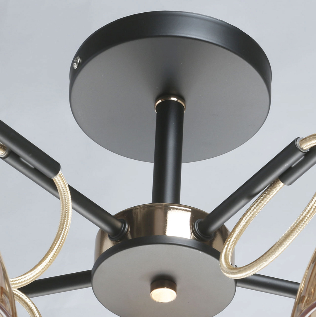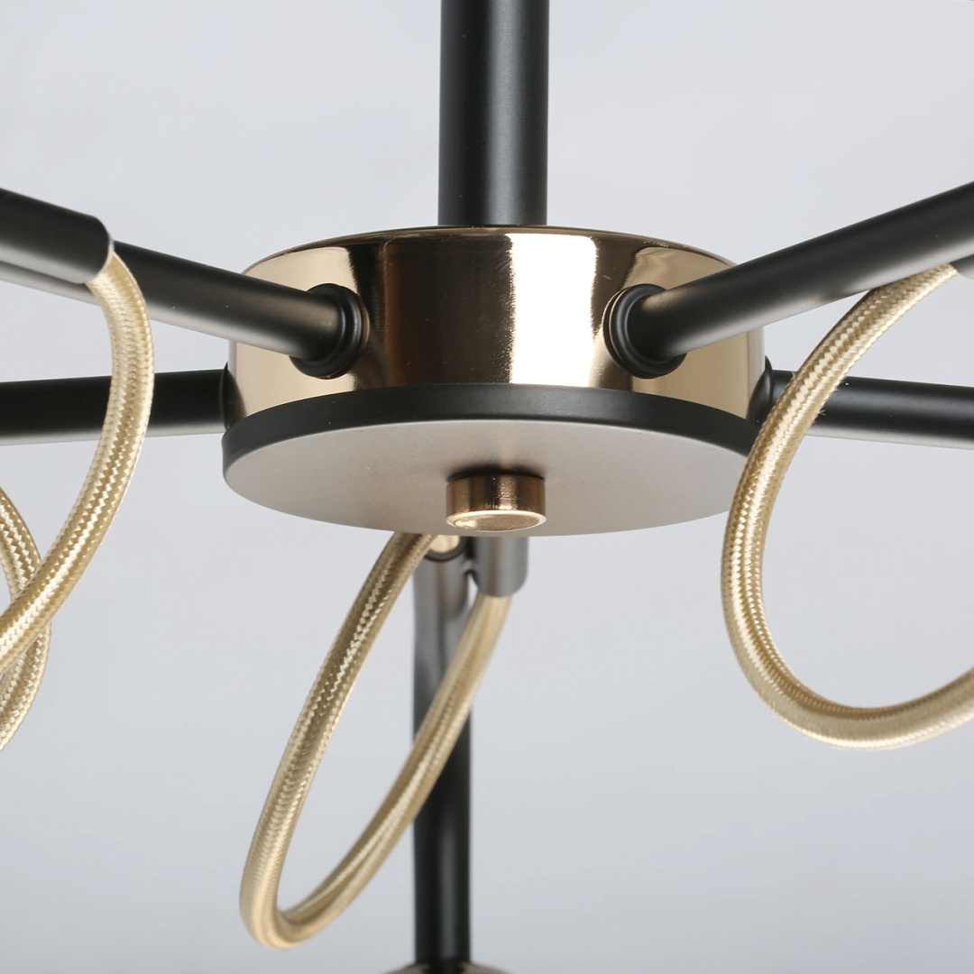 Модная и современная люстра с контрастным сочетанием черного и золотого цвета основания.Оригинальности люстре придает декор из проводов.Направленные вниз плафоны создают много света.Плафоны цвета шампань смягчают свет и делают его комфортным