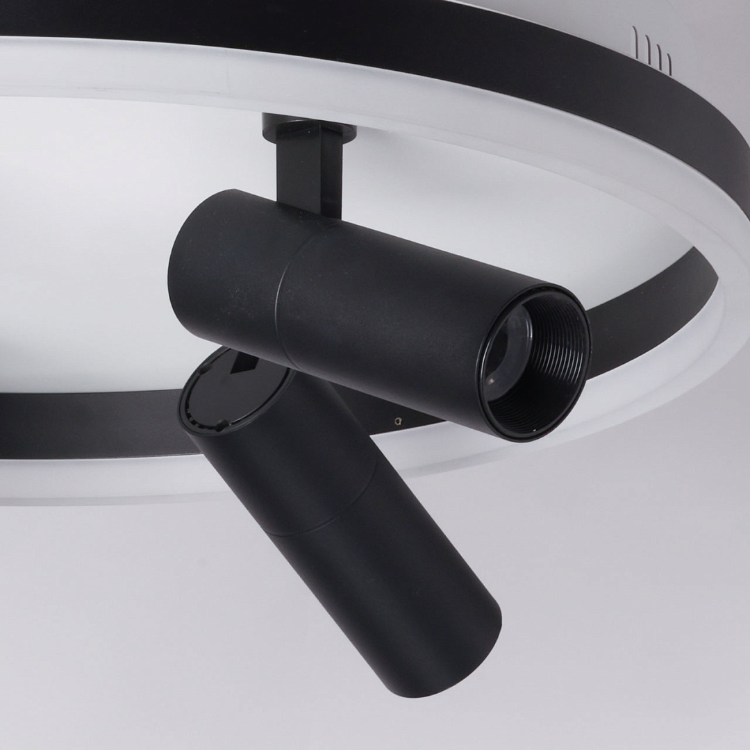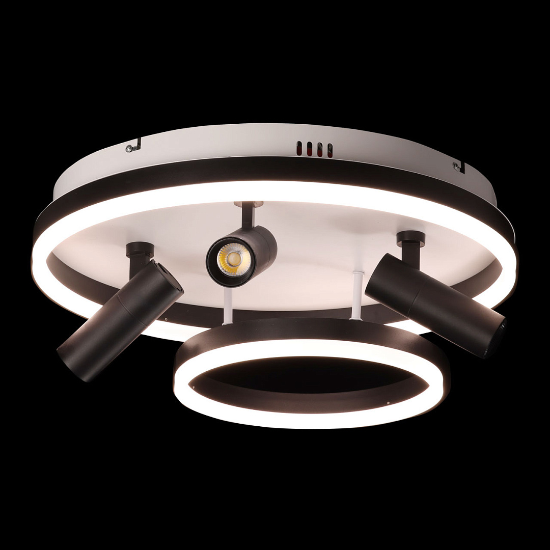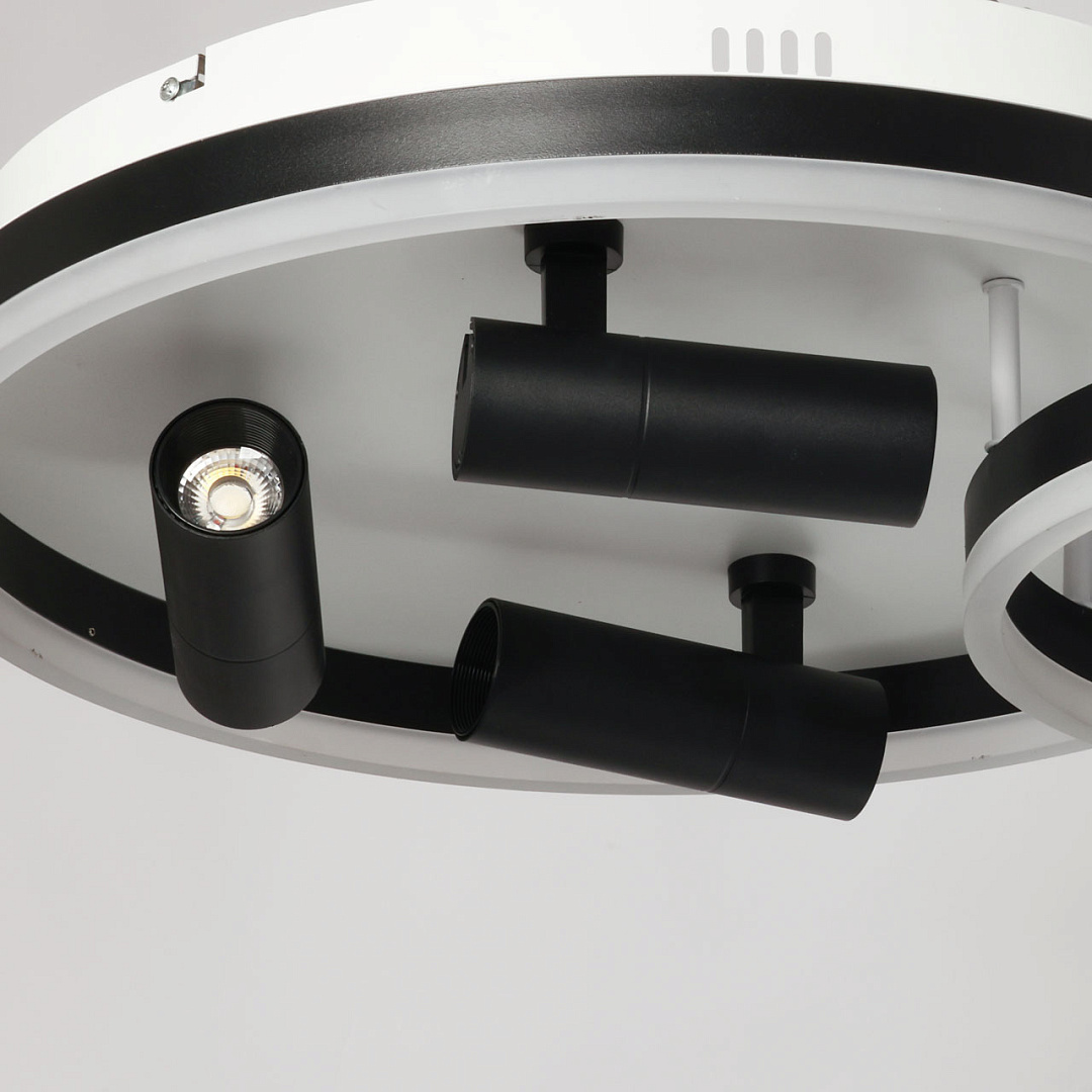Глубокий черный цвет плафонов в сочетании с белым цветом основания добавляет светильнику концептуальности. Матовый акрил мягко рассеивает свет, создавая комфортное освещение. Многорежимность освещения от 3000К до 6500К позволяет подобрать комфортную температуру света. Качественные светодиоды экономичны и безопасны. Поворотные споты позволяют направлять световой поток в нужную сторону, что создает акцентное освещение.  Компактный размер потолочной люстры подойдет к интерьерам со стандартным потолком. Наличие ПДУ удобно в эксплуатации.