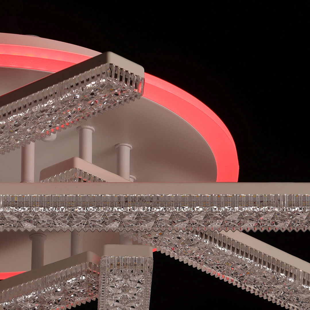 Жизнерадостный дизайн потолочной люстры создает приподнятое настроение. Прозрачный фактурный акрил красиво преломляет свет. Плавное диммирование позволяет регулировать интенсивность освещения всего пространства комнаты. Изменение цветовой температуры света от холодного до теплого спектра создает комфортные условия. RGB подсветка формирует атмосферу. Наличие пульта делает удобным управление функциями светильника. Светодиодные источники света безопасны и экономичны. Компактные размеры светильника сохраняют пространство комнаты и подходят для стандартных потолков.