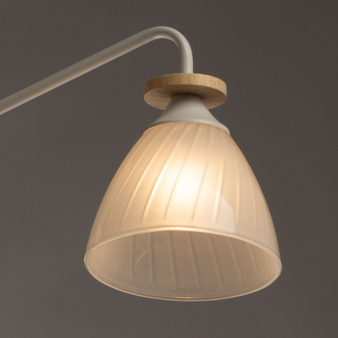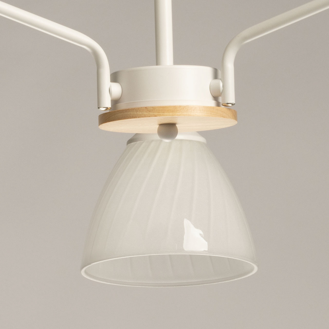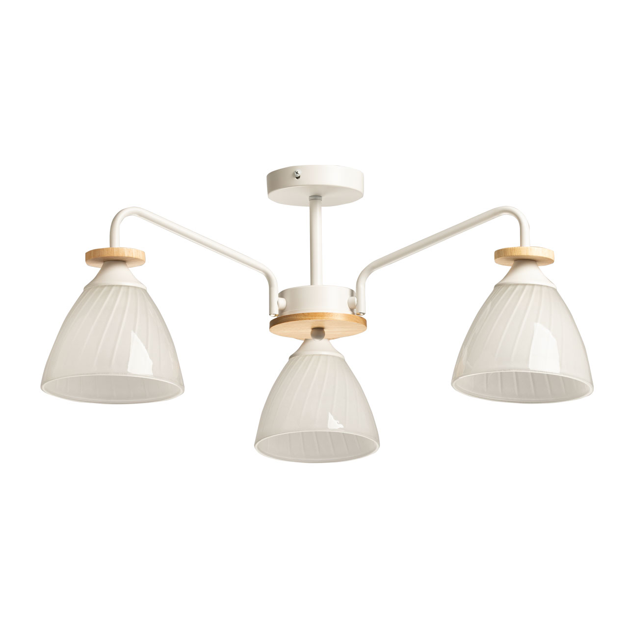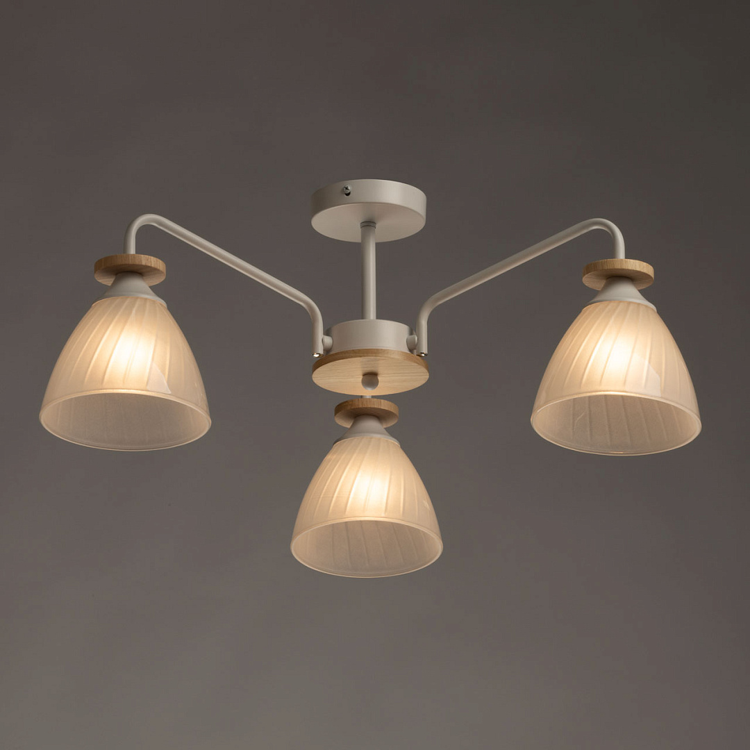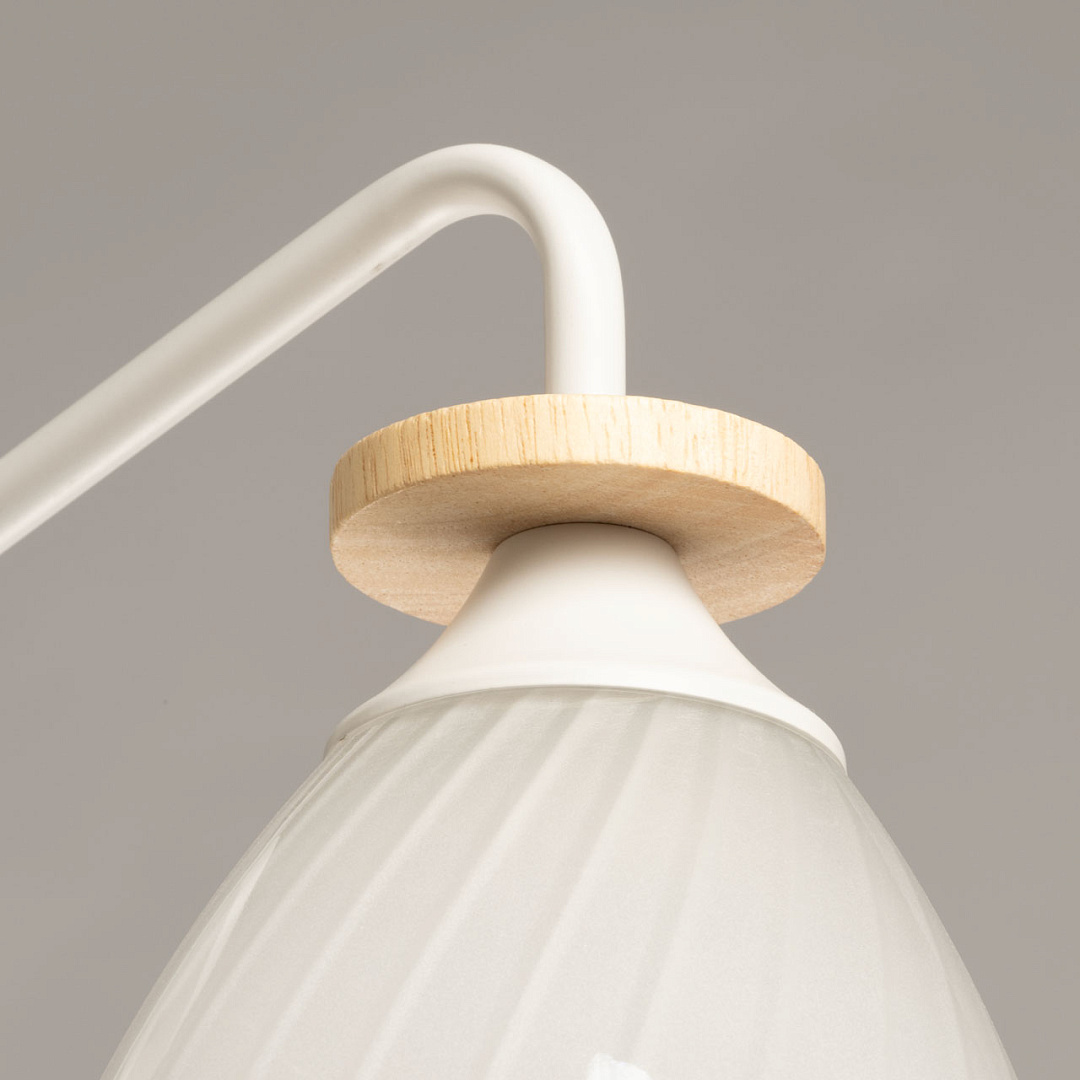 Благодаря простому и универсальному дизайну, эта люстра может быть использована в различных типах интерьеров, от современных до классических.А белый цвет придает особую утонченность и элегантность. Особый шарм создают белые стеклянные плафоны с лаконичным орнаментом, направленные вниз. Натуральности и теплоты в интерьер добавляют декоративные элементы из натурального дерева. Компактный размер люстры прекрасно подходит в интерьеры со стандартным потолком. Заменяемые источники света удобны в эксплуатации.