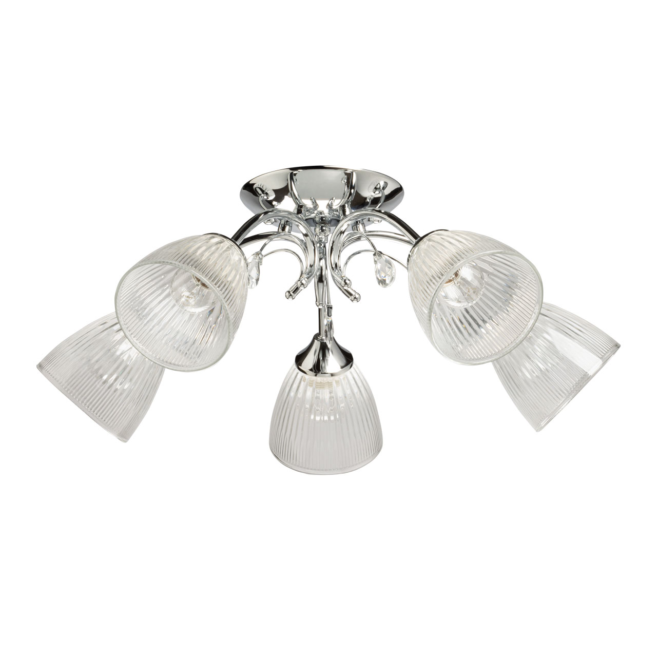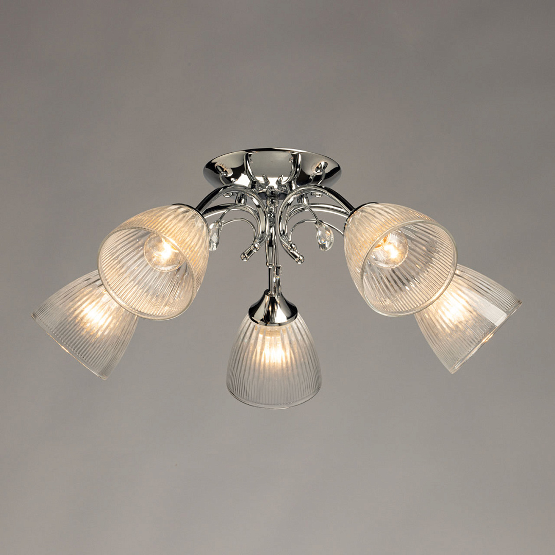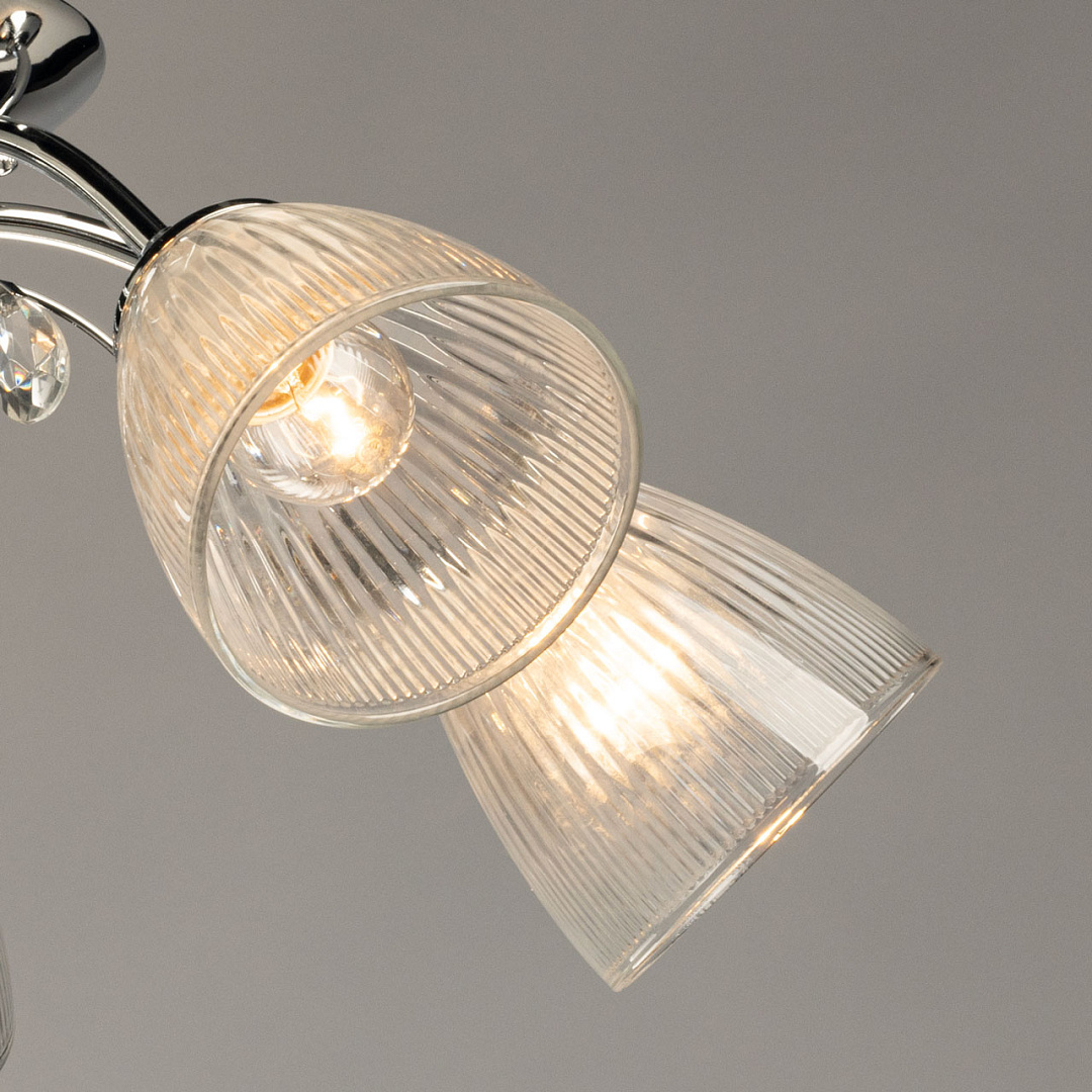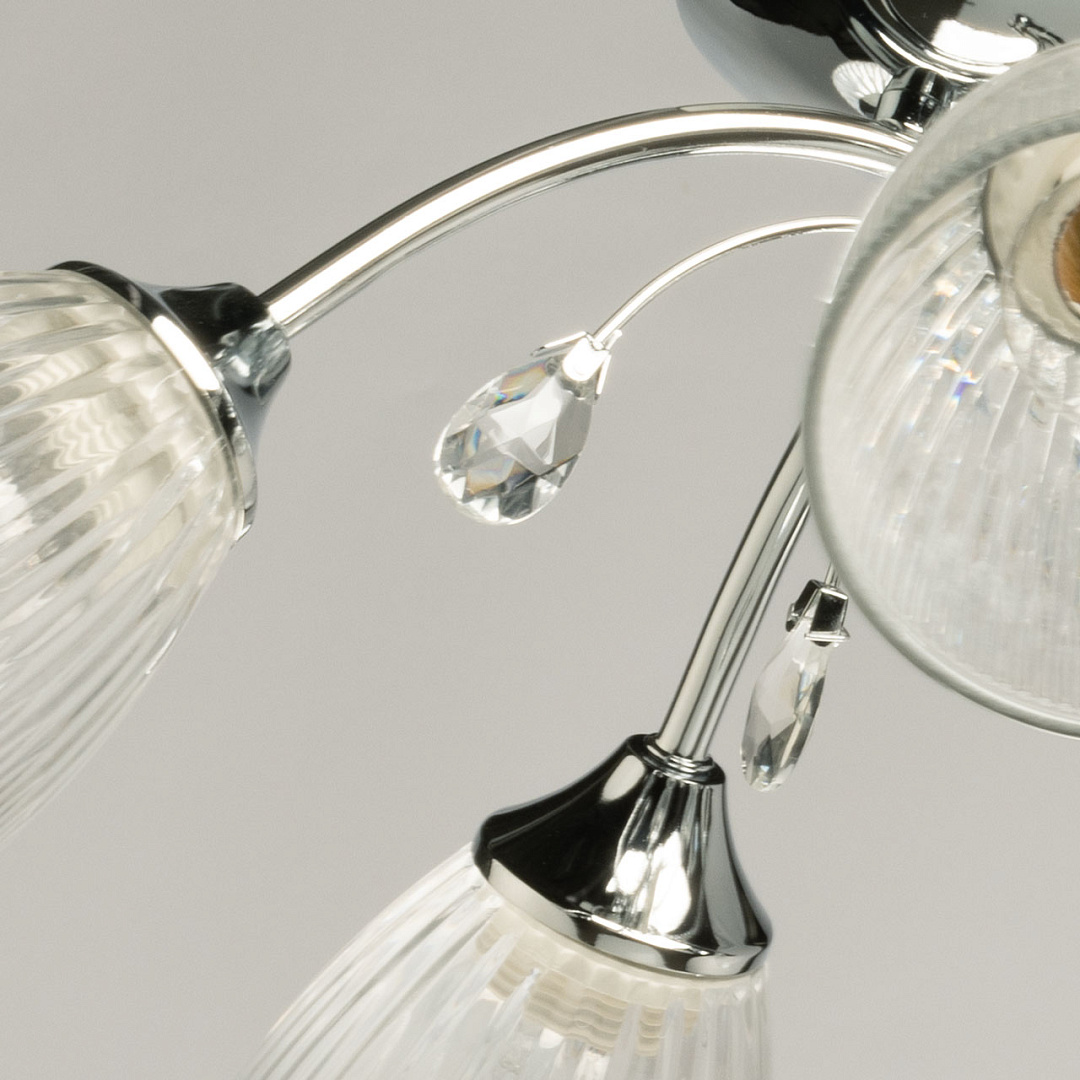 Лаконичный светильник для современных интерьеров. Цвет блестящего хрома добавляет потолочной люстре декоративности. Стеклянные плафоны с линейной фактурой мягко направляют световой поток вниз. Компактная высота модели идеальна для стандартных потолков. Заменяемые источники света удобны в эксплуатации.
