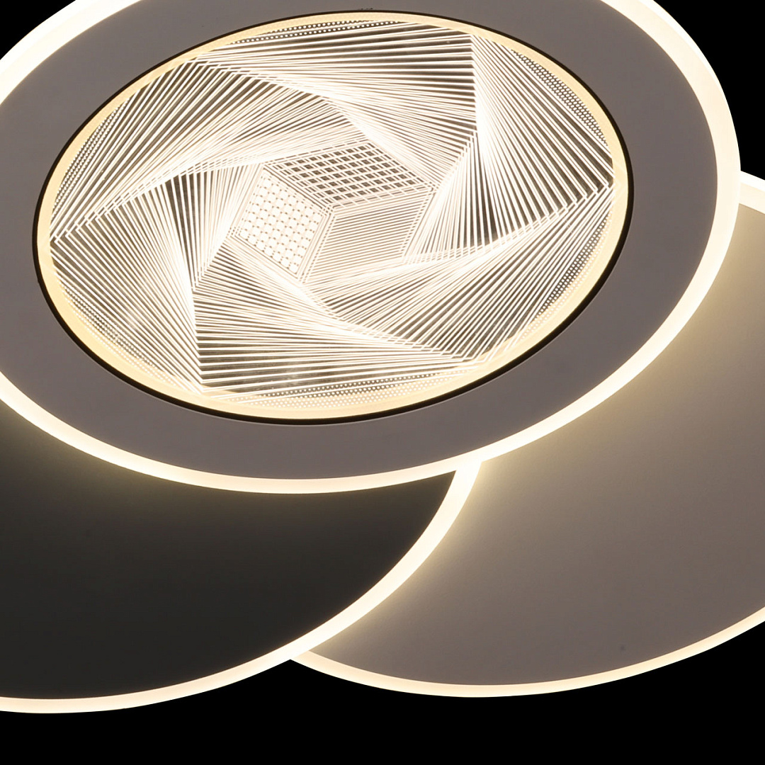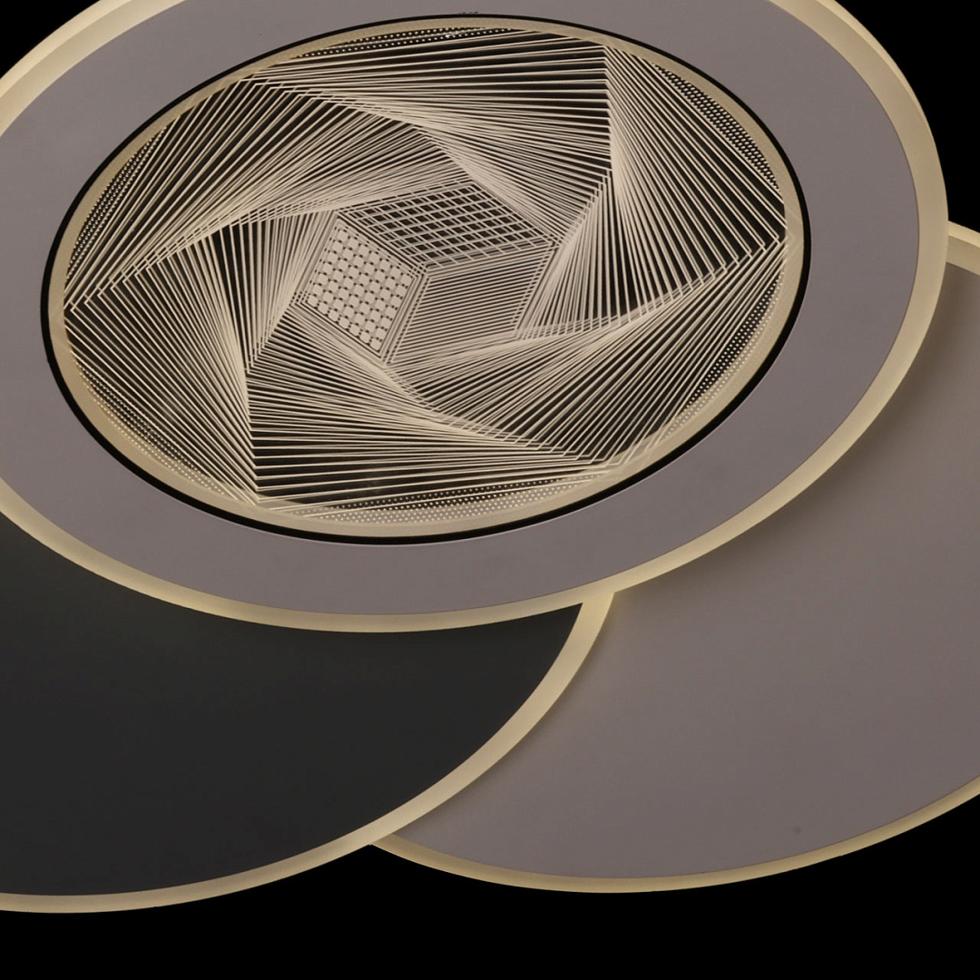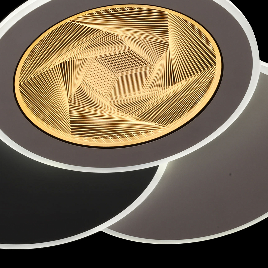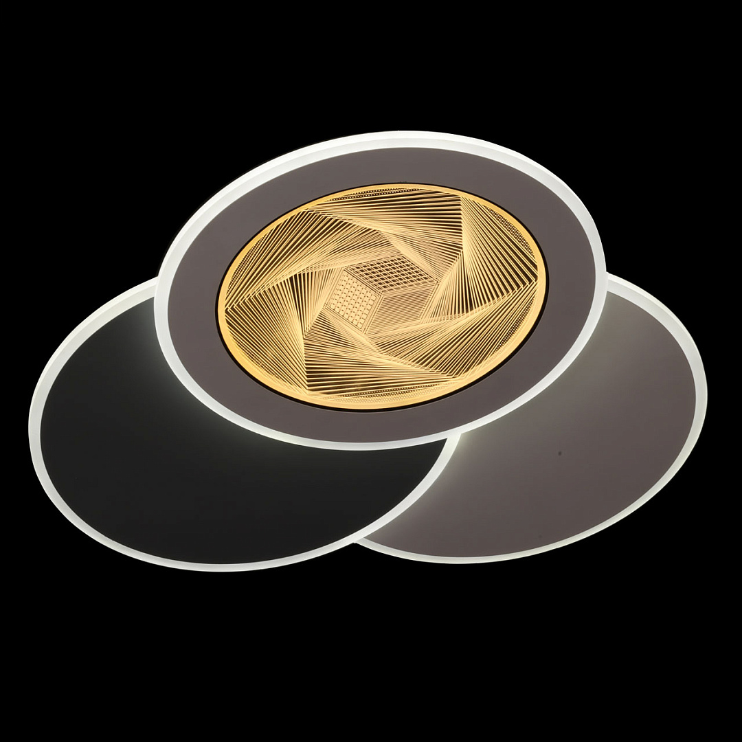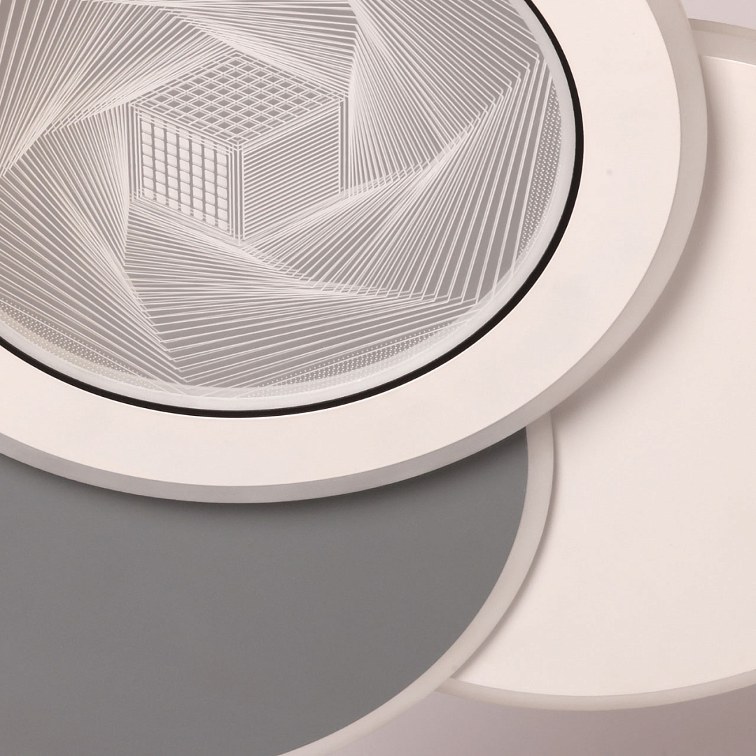 Мягкое сочетание белого и серого цветов придает светильнику декоративности и прекрасно подойдет к современному интерьеру. Многорежимность с изменением цветовой температуры от 3000К до 6500К  является элементом светодизайна и позволяет подобрать комфортную температуру света. Качественные светодиоды и корпус из сплава алюминия  обеспечивают яркое освещение и долгий срок службы. Благодаря актуальной асимметрии дизайна и 3D-эффекту светильник становится арт объектом. Наличие ПДУ  обеспечивает комфортное переключение режимов освещения. Компактный светильник для стандартной высоты потолка. Светодиодные источники света экономичны и безопасны.