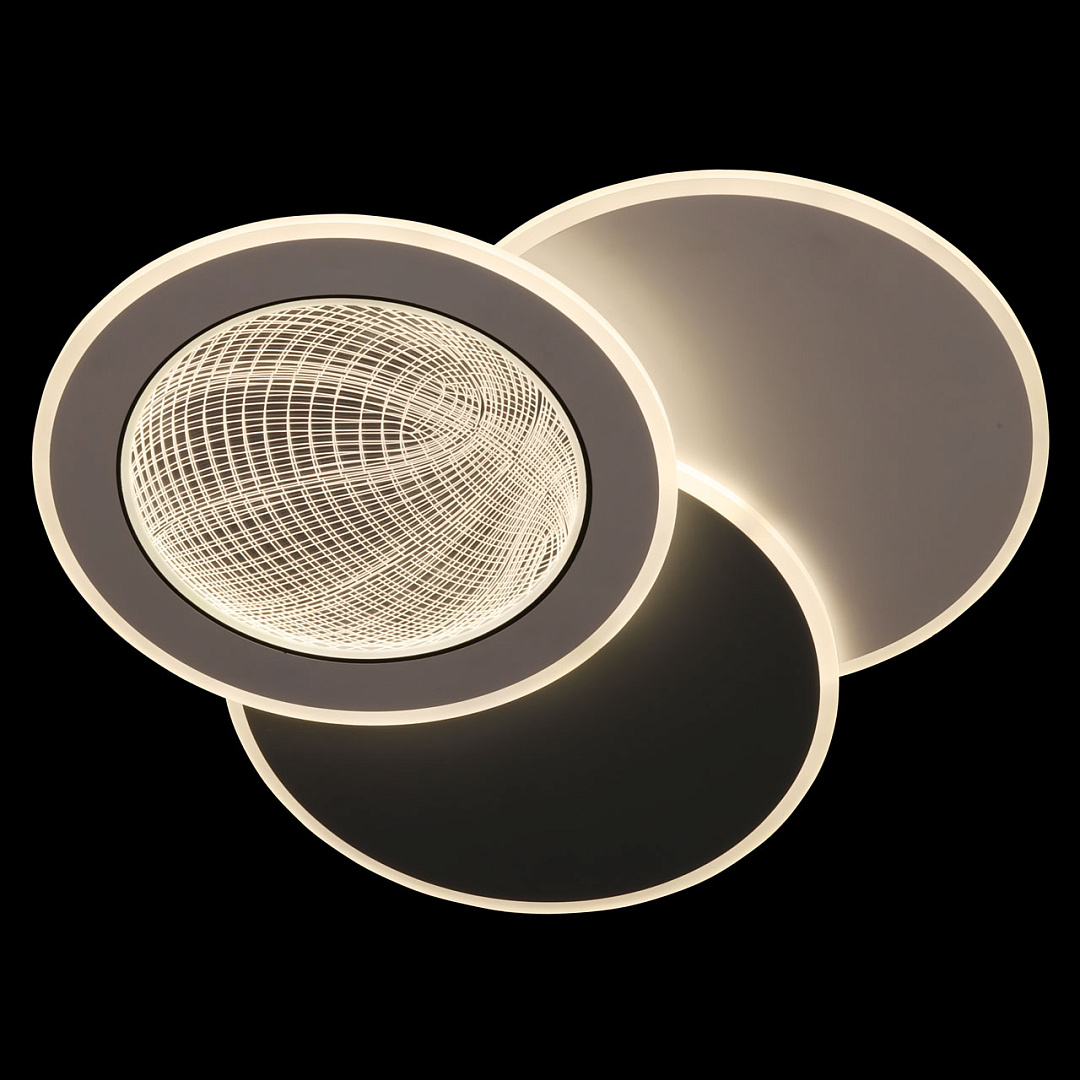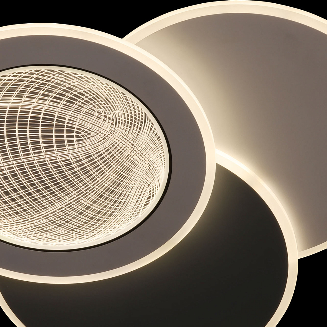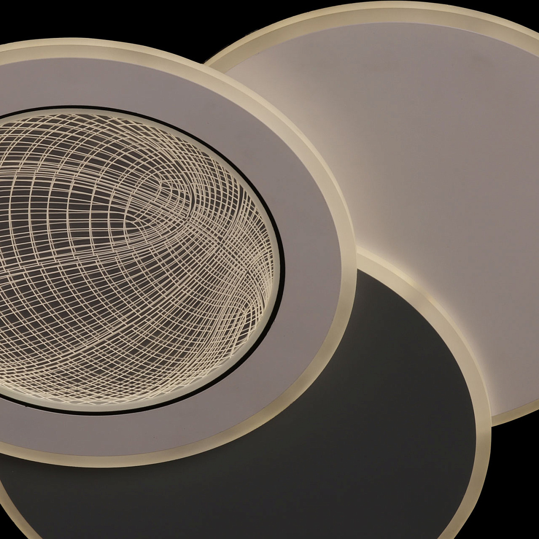 Мягкое сочетание белого и серого цветов придает светильнику декоративности и прекрасно подойдет к современному интерьеру. Многорежимность с изменением цветовой температуры от 3000К до 6500К  является элементом светодизайна и позволяет подобрать комфортную температуру света. Качественные светодиоды и корпус из сплава алюминия  обеспечивают яркое освещение и долгий срок службы. Благодаря актуальной асимметрии дизайна и 3D рисунку светильник становится арт объектом. Наличие ПДУ  обеспечивает комфортное переключение режимов освещения. Компактный светильник для стандартной высоты потолка. Светодиодные источники света экономичны и безопасны.