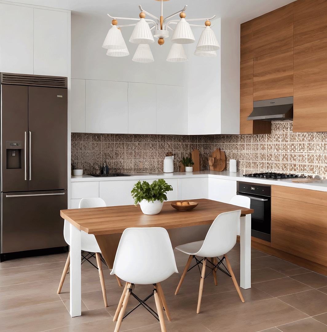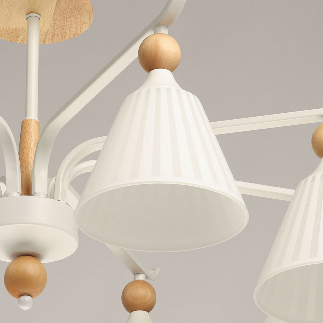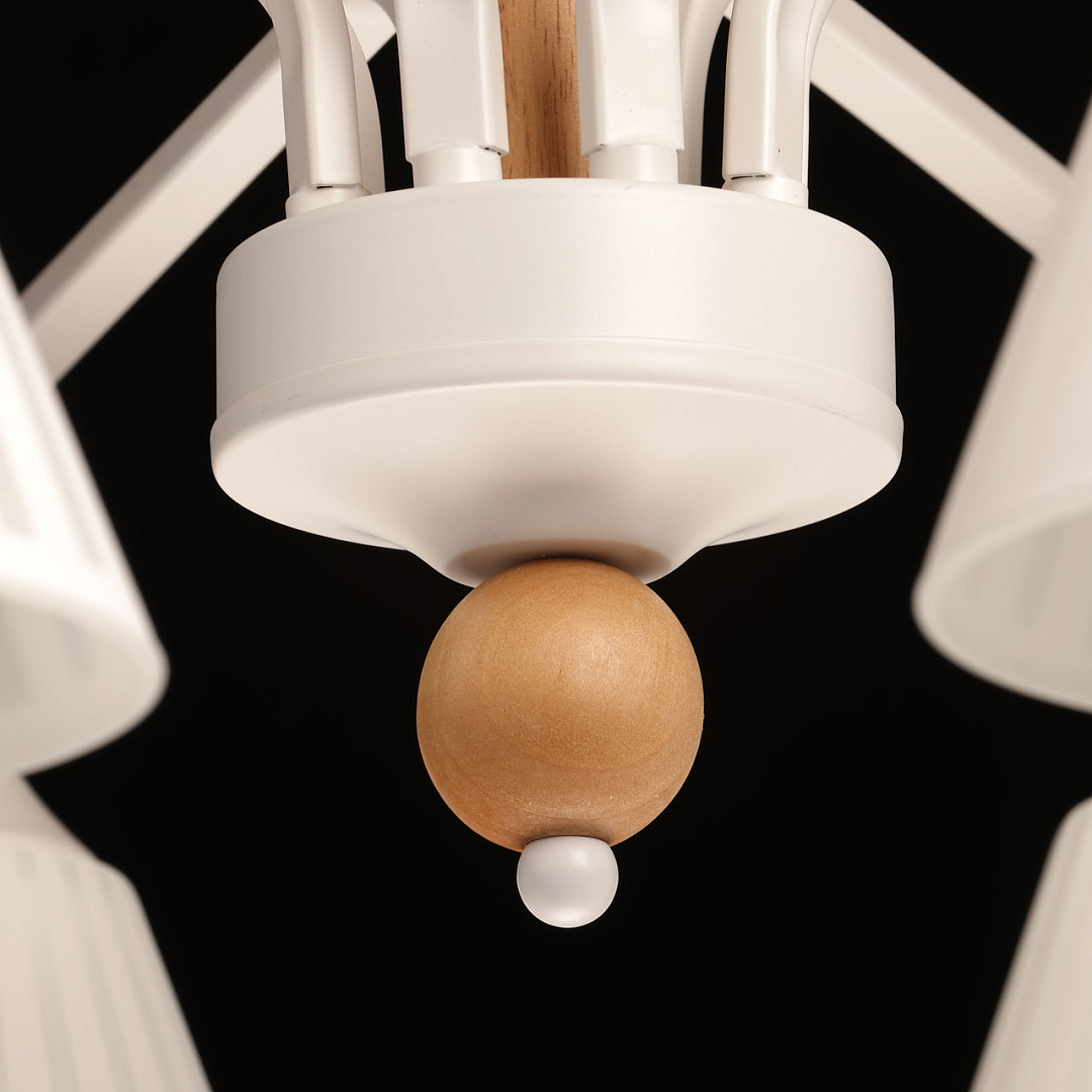 Белый цвет основания потолочной люстры универсально подойдет к любому интерьеру. Особый шарм создают белые стеклянные плафоны, направленные вниз. Натуральности и теплоты в интерьер добавляют декоративные элементы из натурального дерева. Компактный размер люстры прекрасно подходит в интерьеры со стандартным потолком. Заменяемые источники света удобны в эксплуатации.