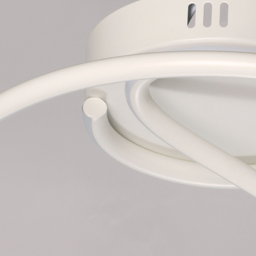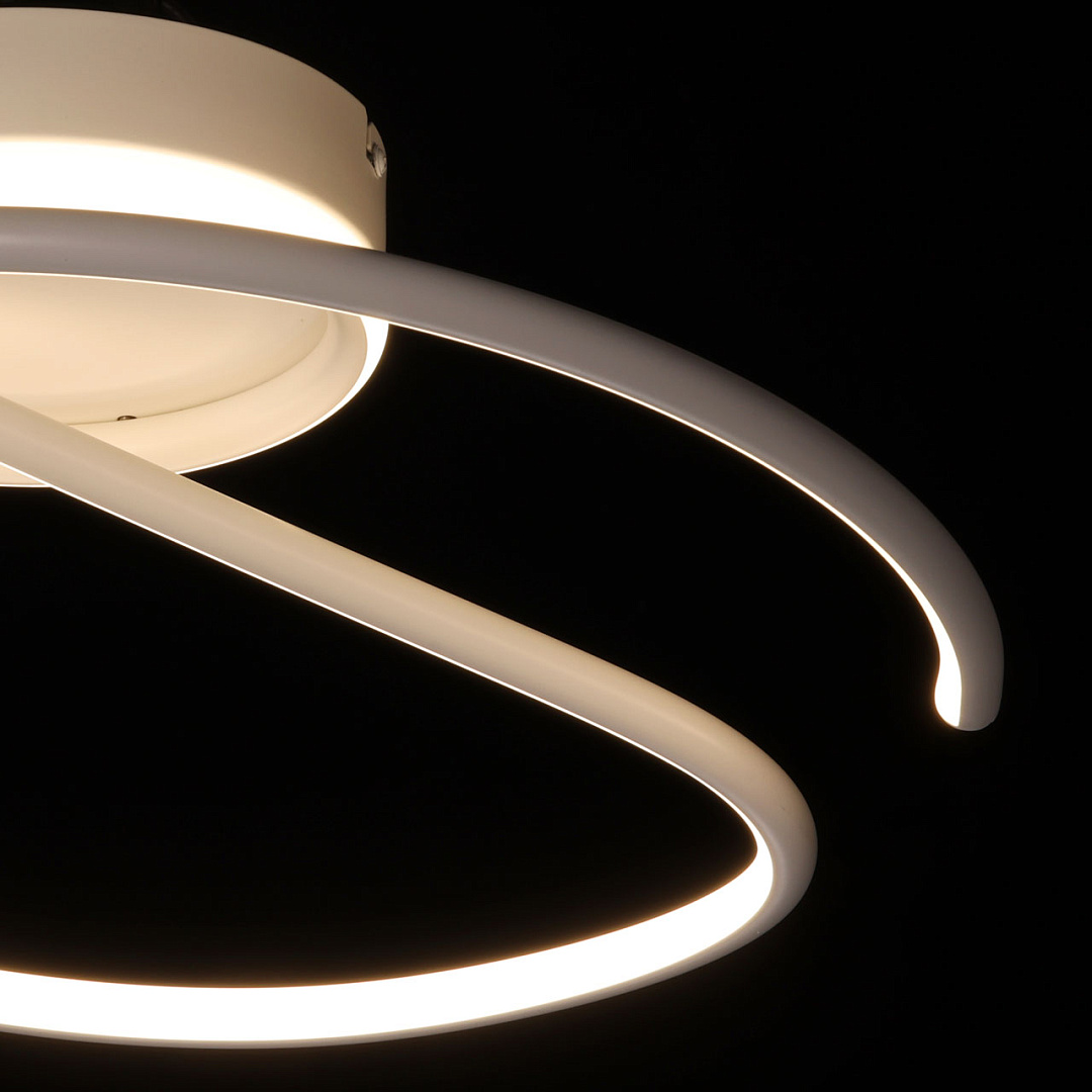 Белый цвет основания придает потолочной люстре легкости и воздушности. Изящно изогнутый плафон создает единый и гармоничный образ светильника. Белый силикон плафона мягко рассеивает свет. Компактный размер светильника подойдет к стандартным потолкам и сохранит пространство комнаты. Светодиодные источники света экономичны и безопасны.