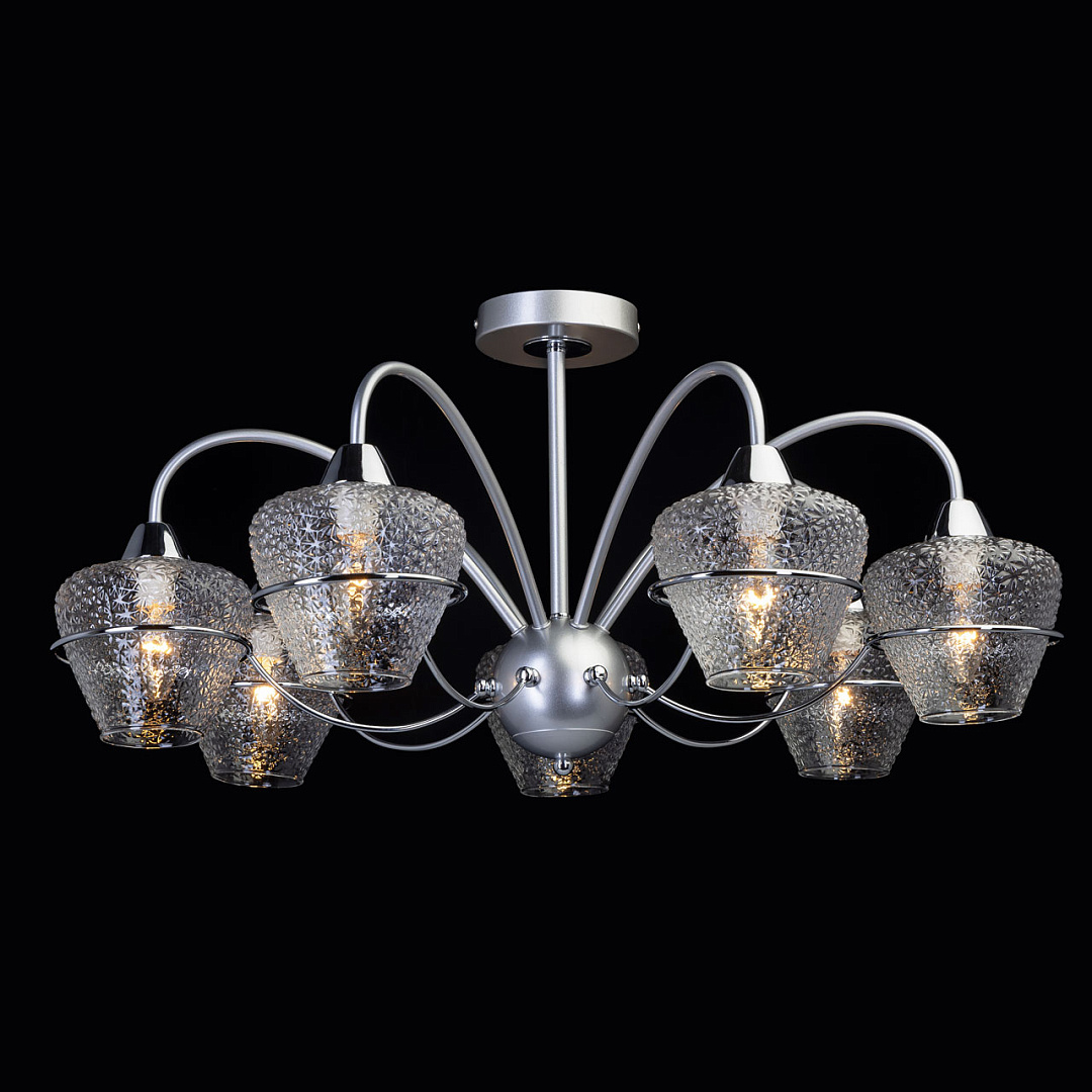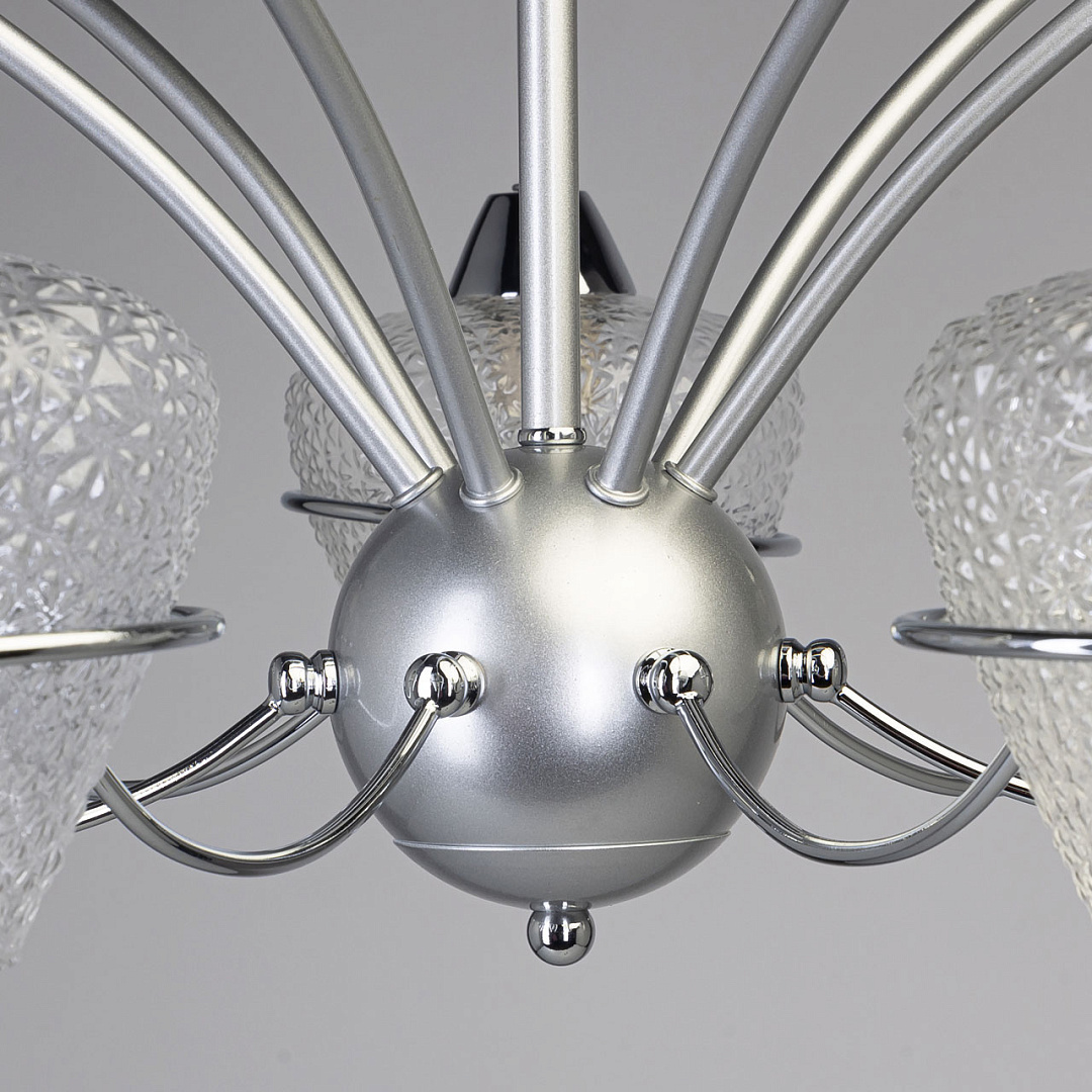 Оригинальный дизайн потолочной люстры обращает на себя внимание.Контрастное сочетание фактуры глянцевого хрома и матового серебра делает люстру модной и современной.Фактурные плафоны вниз создают красивую игру света.Компактный размер потолочной люстры сохраняет пространство комнаты и позволяет ее использовать при стандартной высоте потолка.Заменяемый источник света удобен в эксплуатации.