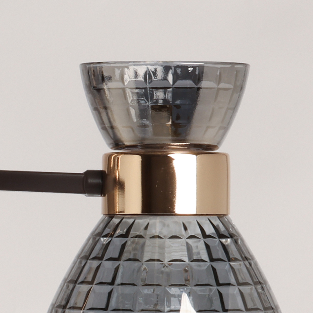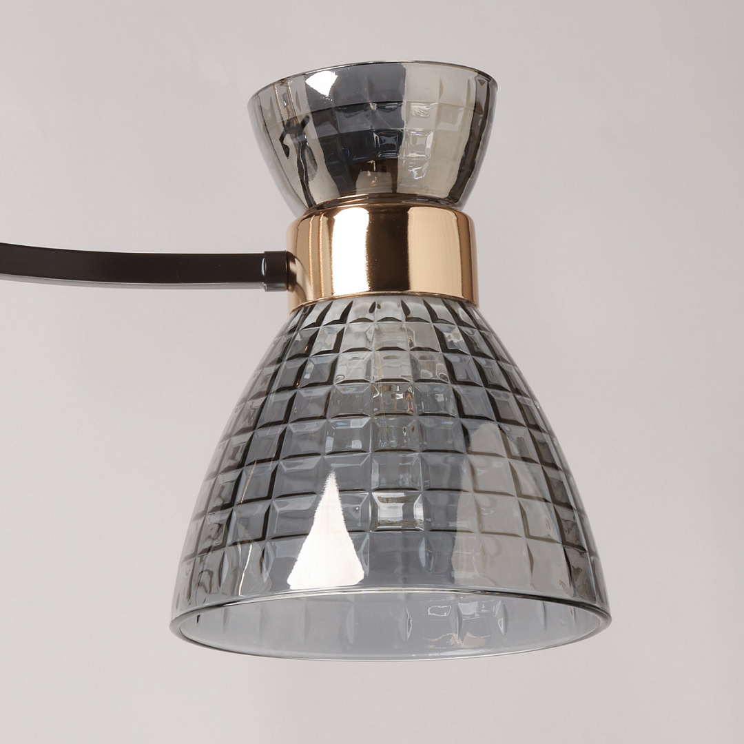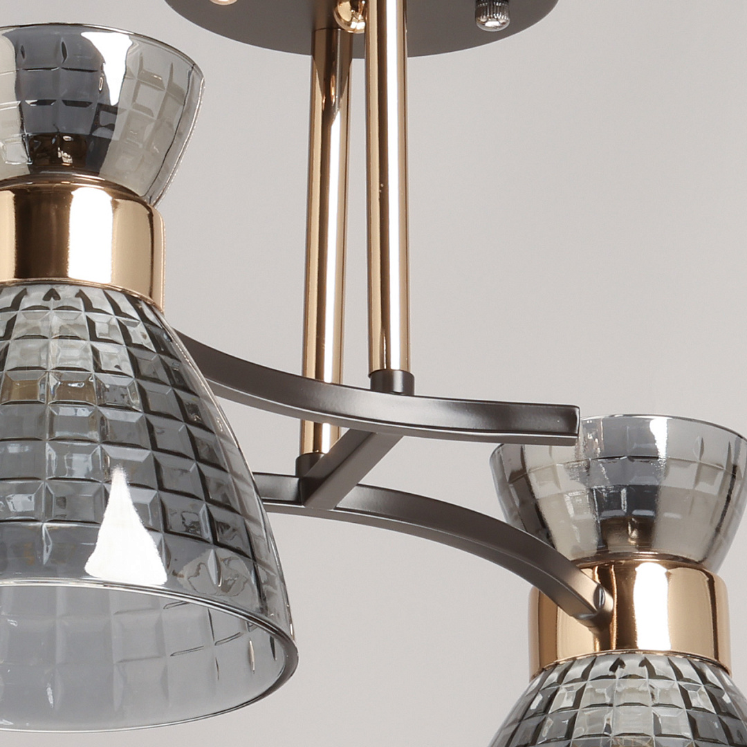Цвет кофе на основании создает теплую и уютную атмосферу. Элементы цвета золота добавляют потолочной люстре изысканности. Дымчатый цвет стеклянных плафонов создает приятную атмосферу. Вытянутая форма люстры гармонично объединяет освещение, дизайн и функциональность. Компактный размер люстры прекрасно подходит в интерьеры со стандартным потолком. Заменяемые источники света удобны в эксплуатации.