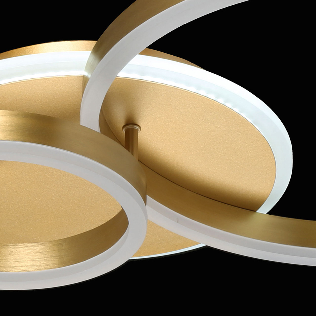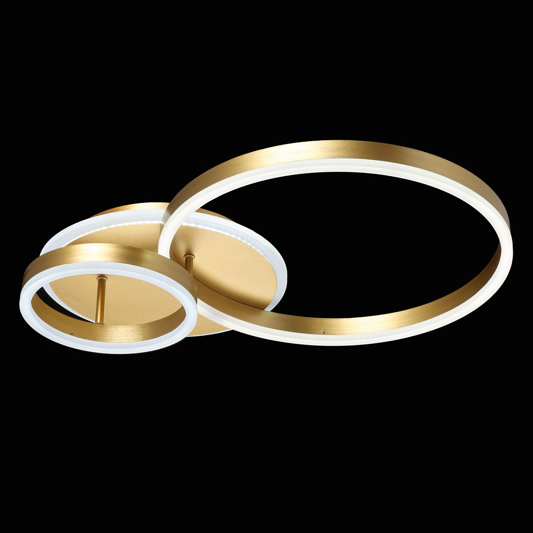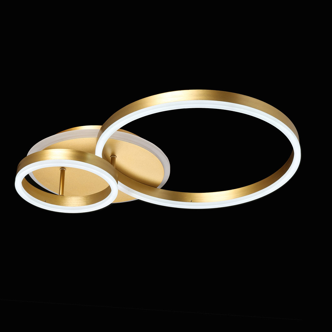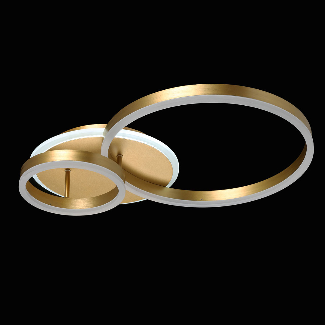 Многорежимность с изменением цветовой температуры и яркости света   является элементом светодизайна.Качественные светодиоды обеспечивают яркое освещение и долгий срок службы.Наличие ПДУ позволяет управлять режимами освещения.Плавный диммер позволяет создавать требуемое настроение в помещении.Модный цвет матового золота придает потолочной люстре элегантности.Строгая геометрия, сочетание кругов и окружностей в тренде.Компактный светильник для стандартной высоты потолка.
