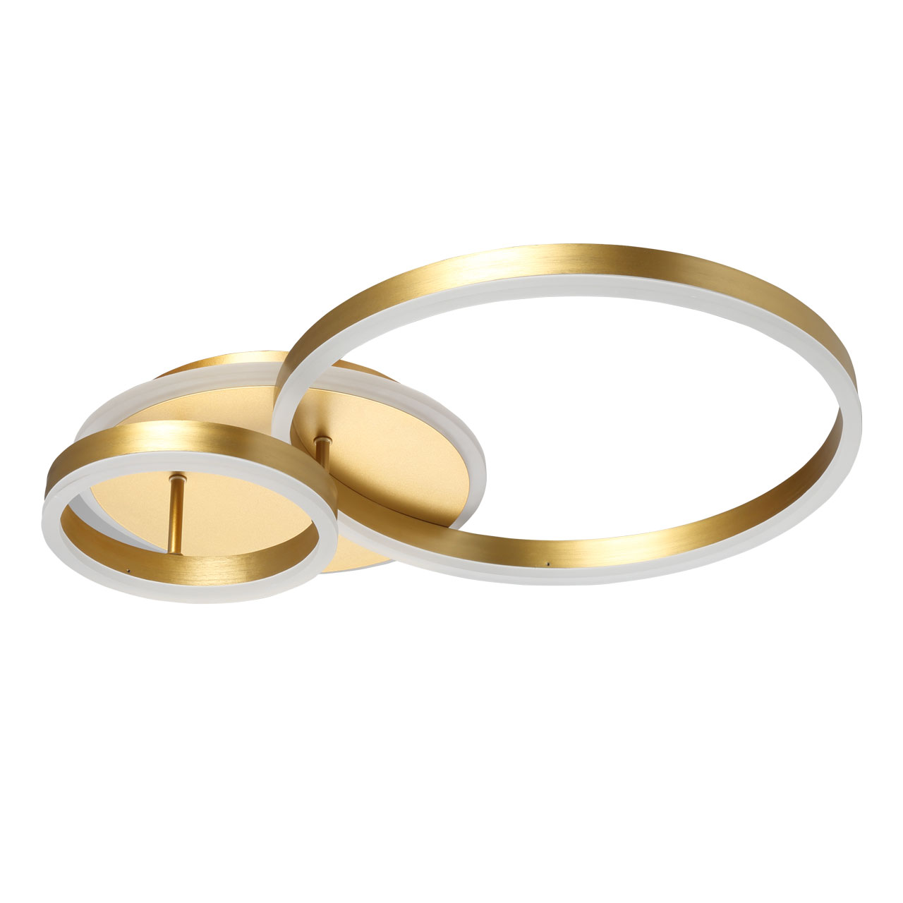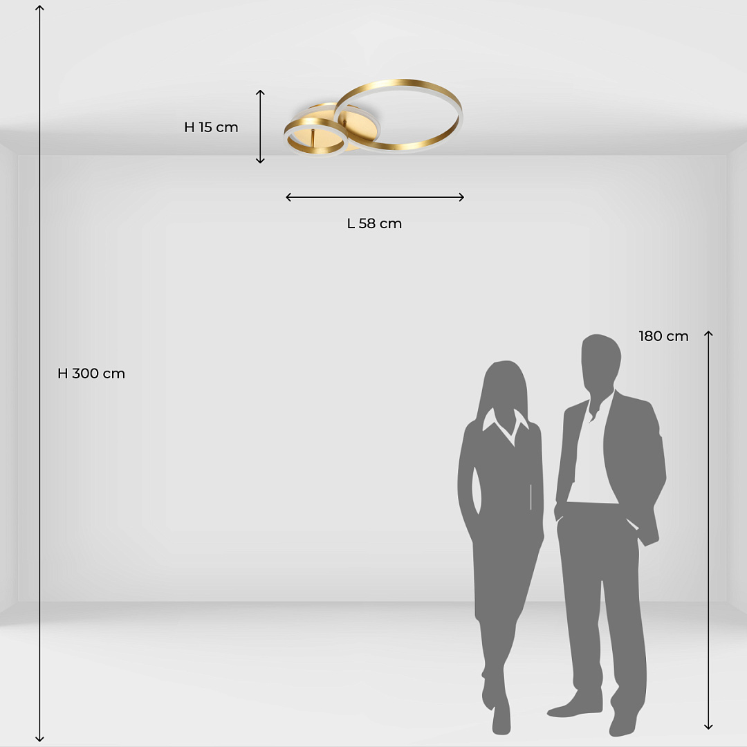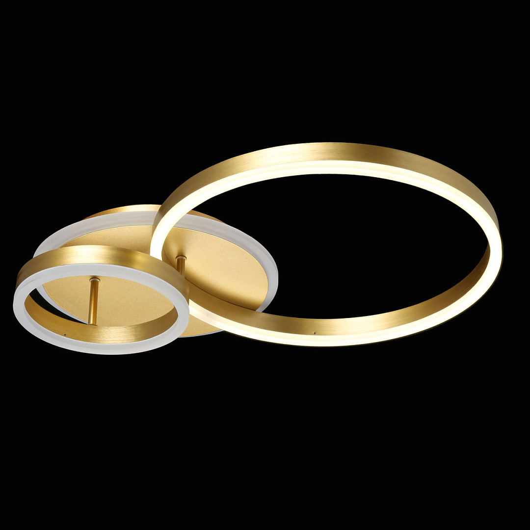 Многорежимность с изменением цветовой температуры и яркости света   является элементом светодизайна.Качественные светодиоды обеспечивают яркое освещение и долгий срок службы.Наличие ПДУ позволяет управлять режимами освещения.Плавный диммер позволяет создавать требуемое настроение в помещении.Модный цвет матового золота придает потолочной люстре элегантности.Строгая геометрия, сочетание кругов и окружностей в тренде.Компактный светильник для стандартной высоты потолка.