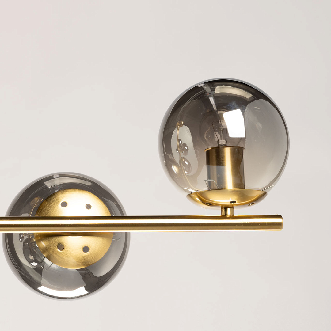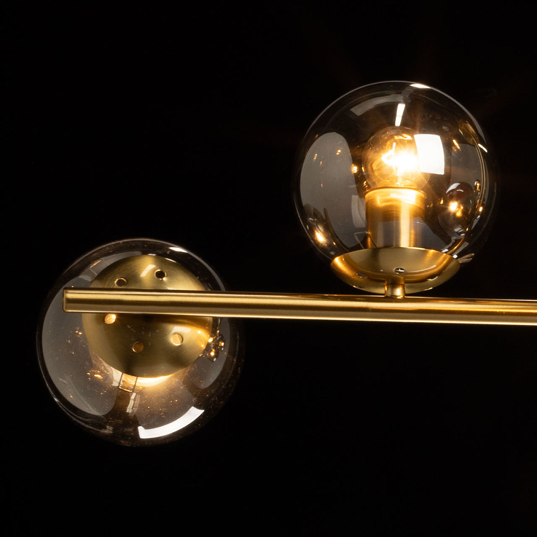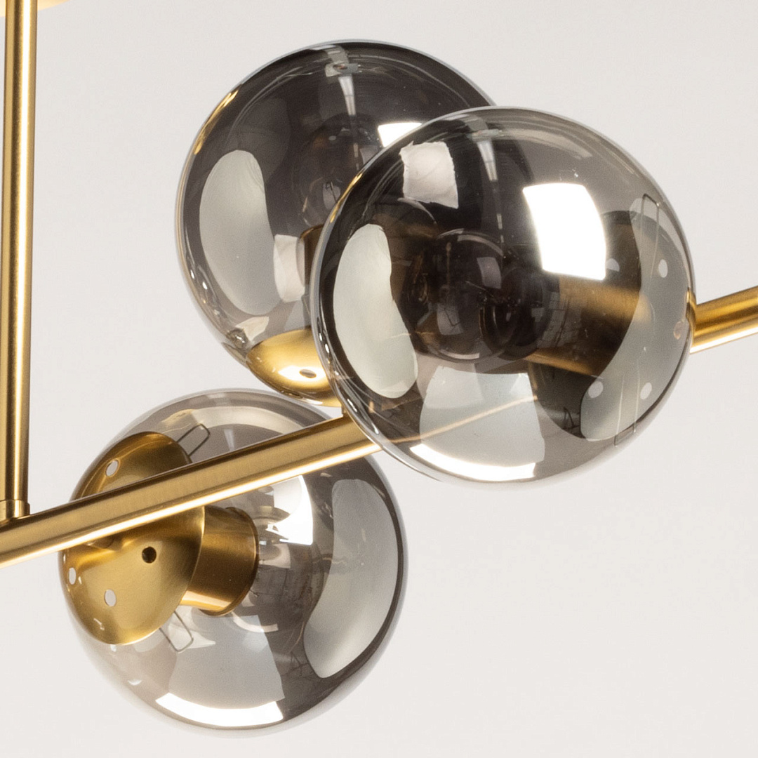 Благодаря сочетанию гальванизированного металла, стекла и золотистых акцентов, люстра привнесет в интерьер неповторимый стиль и атмосферу уюта. Асимметричное расположение стеклянных плафонов придает ей оригинальность и индивидуальность. Дымчатый цвет плафонов создает комфортное мягкое освещение. Светильник вытянут горизонтально, благодаря чему он освещает большую площадь. Заменяемые источники света делают ее удобной в использовании.