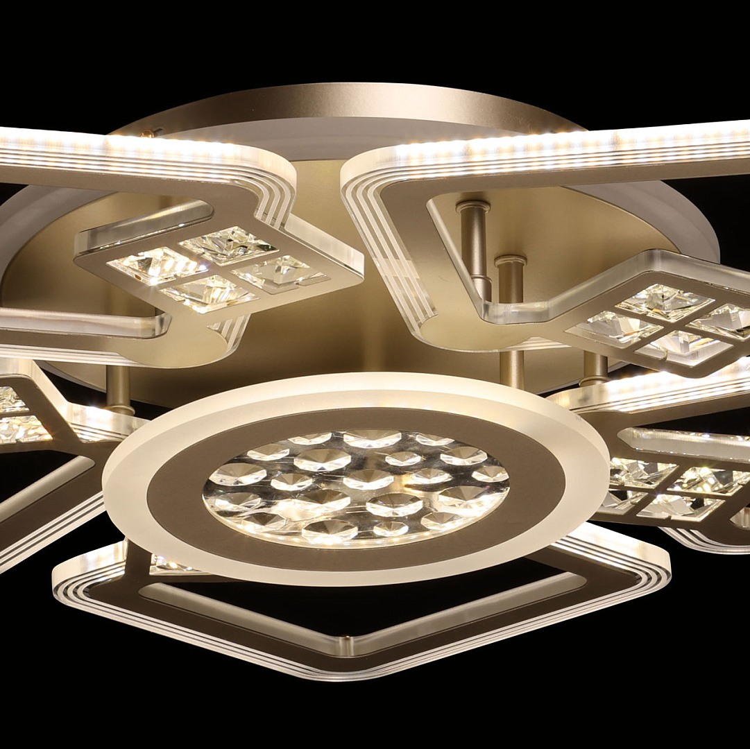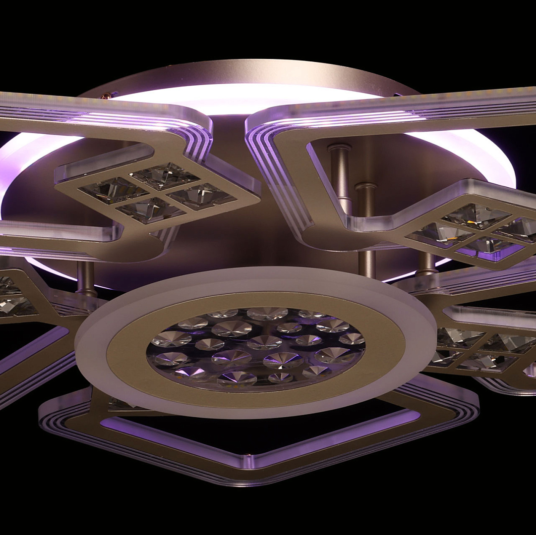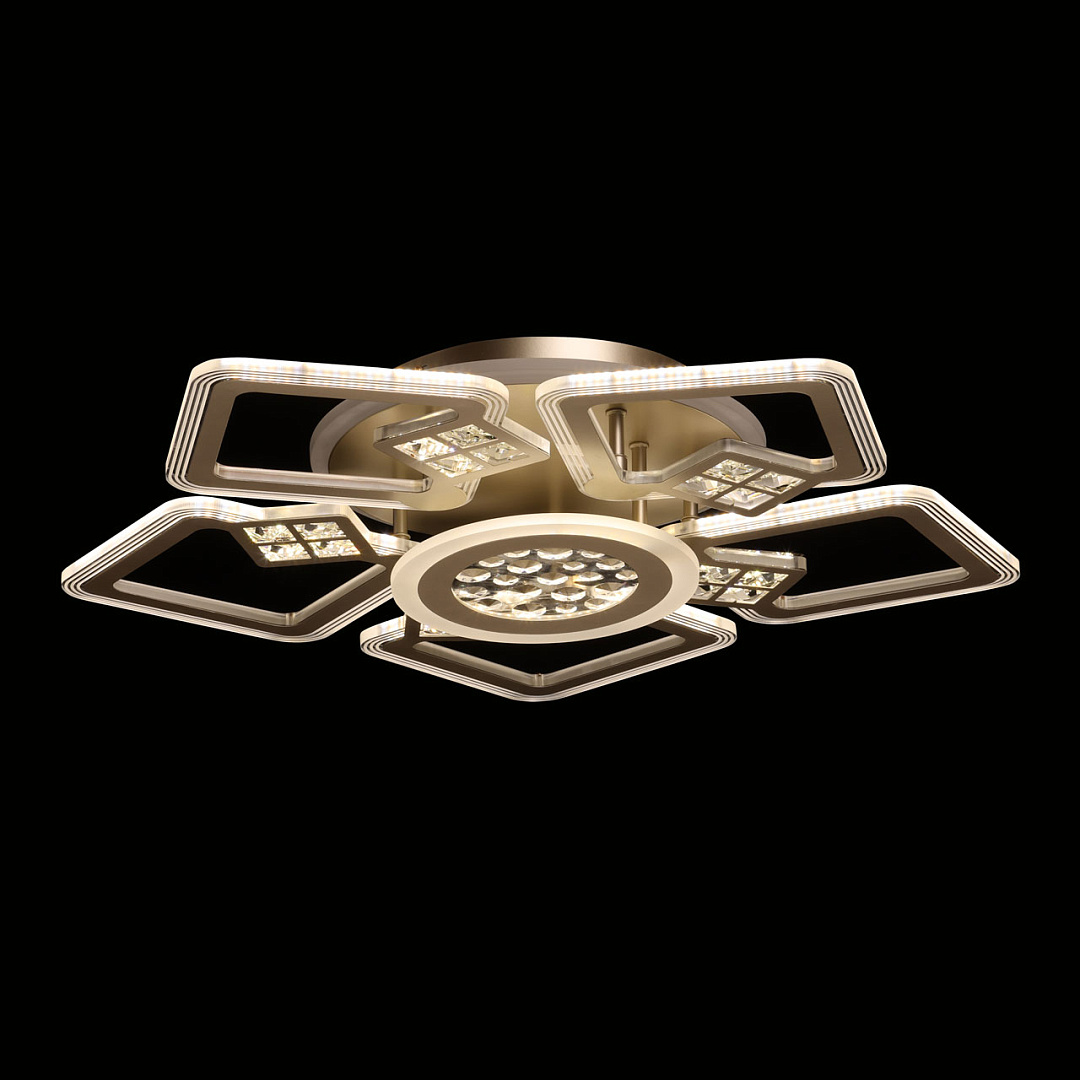 Многорежимность с изменением цветовой температуры и яркости света является элементом светодизайна. Качественные светодиоды обеспечивают яркое освещение и долгий срок службы. Наличие ПДУ позволяет управлять режимами освещения. Плавный диммер создает требуемое настроение в помещении. Подсветка потолка создает праздничное настроение. Модный цвет матового золота и оригинально изогнутые рожки придают потолочной люстре элегантности. Компактный светильник для стандартной высоты потолка.