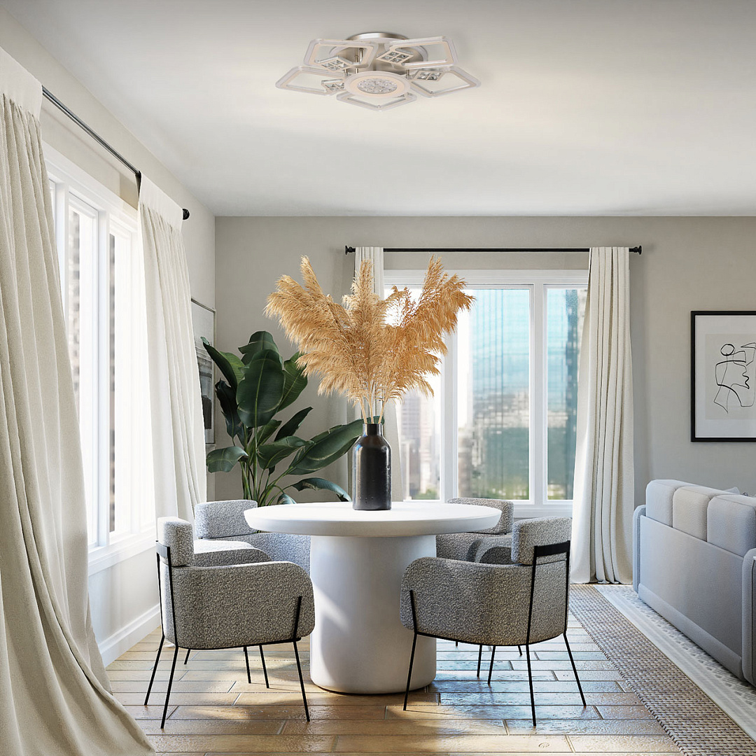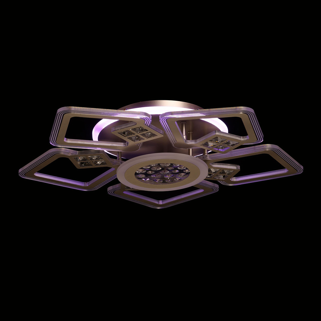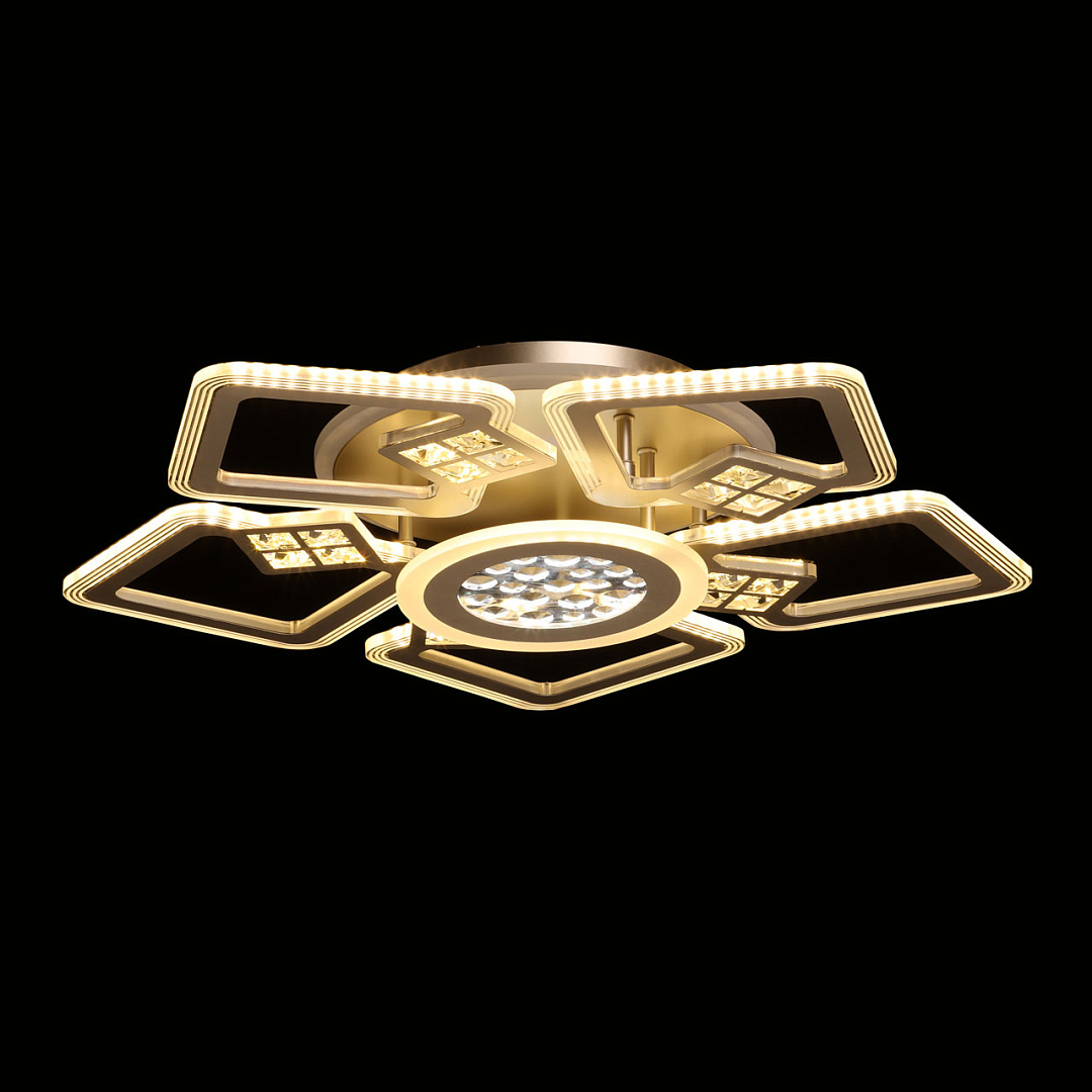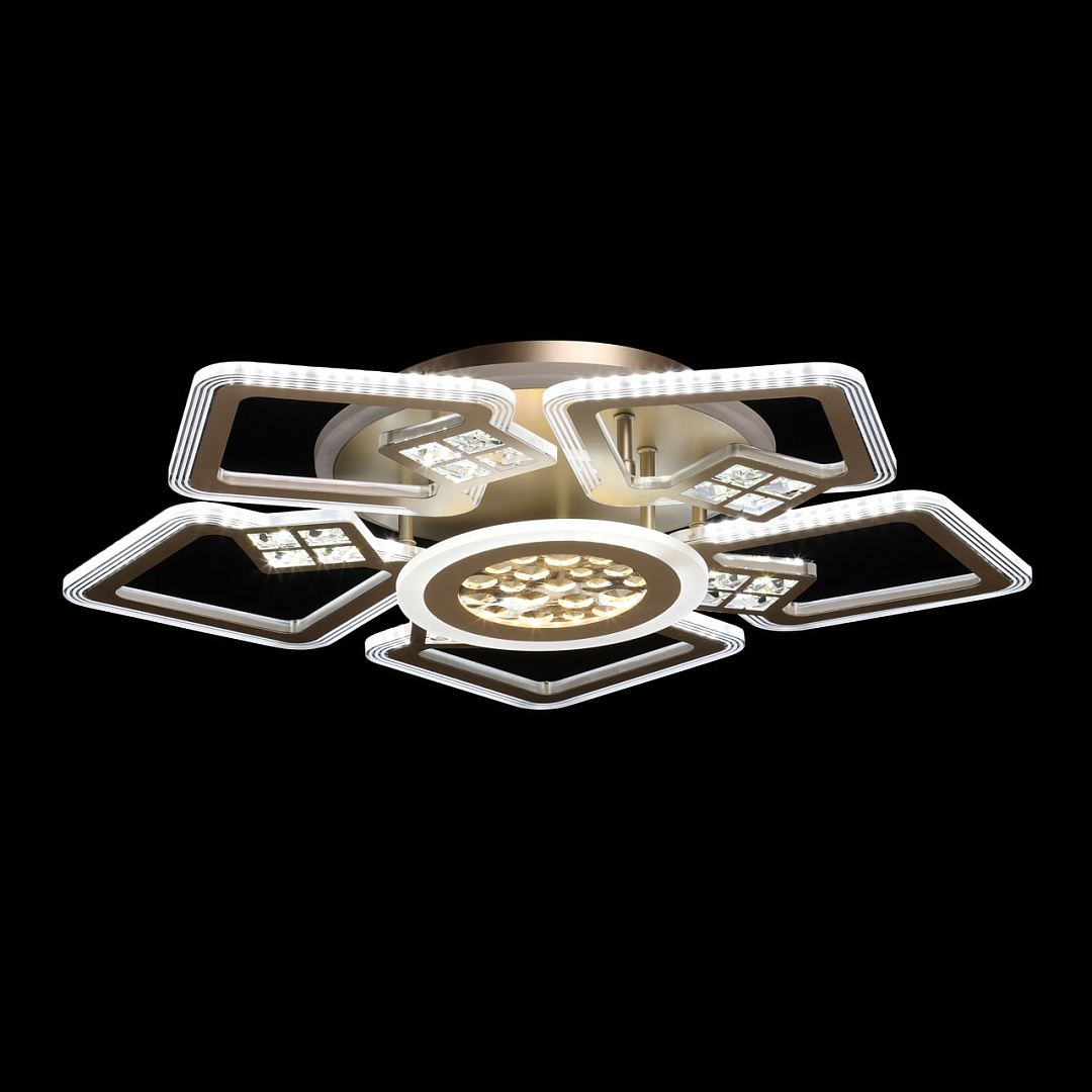 Многорежимность с изменением цветовой температуры и яркости света является элементом светодизайна. Качественные светодиоды обеспечивают яркое освещение и долгий срок службы. Наличие ПДУ позволяет управлять режимами освещения. Плавный диммер создает требуемое настроение в помещении. Подсветка потолка создает праздничное настроение. Модный цвет матового золота и оригинально изогнутые рожки придают потолочной люстре элегантности. Компактный светильник для стандартной высоты потолка.
