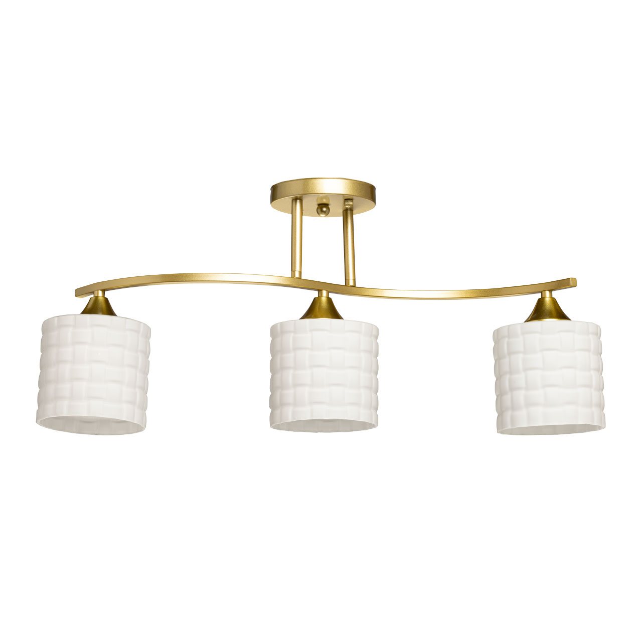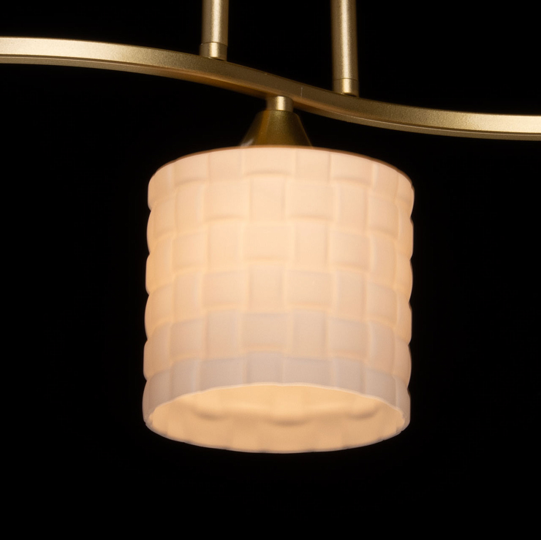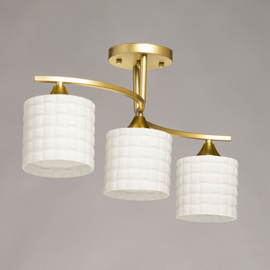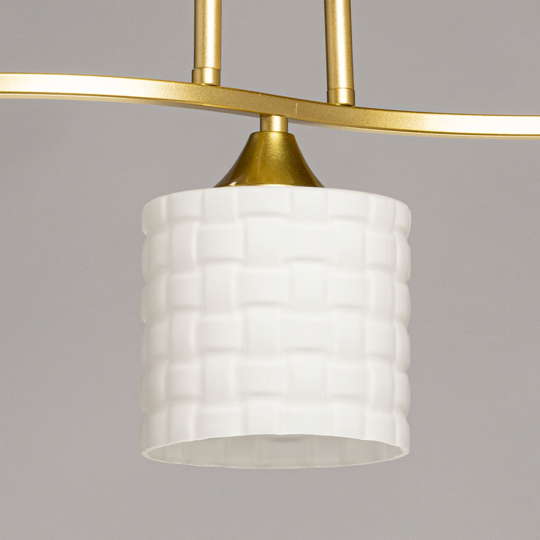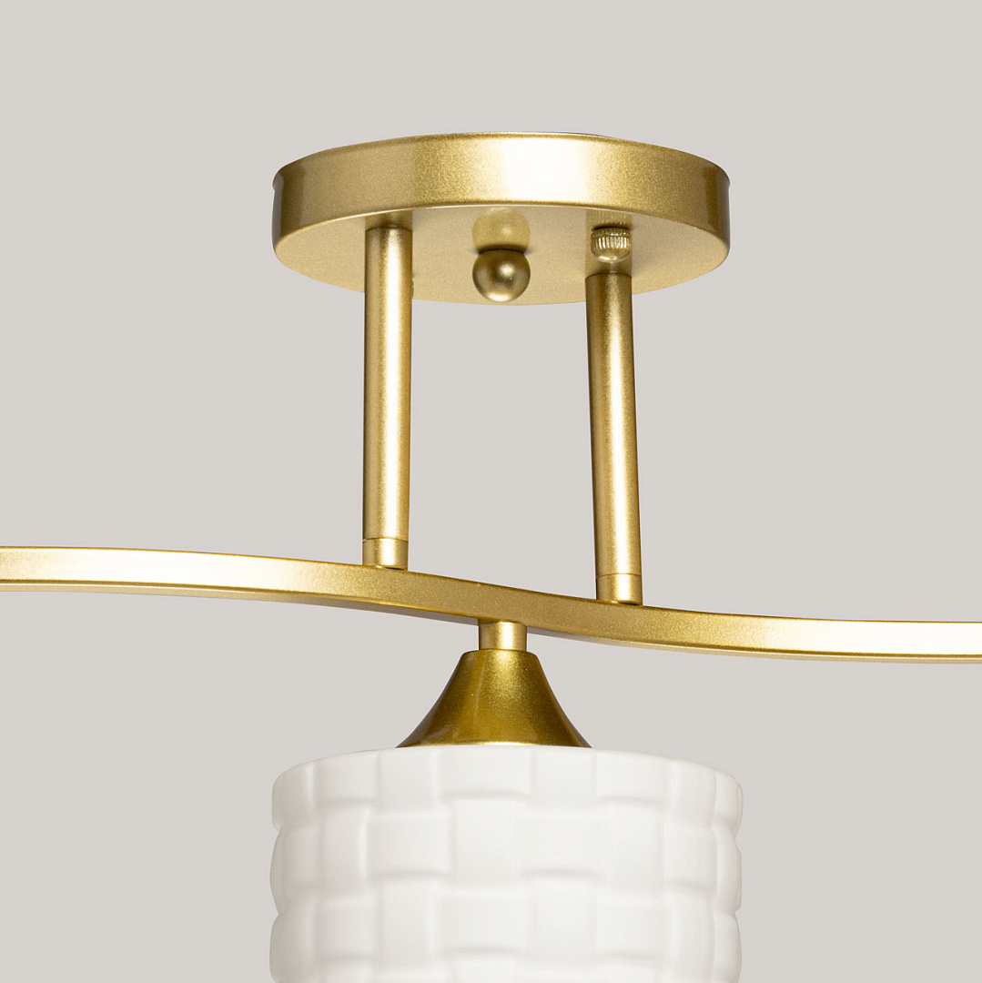 Золотистое металлическое основание придает люстре элегантный  вид, который хорошо сочетается с различными стилями интерьера. Белые стеклянные плафоны создают мягкое и равномерное освещение, что делает атмосферу в помещении более уютной и комфортной для глаз.Близкое расположение к потолку дает возможность испозьзовать светильник в помещениях со стандартными потолками.Заменяемые источники света удобны в эксплуатации.