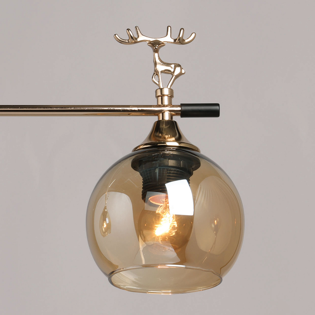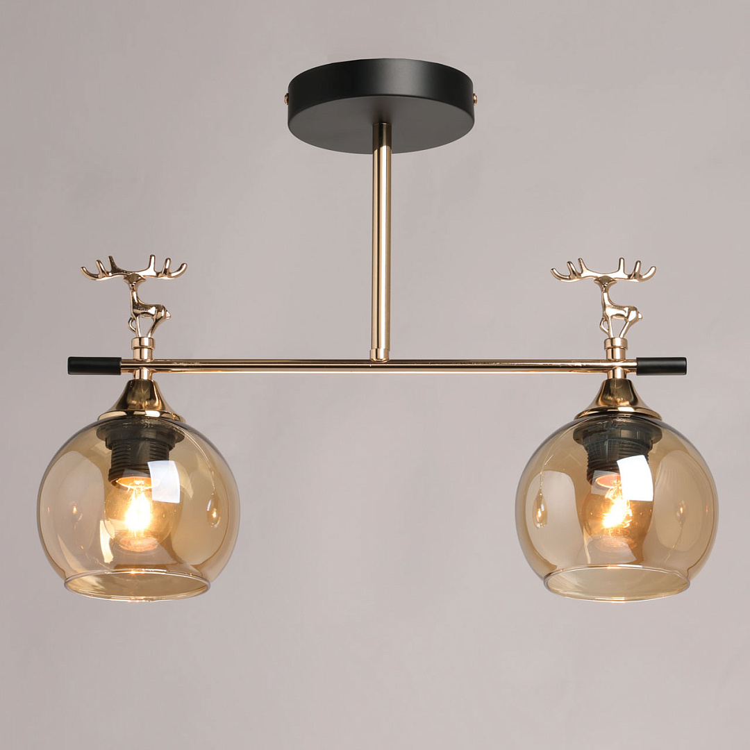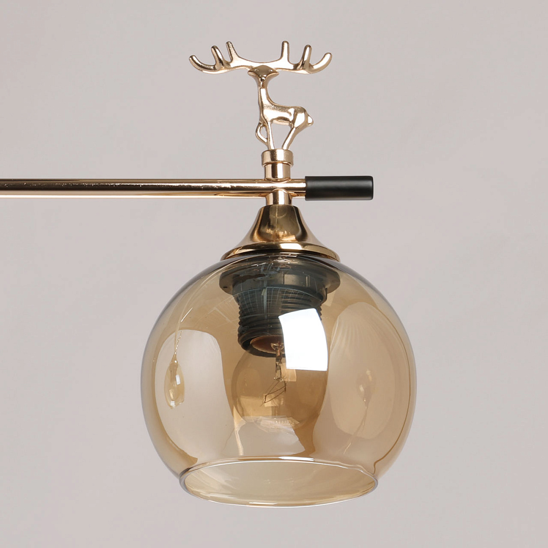 Контрастное сочетание черного цвета и цвета античной бронзы сохраняет свою актуальность. Прямые линии в дизайне светильника придают ему современности и стиля. Стекло плафонов цвета шампань создает уютное освещение. Оригинальный декор в виде фигурок оленей придает люстре изюминку и выделяет ее в ряду декоративных светильников.  Заменяемые источники света удобны в эксплуатации. Компактный размер потолочной люстры сохранит пространство комнаты при стандартных потолках.