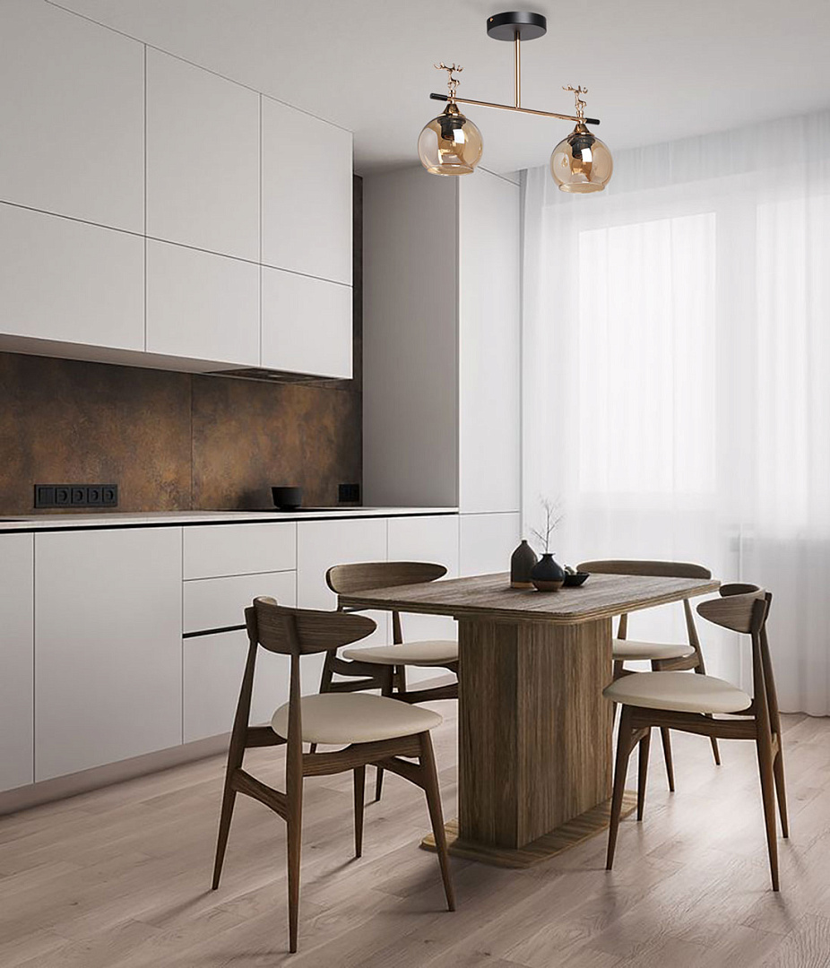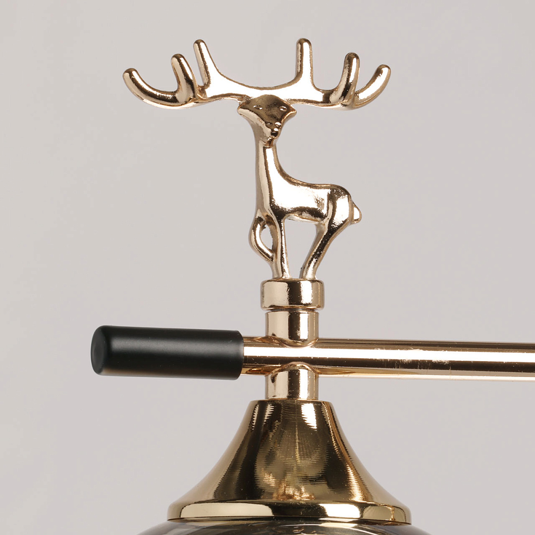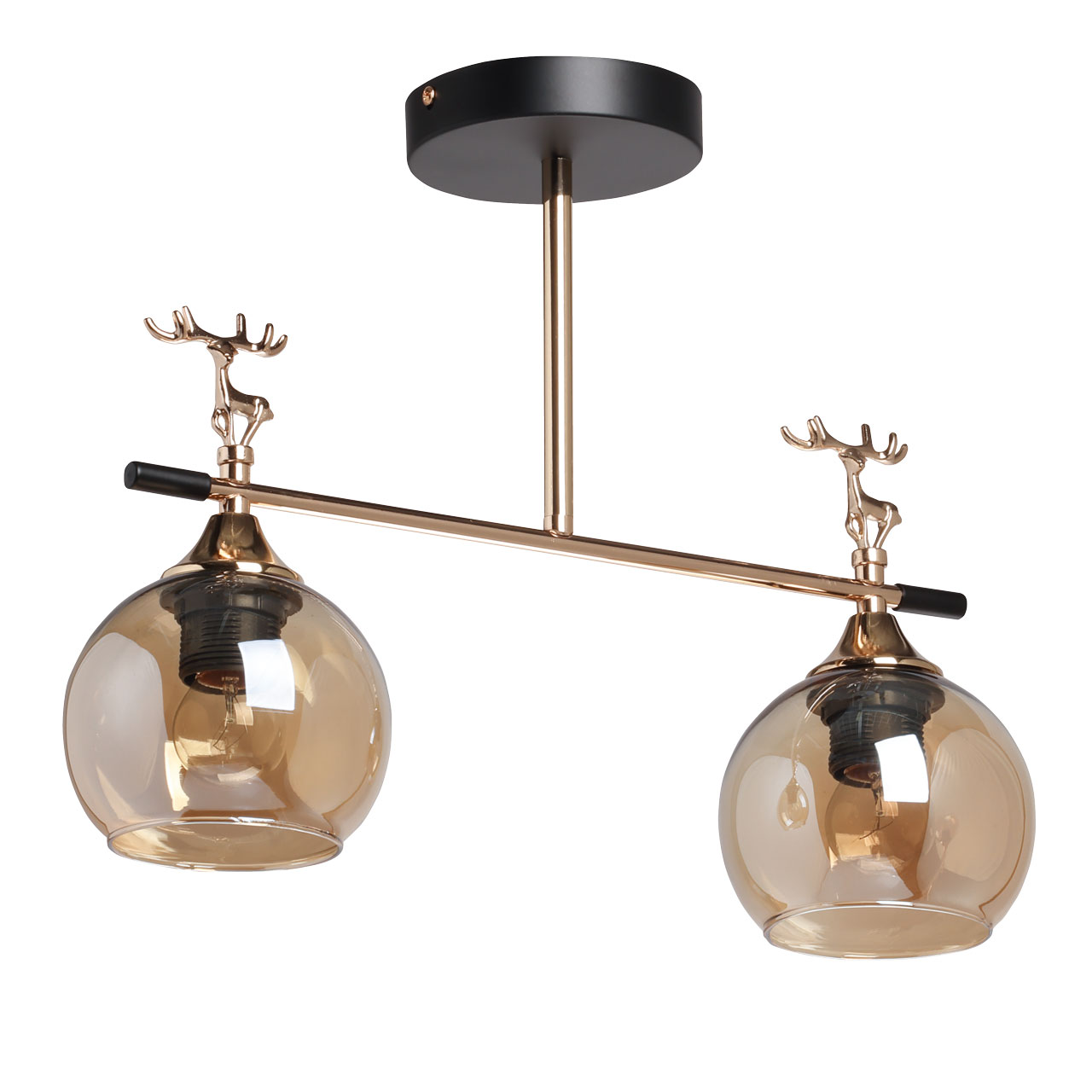 Контрастное сочетание черного цвета и цвета античной бронзы сохраняет свою актуальность. Прямые линии в дизайне светильника придают ему современности и стиля. Стекло плафонов цвета шампань создает уютное освещение. Оригинальный декор в виде фигурок оленей придает люстре изюминку и выделяет ее в ряду декоративных светильников.  Заменяемые источники света удобны в эксплуатации. Компактный размер потолочной люстры сохранит пространство комнаты при стандартных потолках.