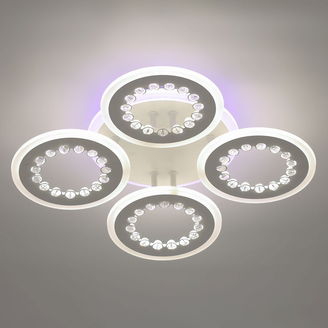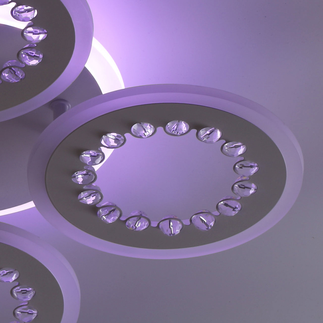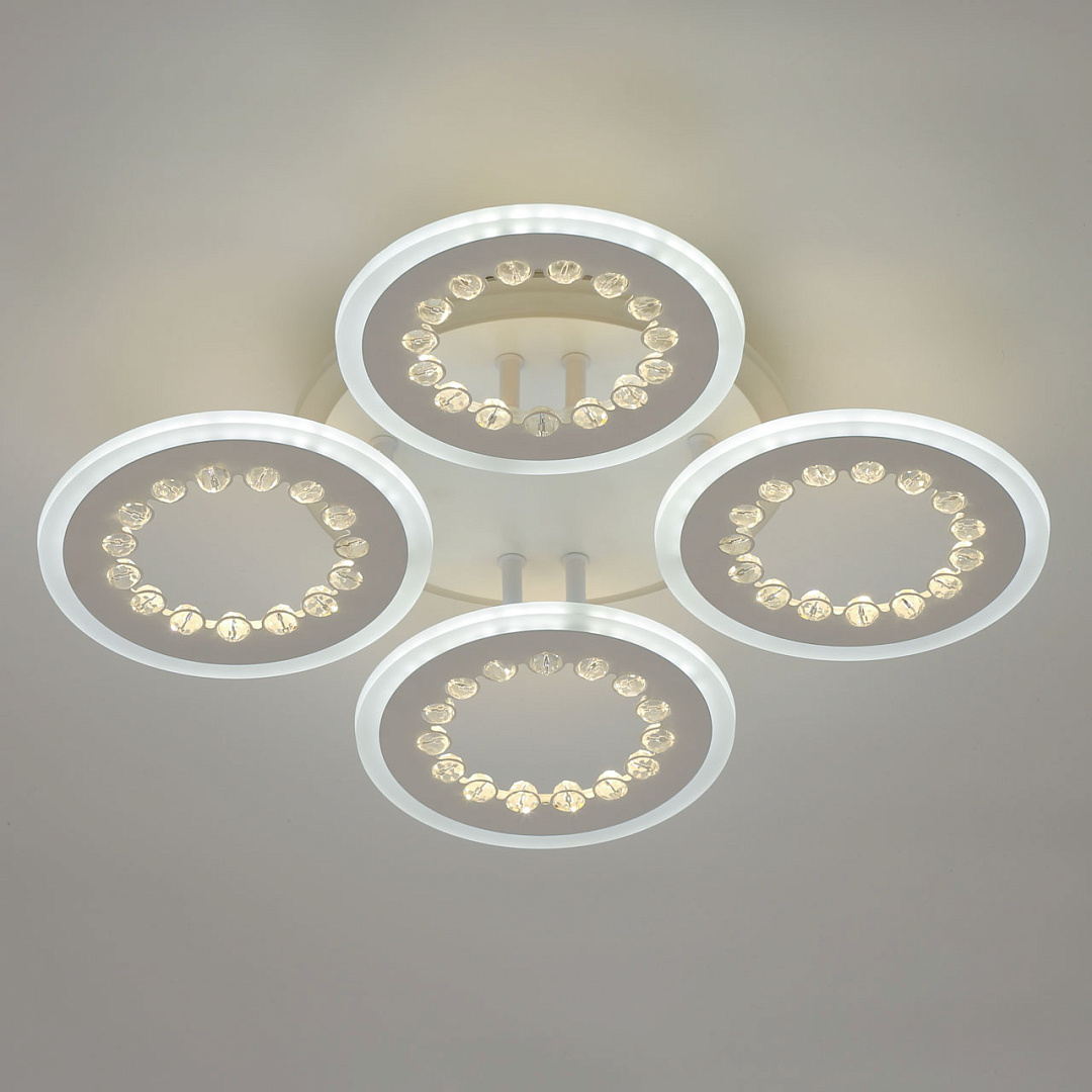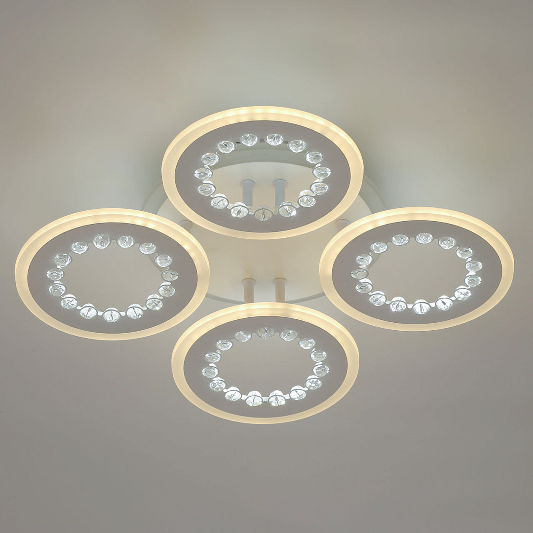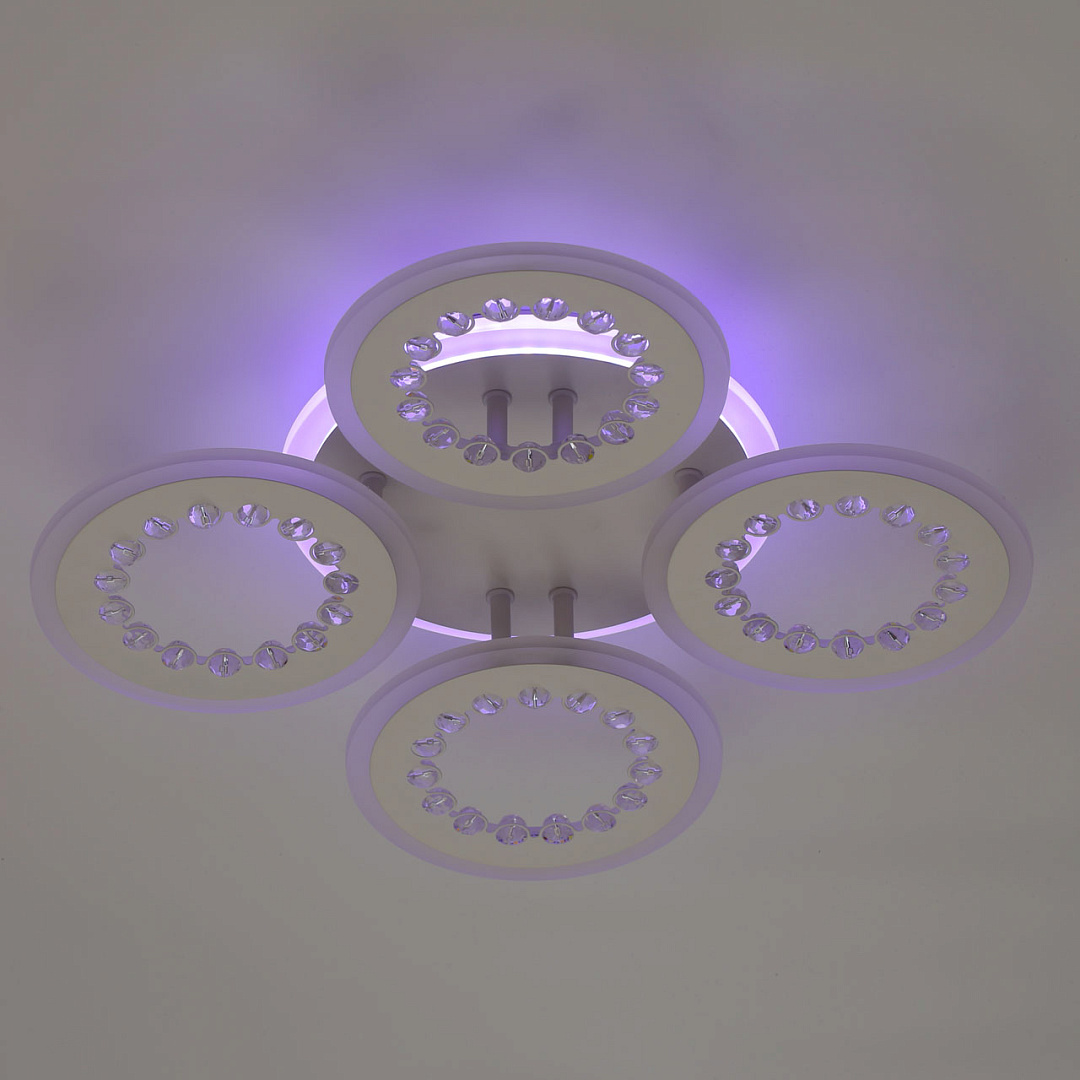 Многорежимность с изменением цветовой температуры и яркости света   является элементом светодизайна.Качественные светодиоды обеспечивают яркое освещение и долгий срок службы.Наличие ПДУ позволяет управлять режимами освещения.Плавный диммер создает требуемое настроение в помещении.Универсальный белый цвет подойдет к любому интерьеру.Декор в виде бусин из прозрачного акрила придает потолочной люстре гламурности.Компактный светильник для стандартной высоты потолка.