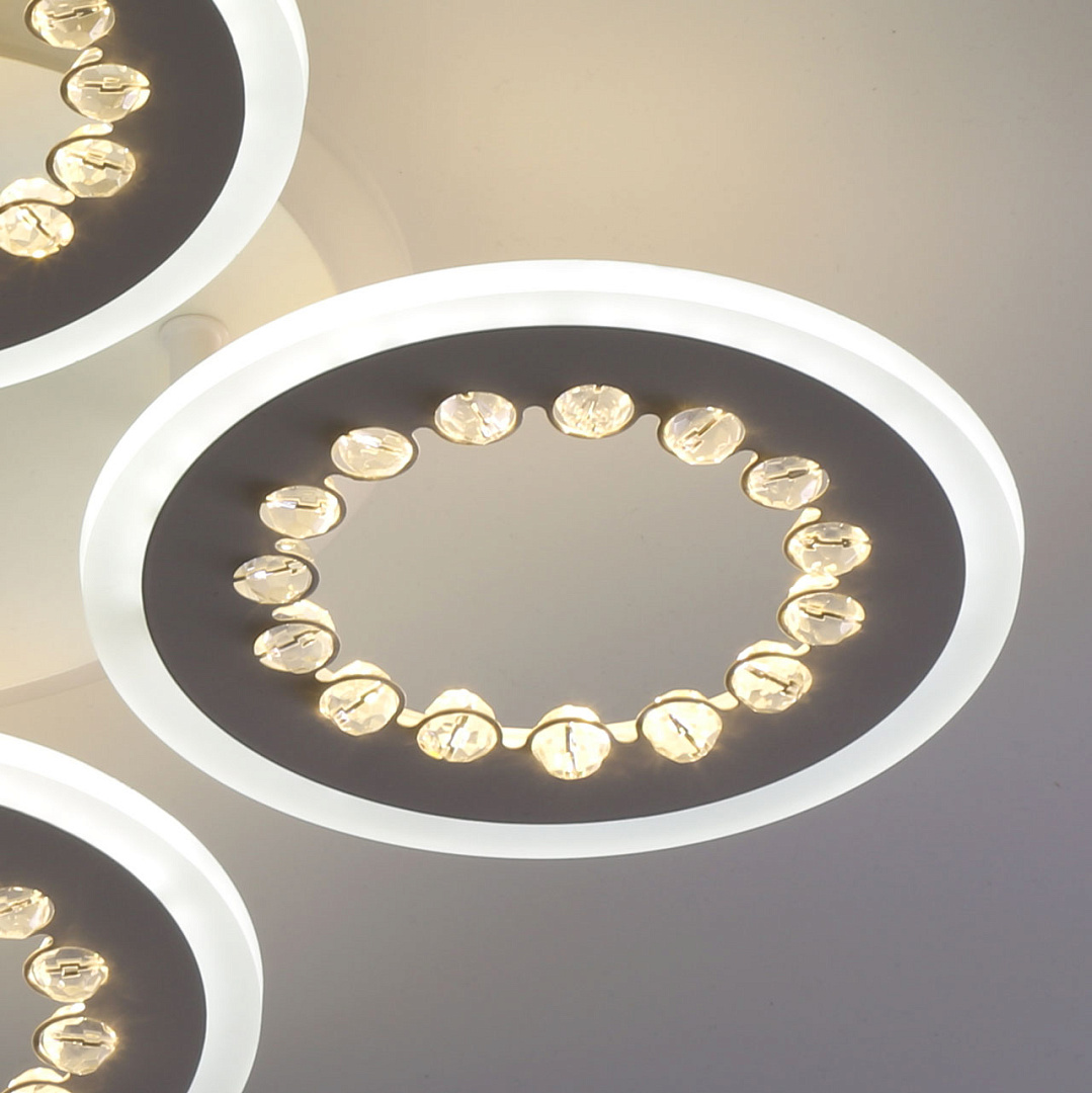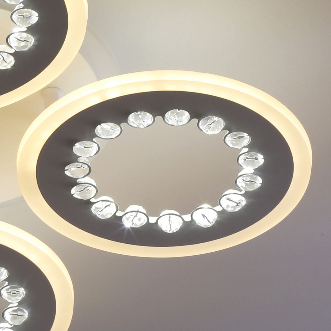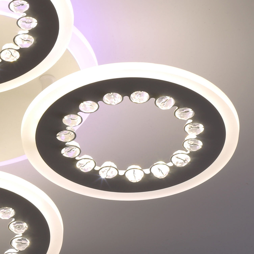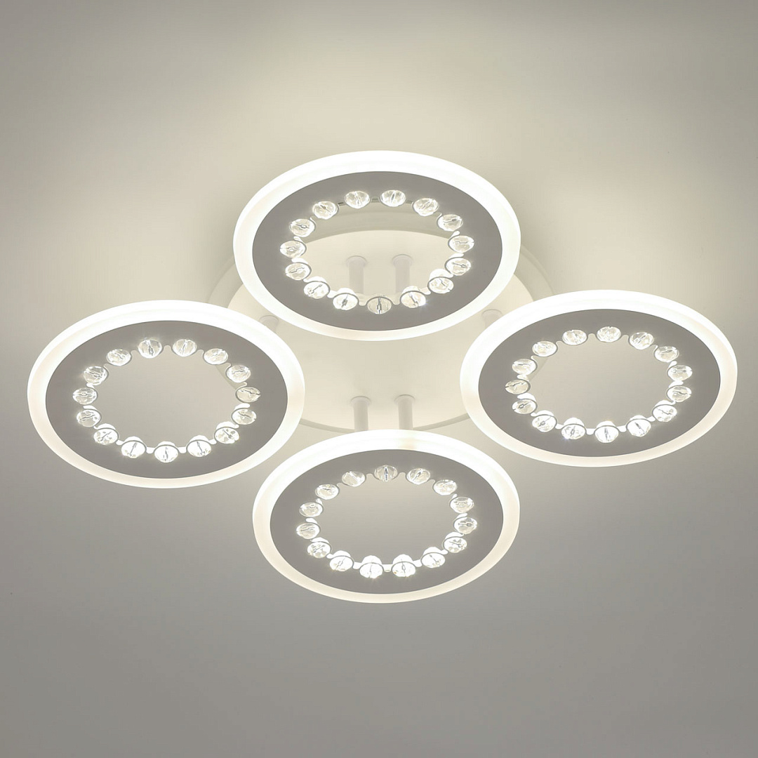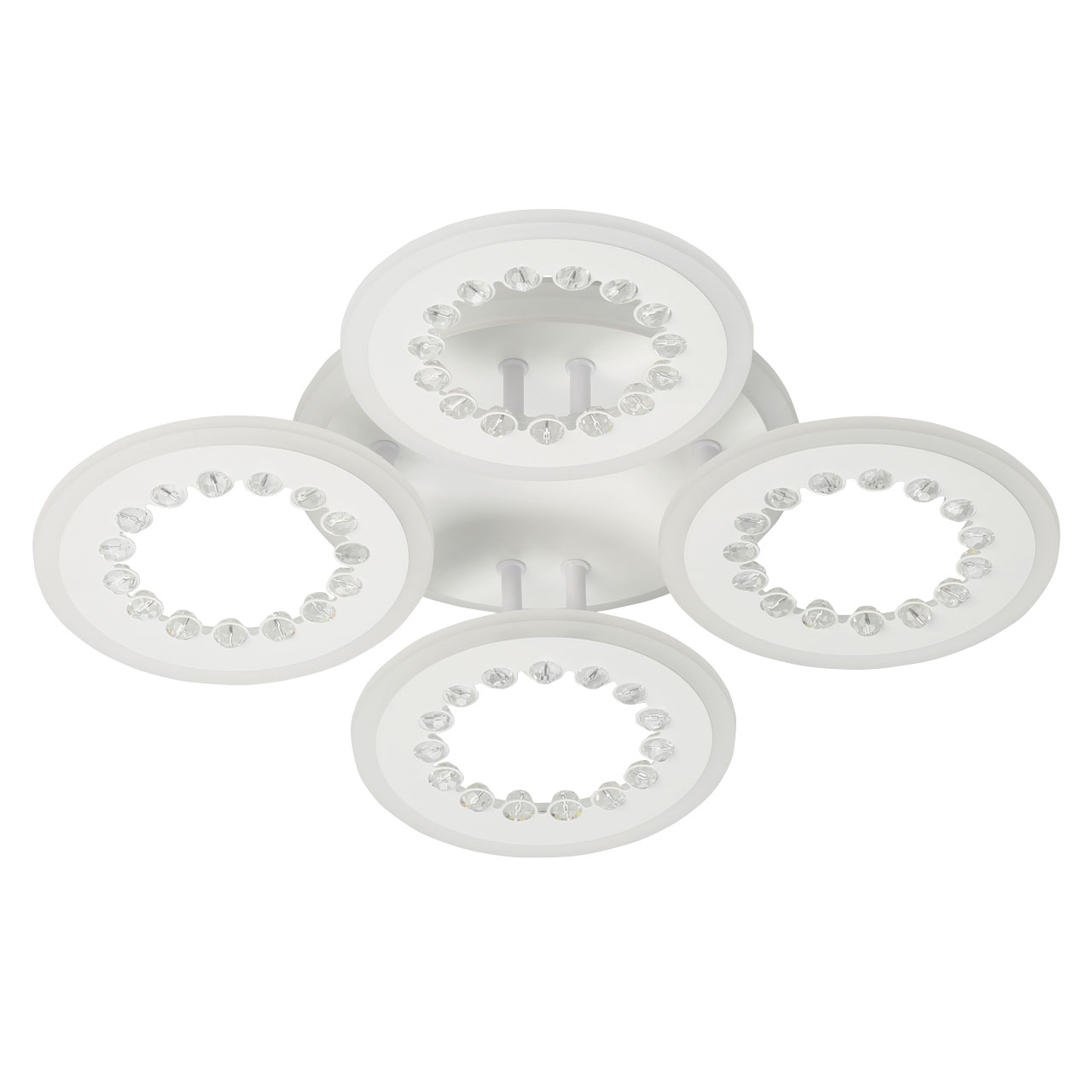 Многорежимность с изменением цветовой температуры и яркости света   является элементом светодизайна.Качественные светодиоды обеспечивают яркое освещение и долгий срок службы.Наличие ПДУ позволяет управлять режимами освещения.Плавный диммер создает требуемое настроение в помещении.Универсальный белый цвет подойдет к любому интерьеру.Декор в виде бусин из прозрачного акрила придает потолочной люстре гламурности.Компактный светильник для стандартной высоты потолка.