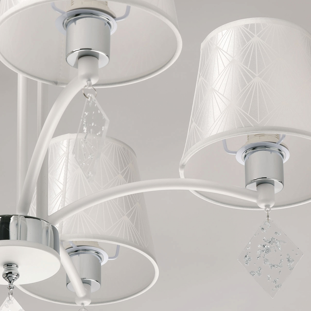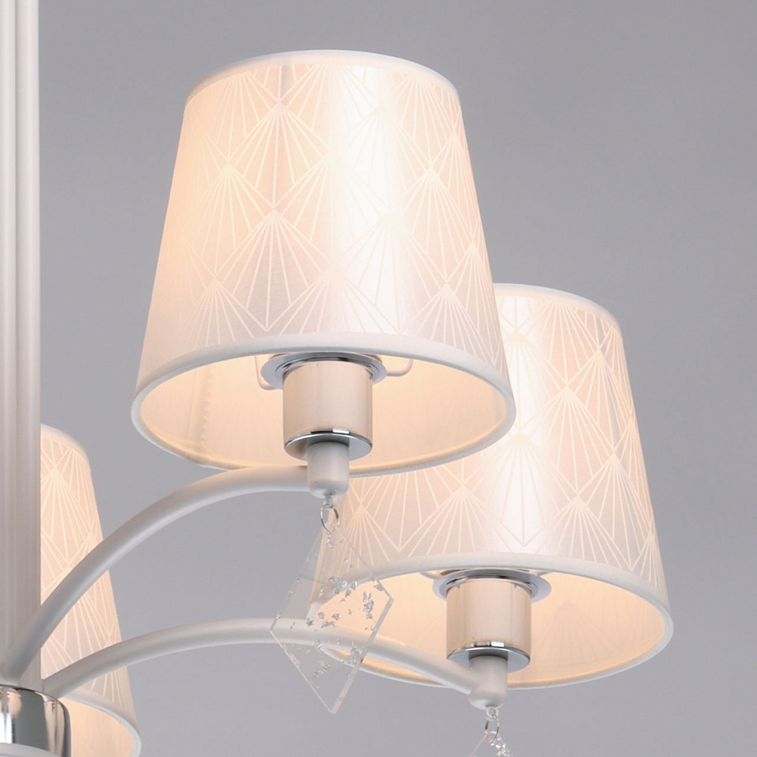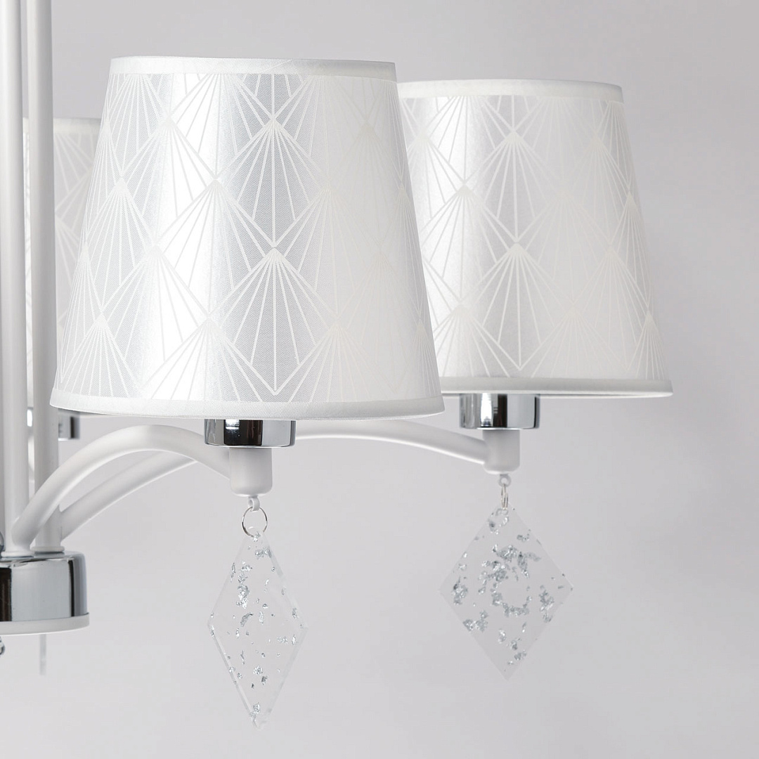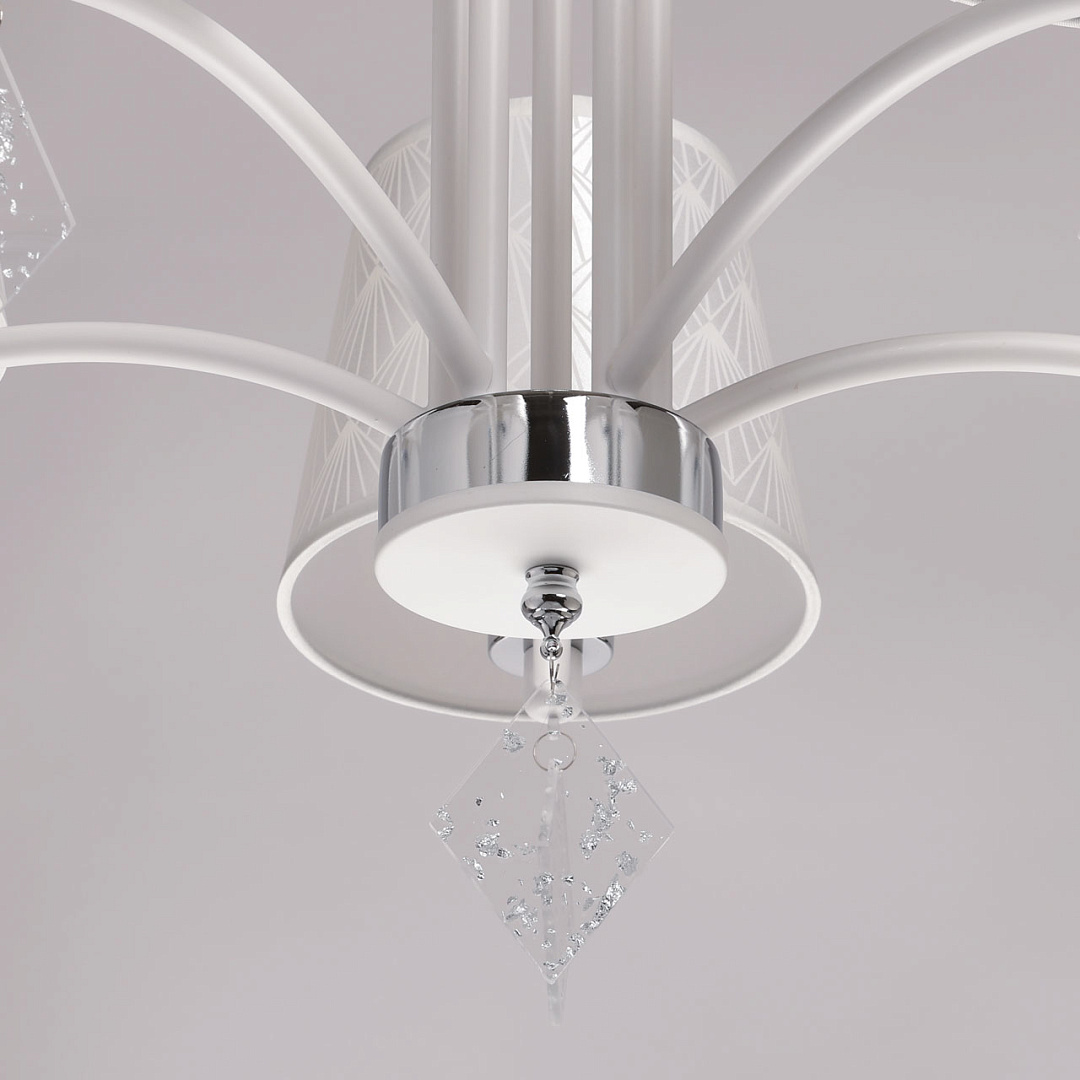 Универсальный белый цвет прекрасно подойдет в любой интерьер. Актуальное сочетание матового белого и глянцевого хрома. Винтажные абажуры создают мягкое комфортное освещение. Прозрачные подвески придают люстре гламурности. Заменяемые источники света удобны в эксплуатации.