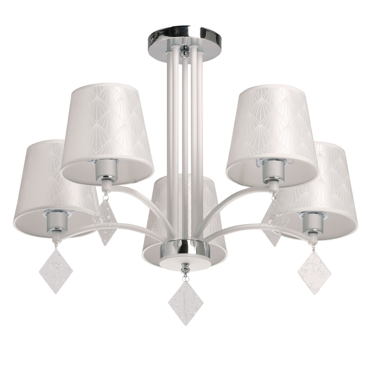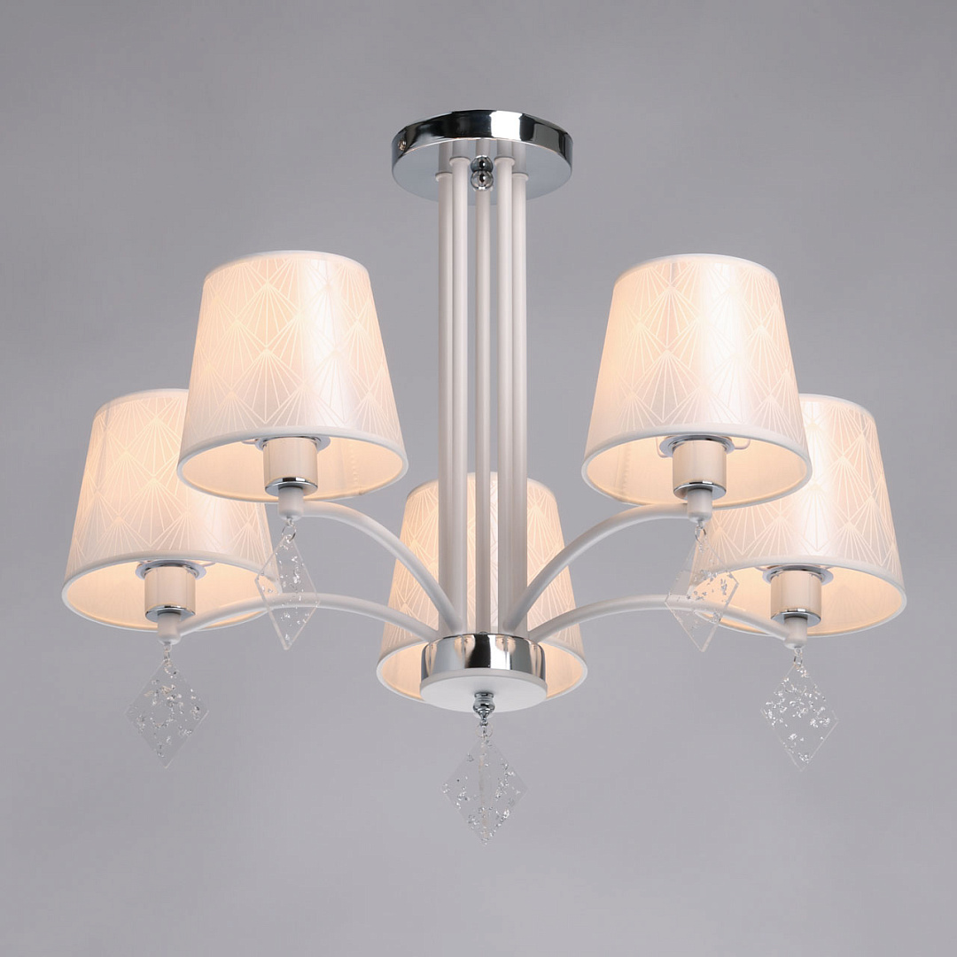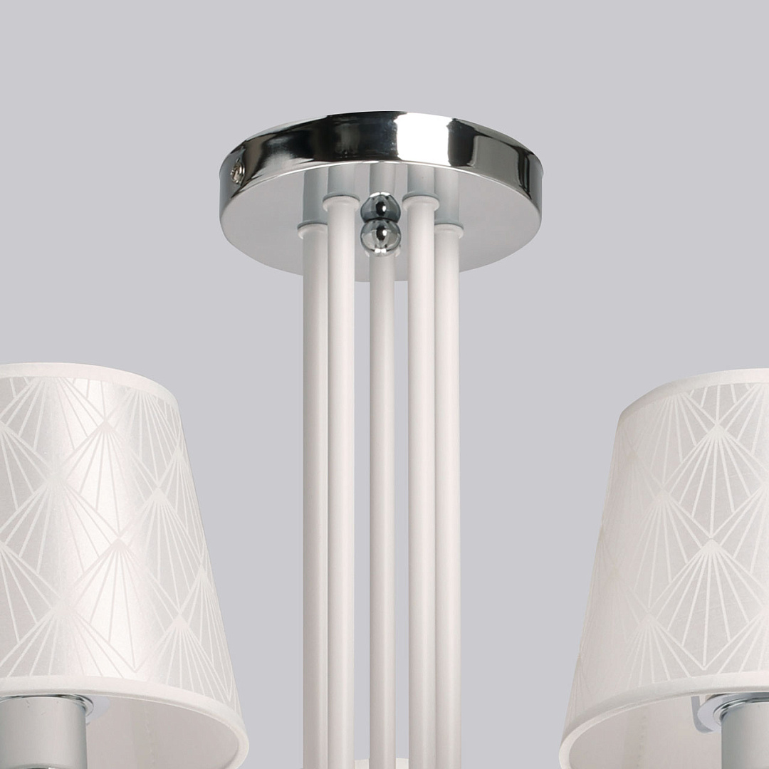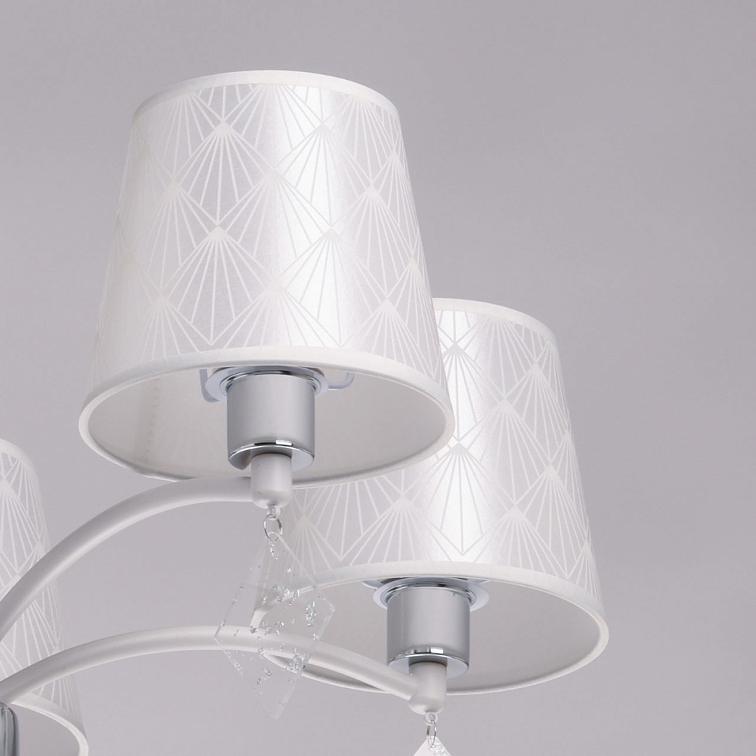 Универсальный белый цвет прекрасно подойдет в любой интерьер. Актуальное сочетание матового белого и глянцевого хрома. Винтажные абажуры создают мягкое комфортное освещение. Прозрачные подвески придают люстре гламурности. Заменяемые источники света удобны в эксплуатации.