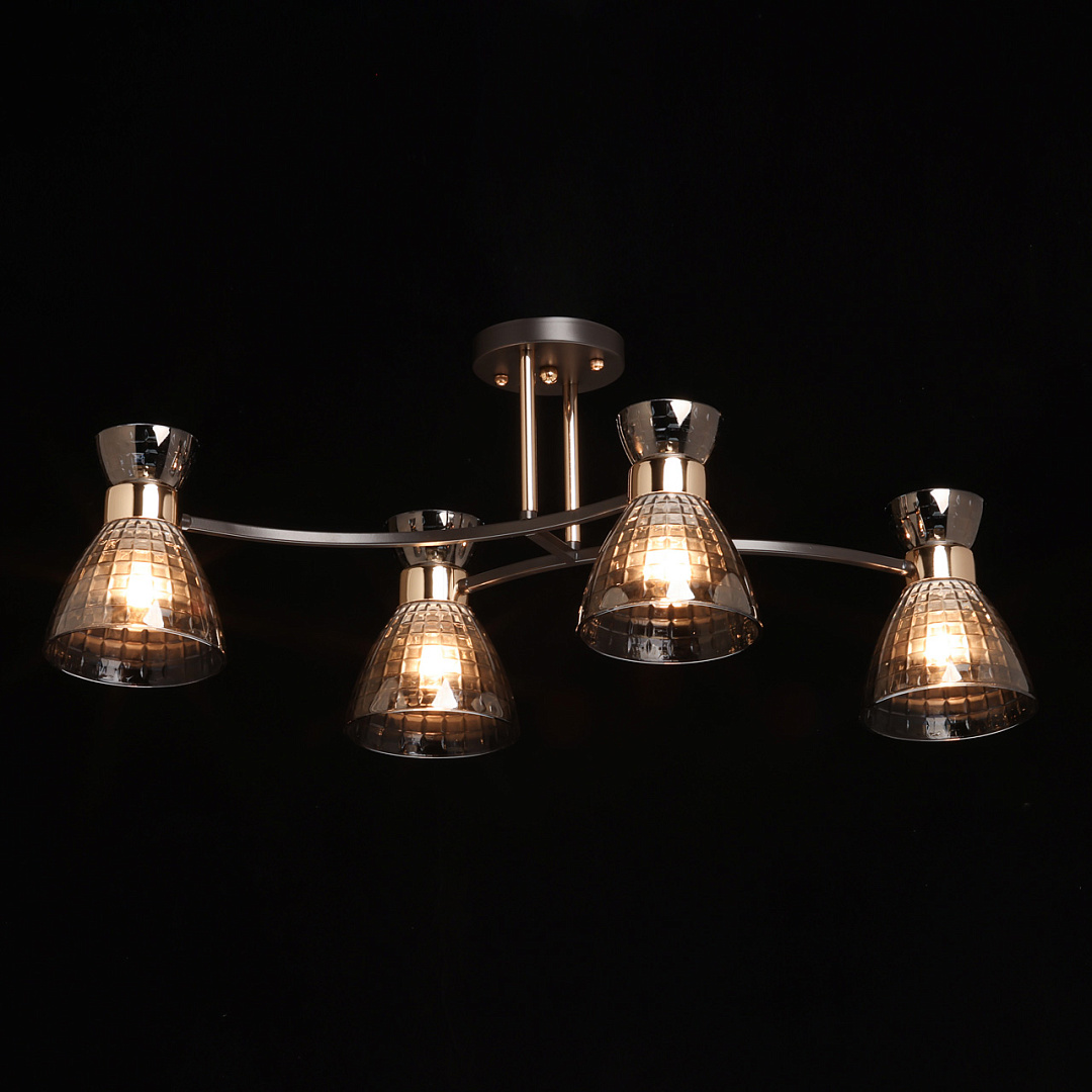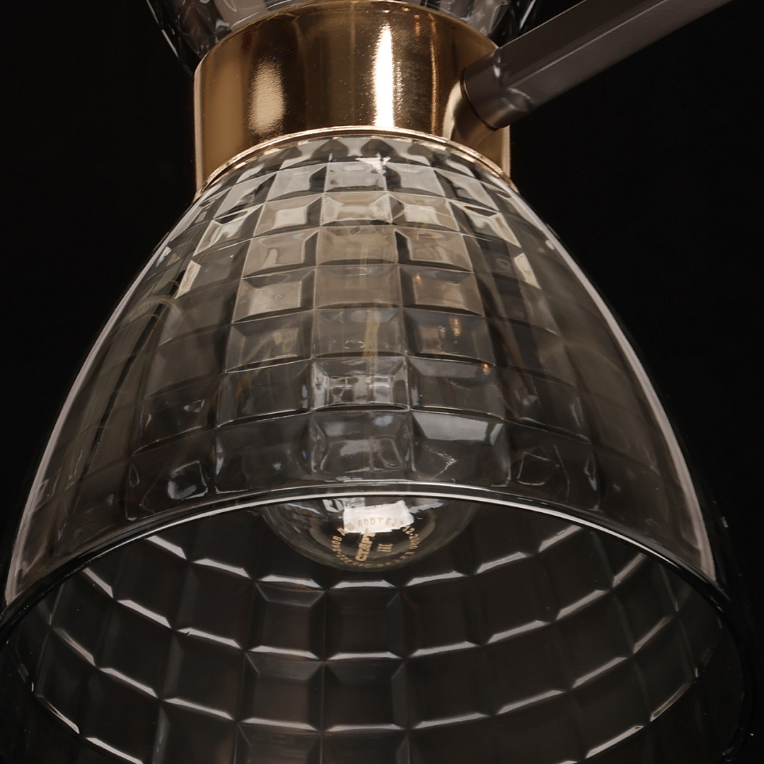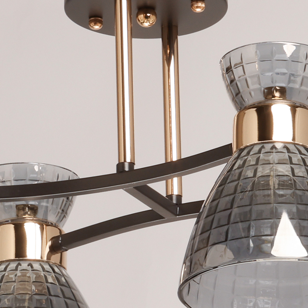 Цвет кофе на основании создает теплую и уютную атмосферу. Элементы цвета золота добавляют потолочной люстре изысканности. Дымчатый цвет стеклянных плафонов создает приятную атмосферу. Вытянутая форма люстры гармонично объединяет освещение дизайн и функциональность. Компактный размер люстры прекрасно подходит в интерьеры со стандартным потолком. Заменяемые источники света удобны в эксплуатации.