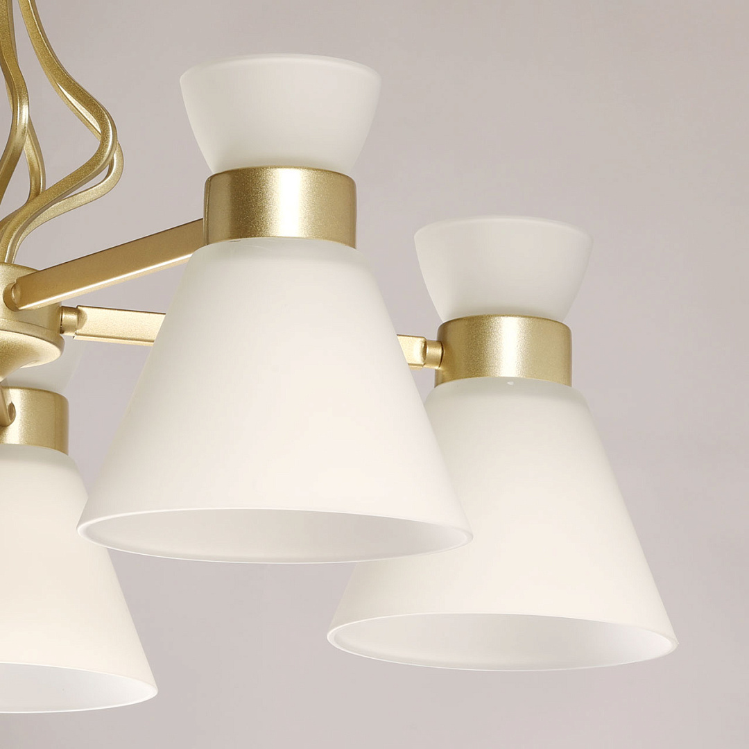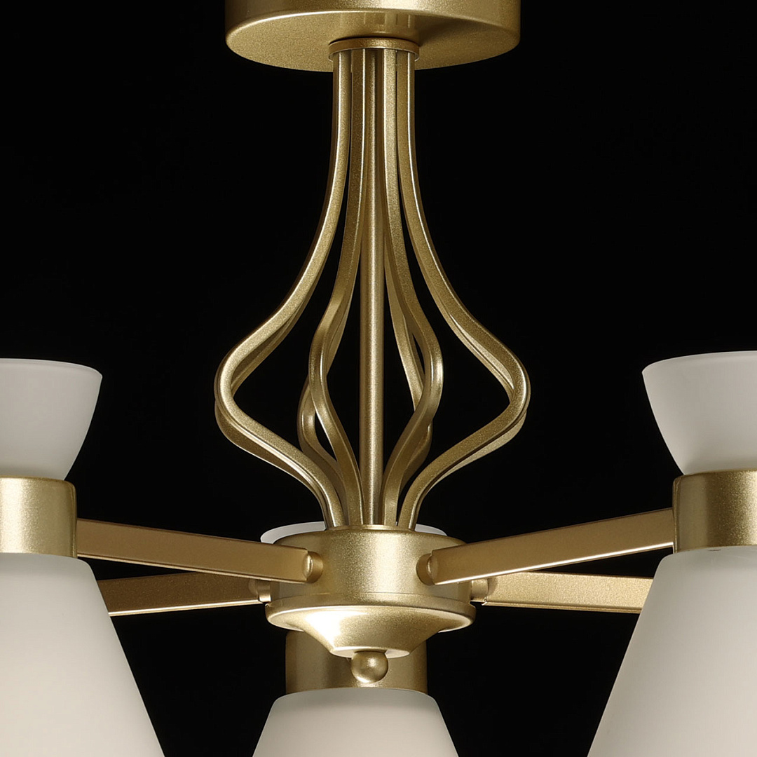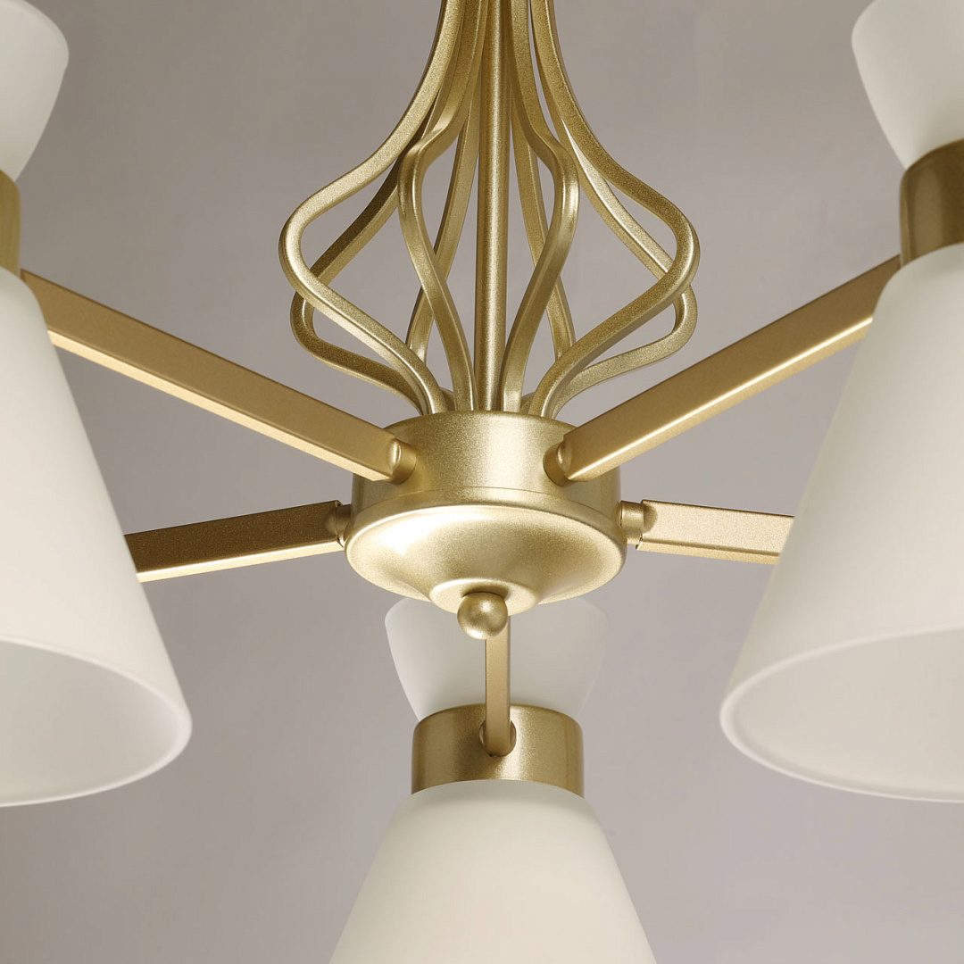 Актуальный цвет перламутрового золота придает люстре элегантность и стиль. Особый шарм создают белые стеклянные плафоны, направленные вниз. Компактный размер люстры прекрасно подходит в интерьеры со стандартным потолком. Заменяемые источники света удобны в эксплуатации.