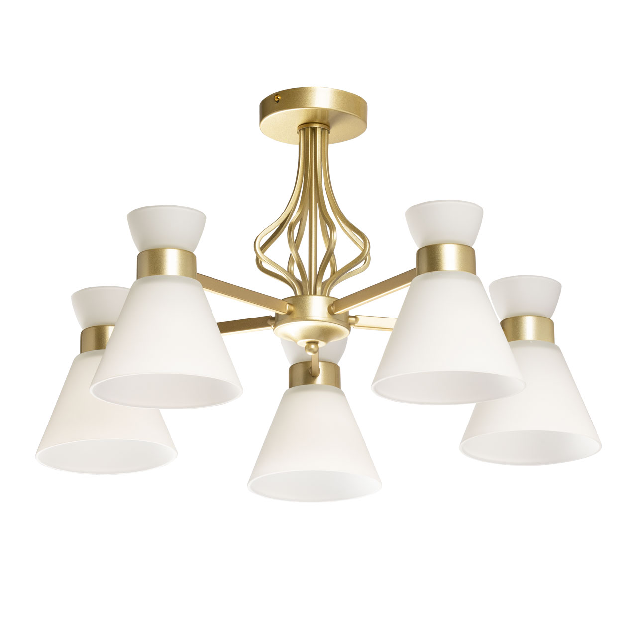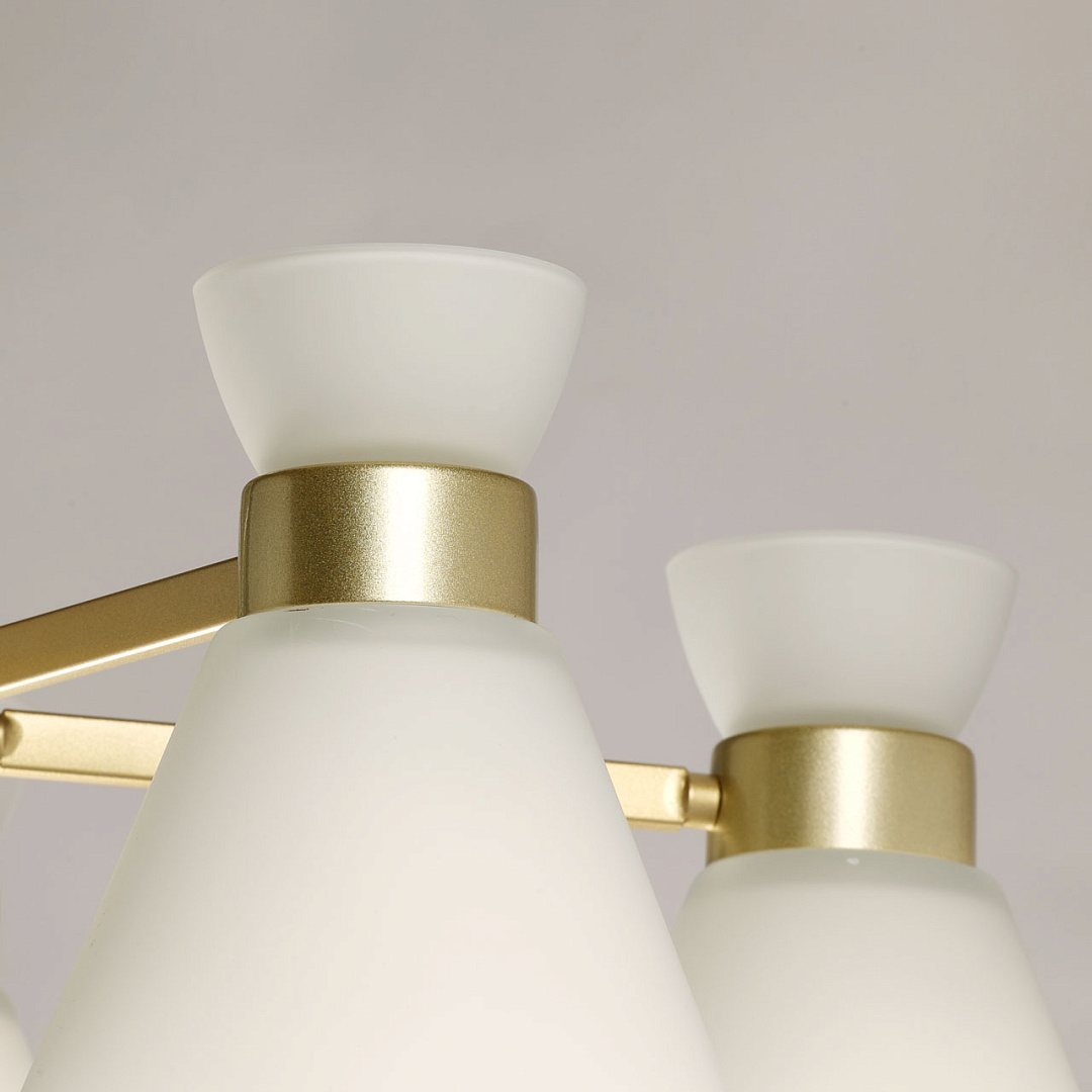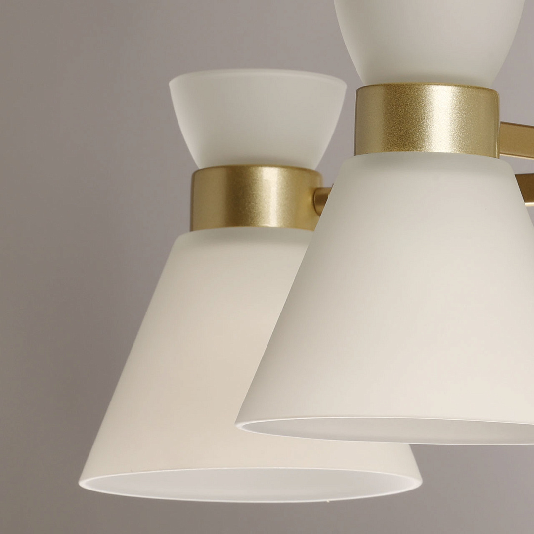 Актуальный цвет перламутрового золота придает люстре элегантность и стиль. Особый шарм создают белые стеклянные плафоны, направленные вниз. Компактный размер люстры прекрасно подходит в интерьеры со стандартным потолком. Заменяемые источники света удобны в эксплуатации.