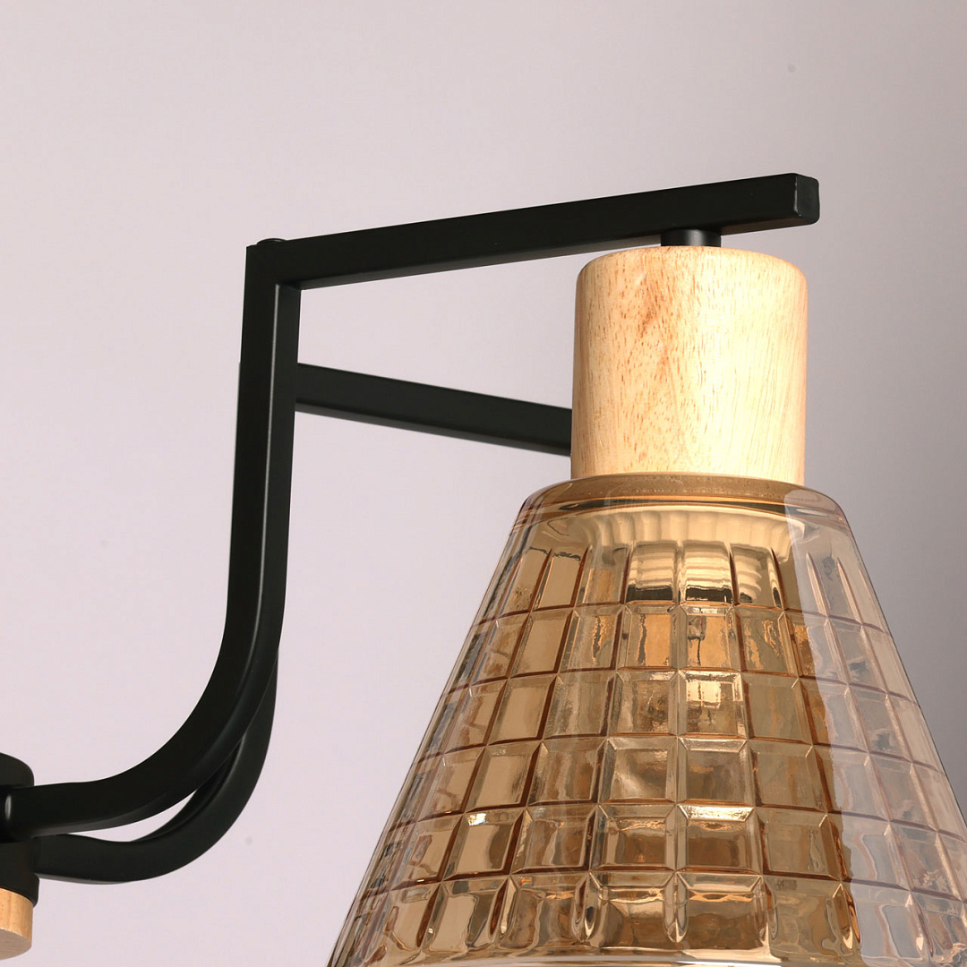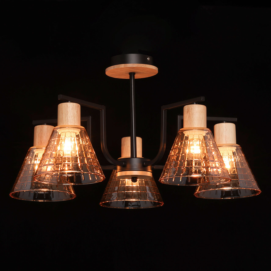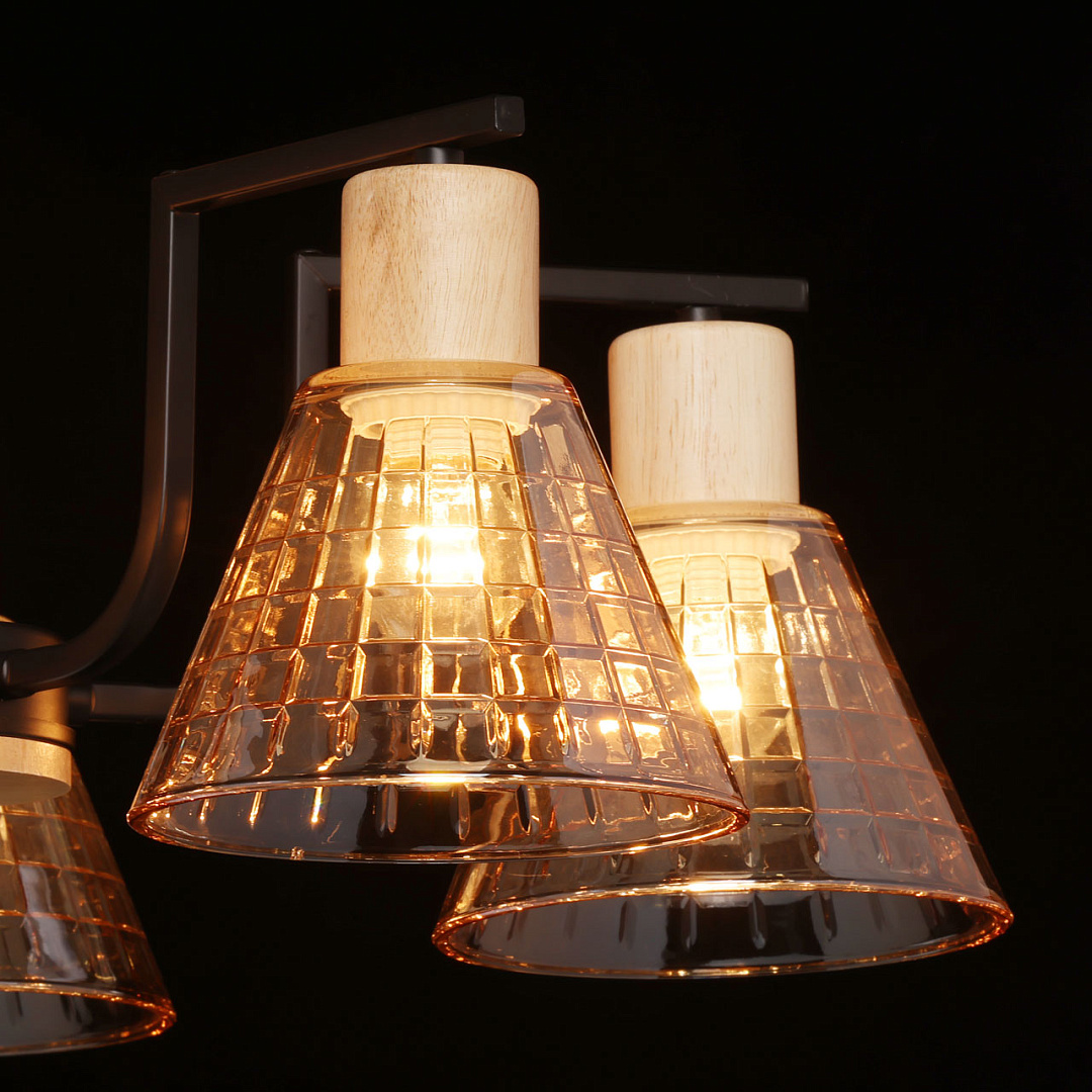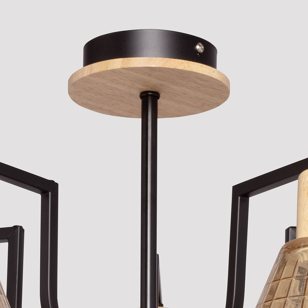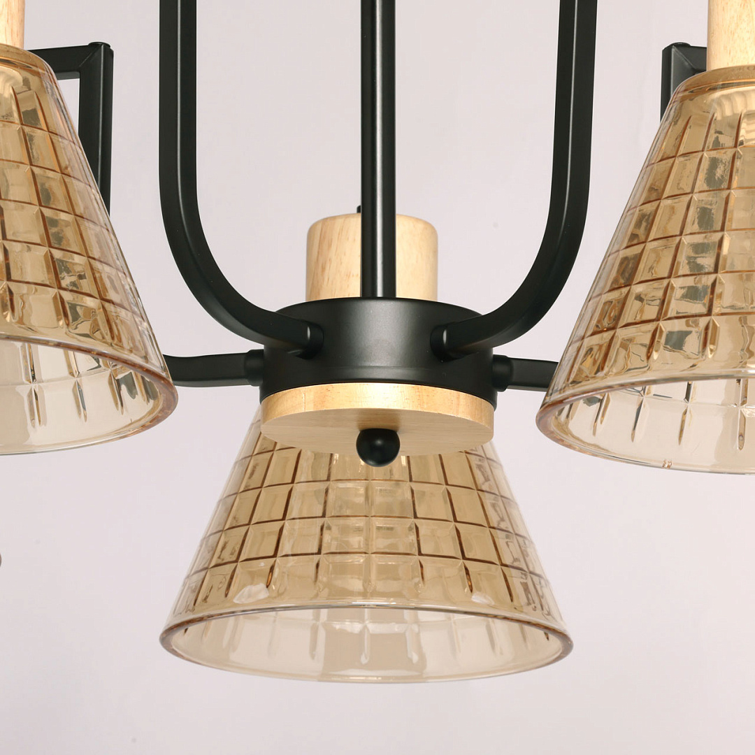 Глубокий черный цвет придает потолочной люстре сдержанную элегантность. Благородный оттенок стеклянных плафонов красиво рассеивает свет. Декор из натурального дерева создает гармоничное сочетание материалов и фактур.  Благодаря интересному дизайну этот светильник станет прекрасным дополнением к любому интерьеру. Компактный размер люстры прекрасно подходит в интерьеры со стандартным потолком. Заменяемые источники света удобны в эксплуатации.