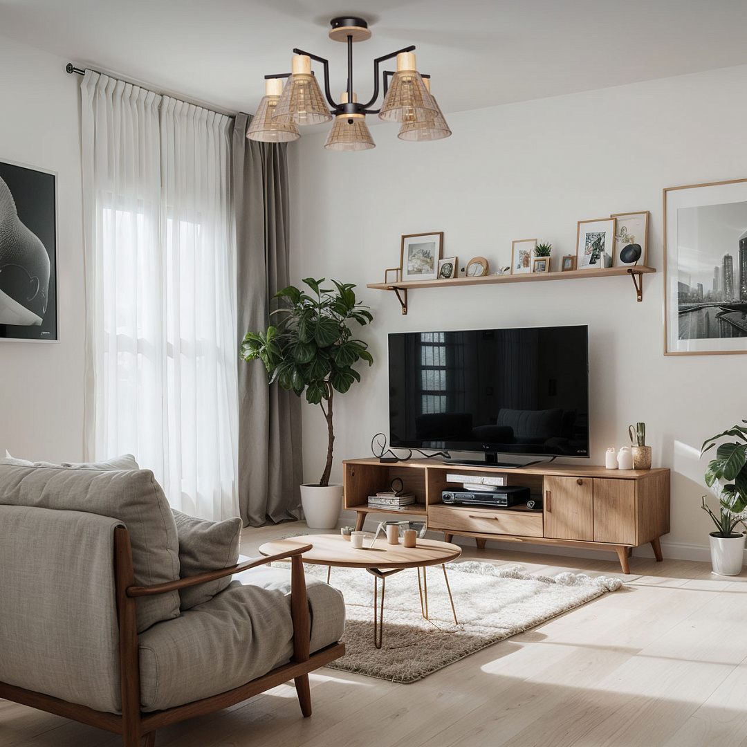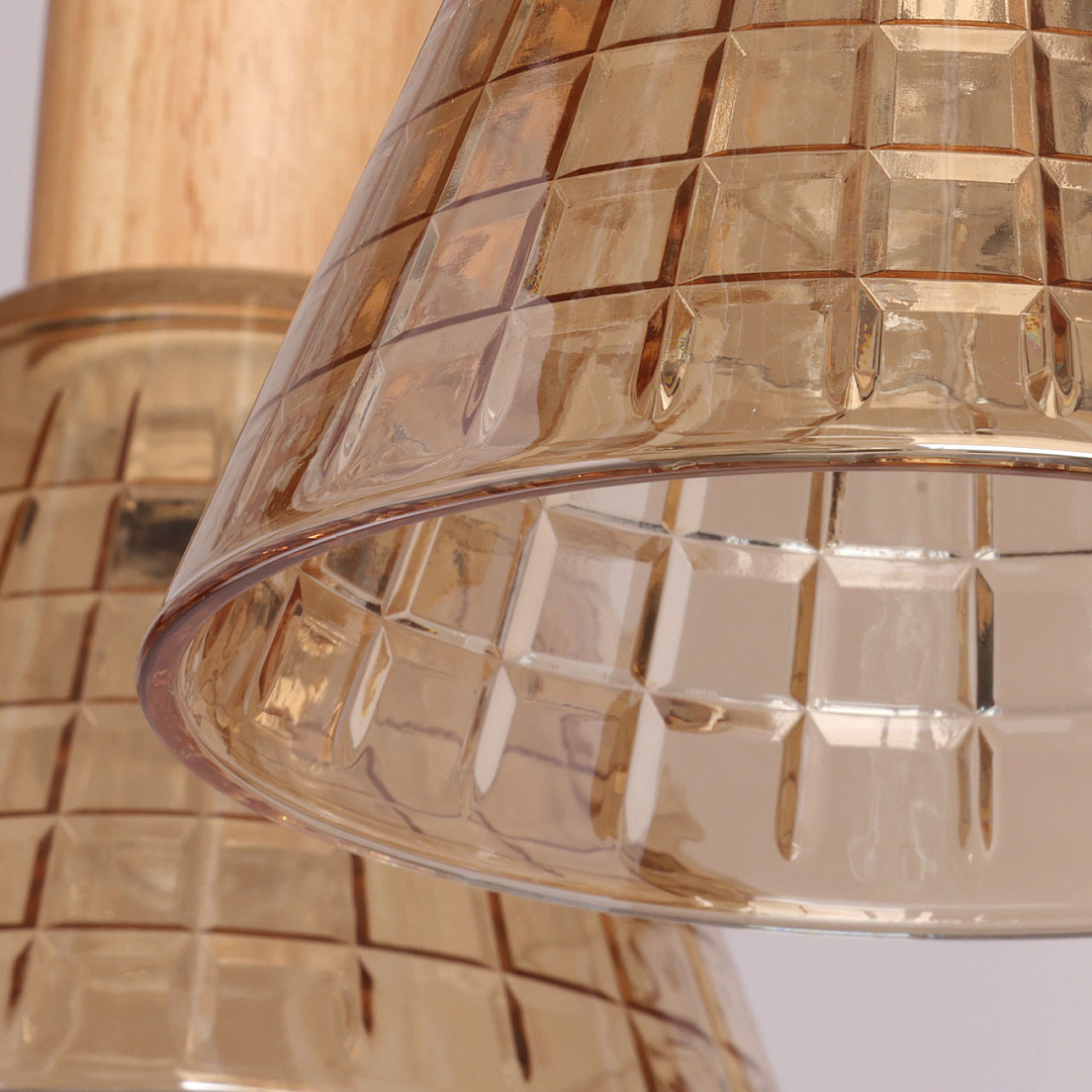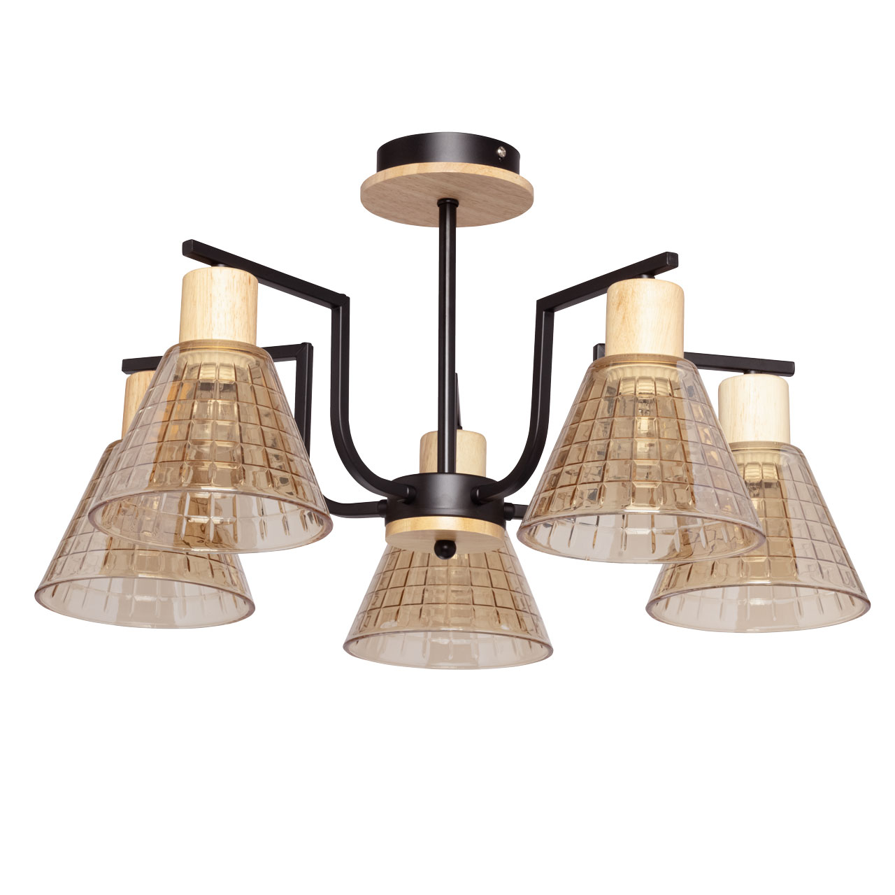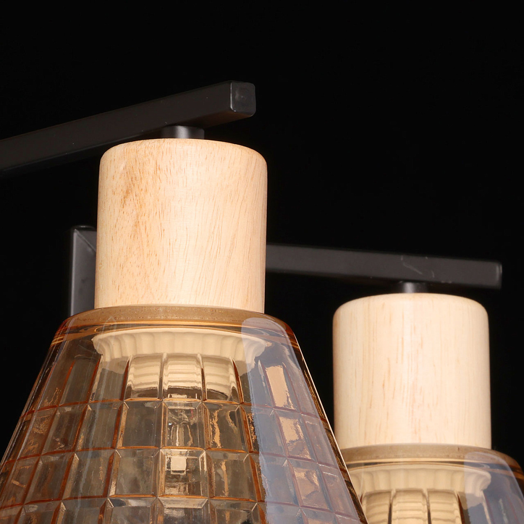 Глубокий черный цвет придает потолочной люстре сдержанную элегантность. Благородный оттенок стеклянных плафонов красиво рассеивает свет. Декор из натурального дерева создает гармоничное сочетание материалов и фактур.  Благодаря интересному дизайну этот светильник станет прекрасным дополнением к любому интерьеру. Компактный размер люстры прекрасно подходит в интерьеры со стандартным потолком. Заменяемые источники света удобны в эксплуатации.