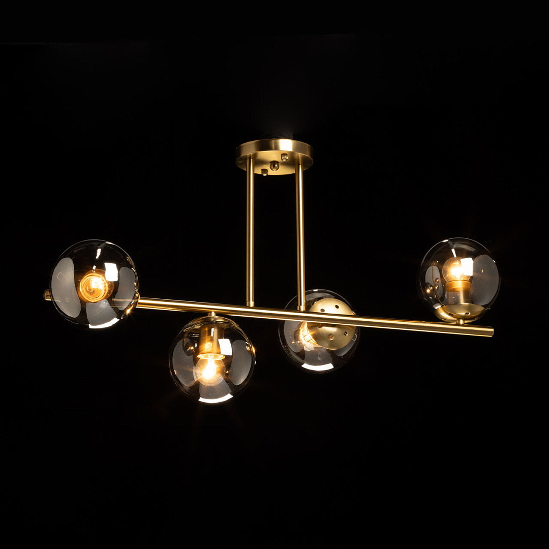 Благодаря сочетанию гальванизированного металла, стекла и золотистых акцентов, люстра привнесет в интерьер неповторимый стиль и атмосферу уюта. Асимметричное расположение стеклянных плафонов придает ей оригинальность и индивидуальность. Дымчатый цвет плафонов создает комфортное мягкое освещение. Светильник вытянут горизонтально, благодаря чему он освещает большую площадь. Заменяемые источники света делают ее удобной в использовании.
