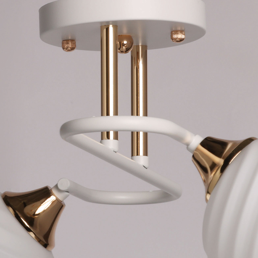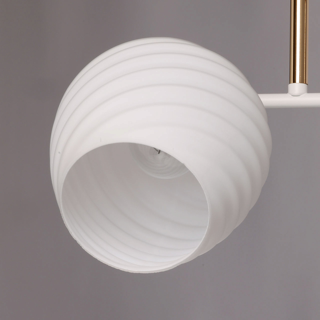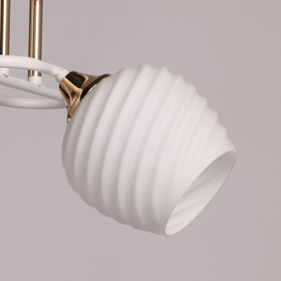 Гармоничное сочетание белого и цвета золота придает потолочной люстре универсальности. Белые стеклянные плафоны, оформленные в стиле модерн, создают мягкое освещение. Компактный размер люстры прекрасно подходит в интерьеры со стандартным потолком. Заменяемые источники света удобны в эксплуатации.