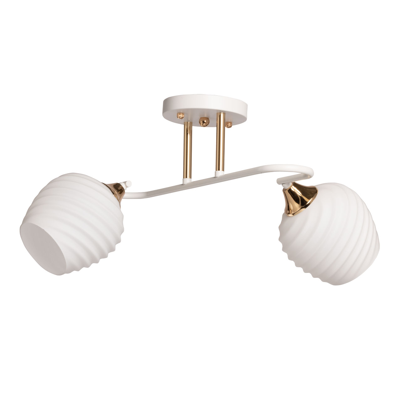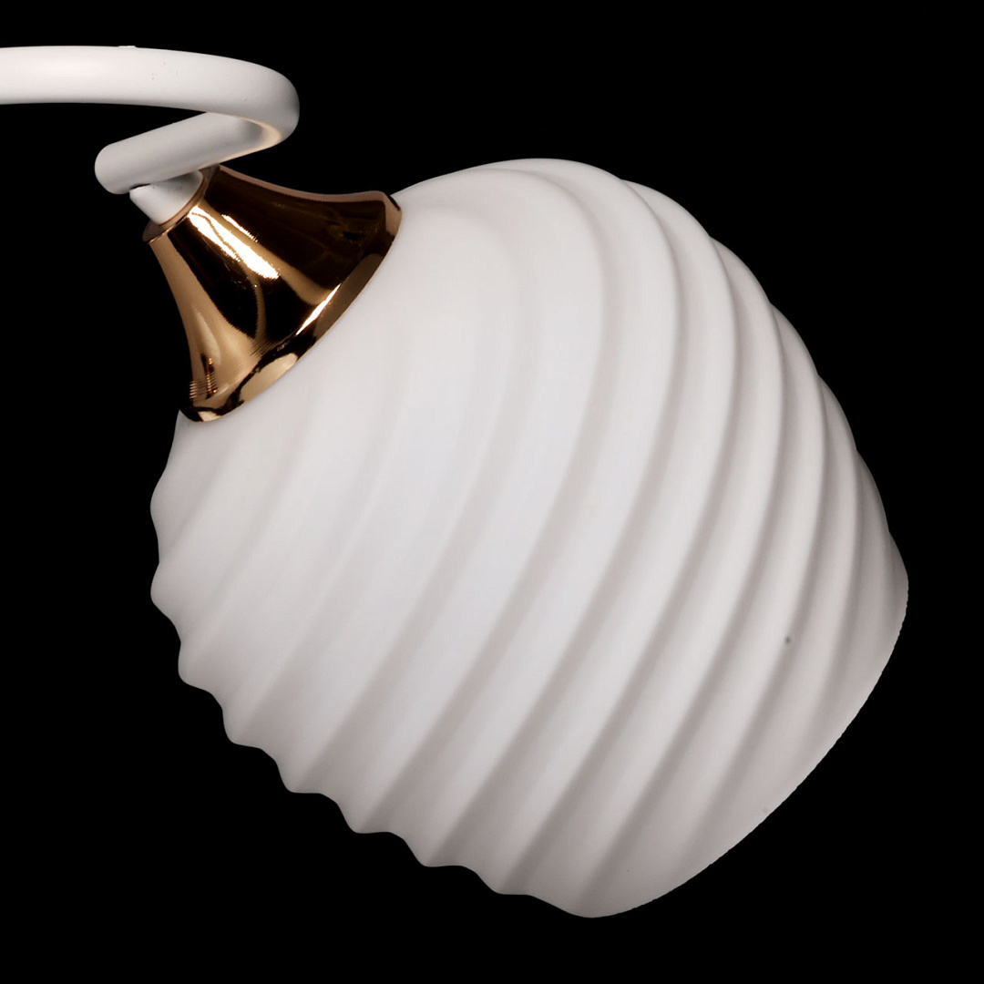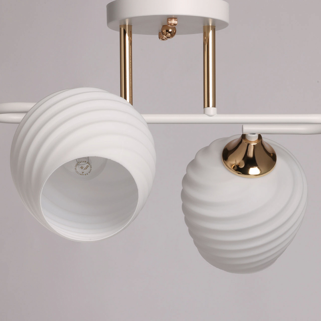 Гармоничное сочетание белого и цвета золота придает потолочной люстре универсальности. Белые стеклянные плафоны, оформленные в стиле модерн, создают мягкое освещение. Компактный размер люстры прекрасно подходит в интерьеры со стандартным потолком. Заменяемые источники света удобны в эксплуатации.