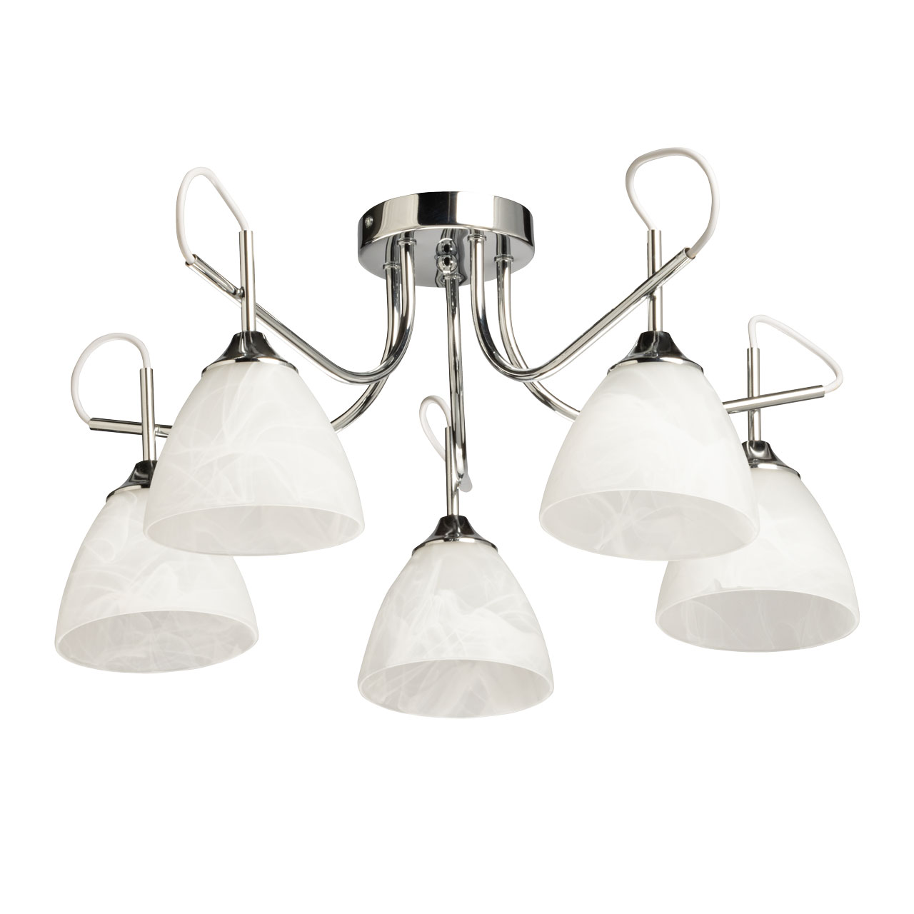 Стильный и современный дизайн люстры отлично впишется в различные интерьеры. Стекло и металл, использованные в конструкции, придают изделию элегантность и долговечность.Плафоны люстры окрашены в белый цвет с эффектом алебастра, что придает им уникальный и изысканный вид. Эффект алебастра создает матовый оттенок и текстуру, напоминающую мрамор, что делает свет, исходящий от ламп, еще более мягким и приятным для глаз.Направленные вниз источники света обеспечивают хорошее основное освещение.Компактный размер люстры прекрасно подходит в интерьеры со стандартным потолком. Заменяемые источники света удобны в эксплуатации.