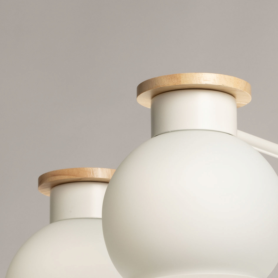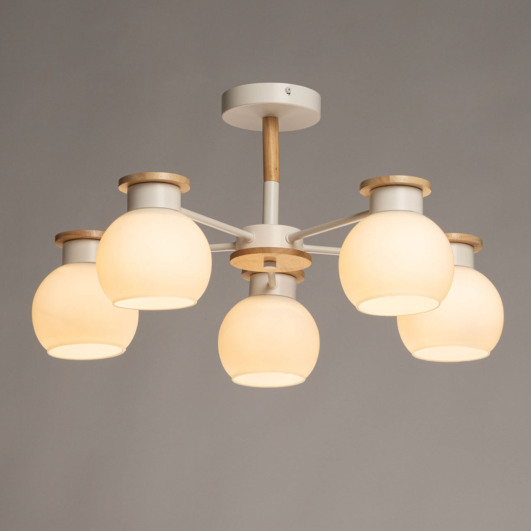 Благодаря простому и универсальному дизайну, эта люстра может быть использована в различных типах интерьеров, от современных до классических.А белый цвет придает особую утонченность и элегантность. Особый шарм создают белые стеклянные плафоны округлой формы, направленные вниз. Натуральности и теплоты в интерьер добавляют декоративные элементы из натурального дерева. Компактный размер люстры прекрасно подходит в интерьеры со стандартным потолком. Заменяемые источники света удобны в эксплуатации.