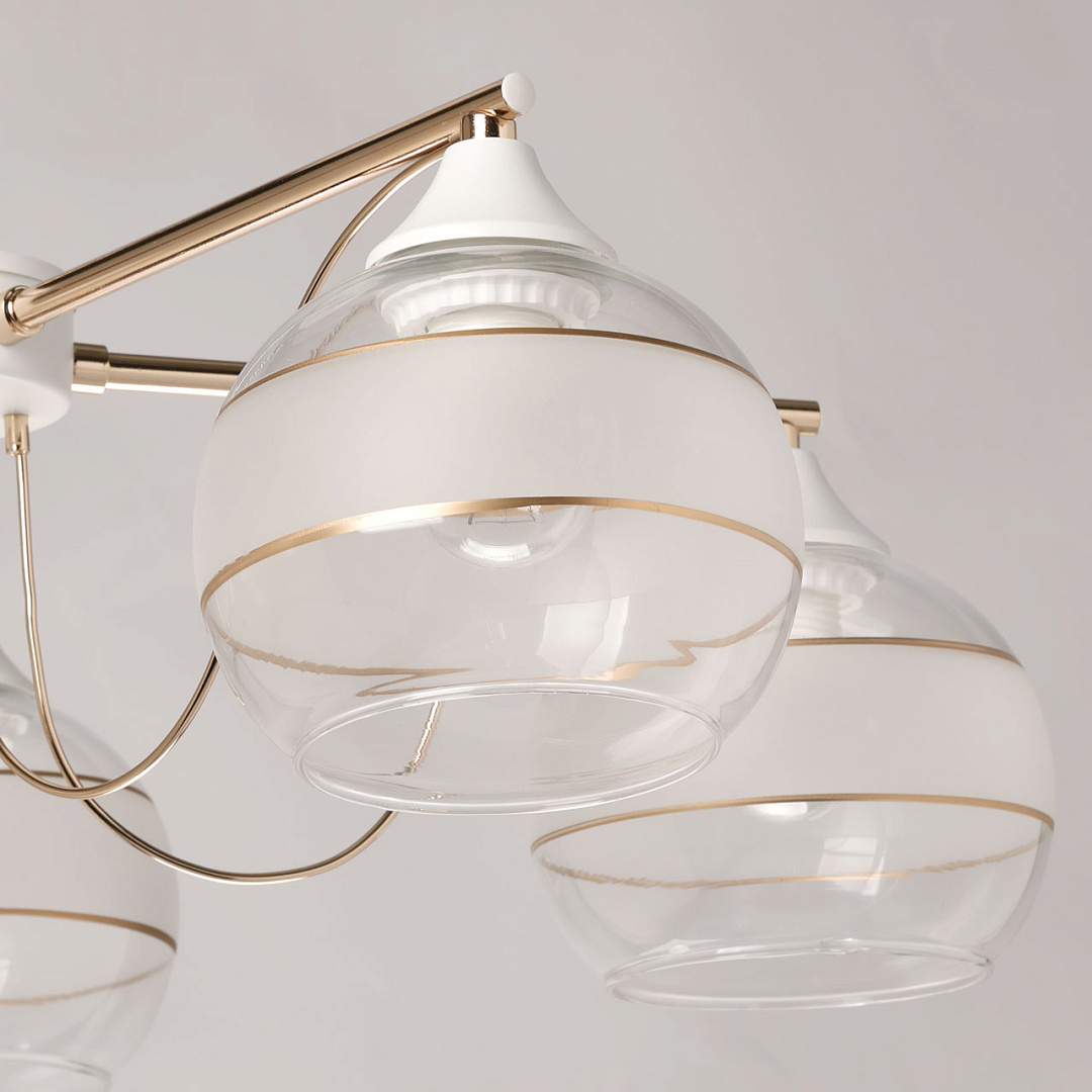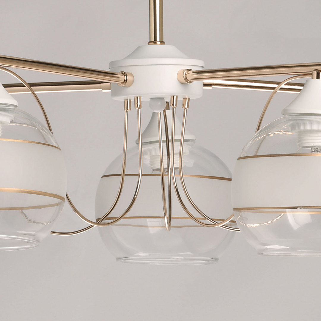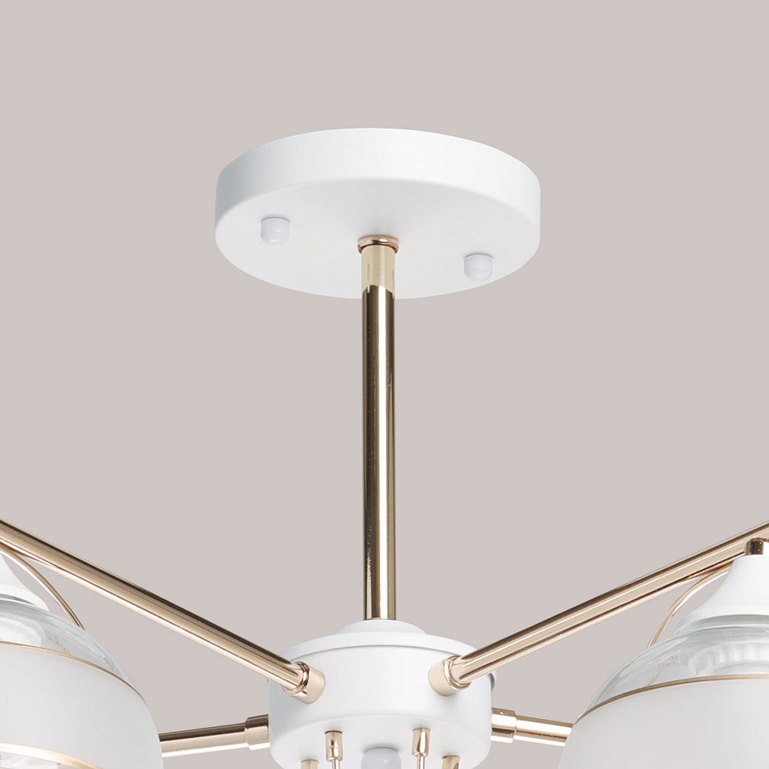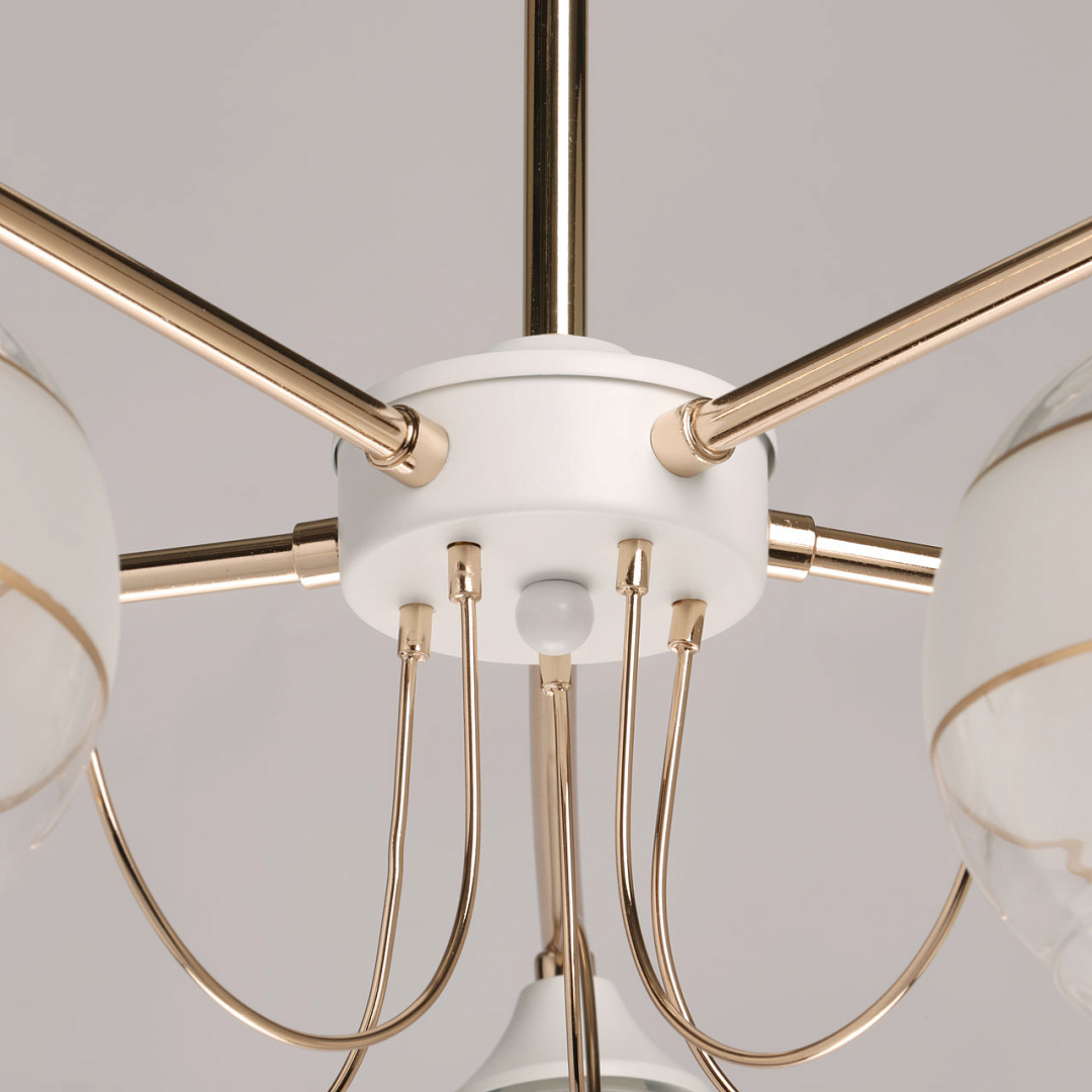 Гармоничное сочетание белого цвета и цвета золота выгодно подчеркнет современный стиль в интерьере. Изящные линии декора придают люстре объемности. Заменяемые источники света удобны в эксплуатации. Компактный размер потолочной люстры сохранит пространство комнаты при стандартных потолках.