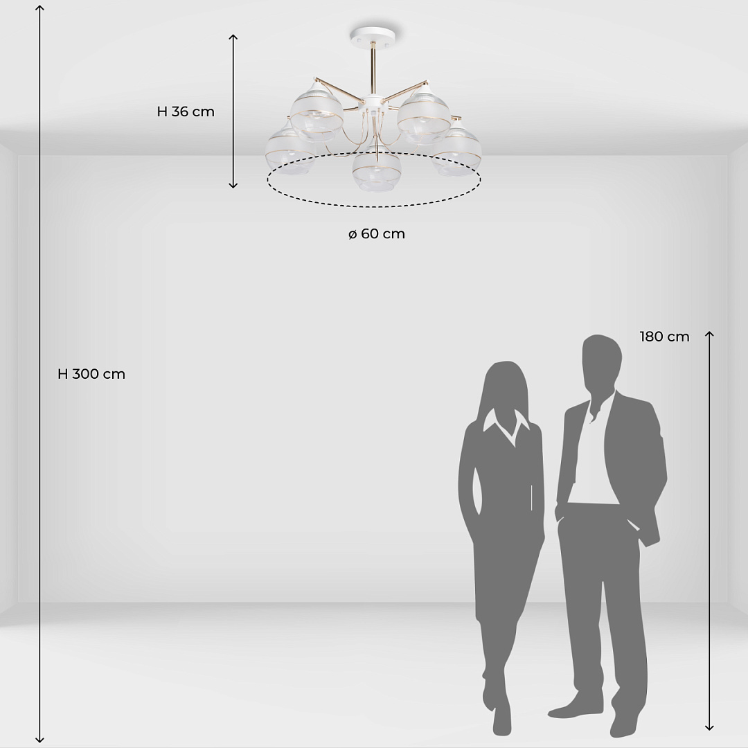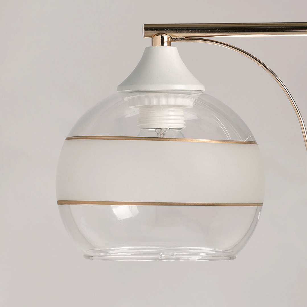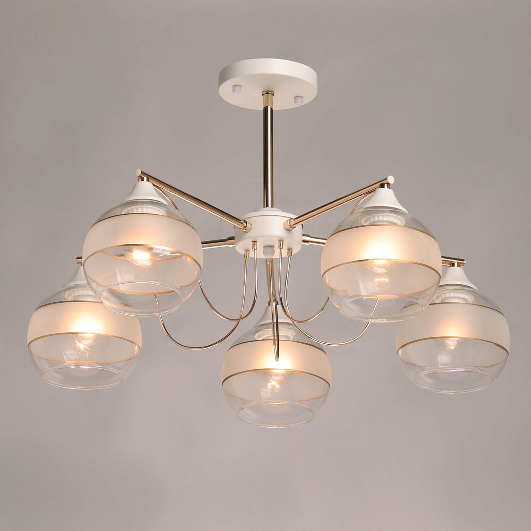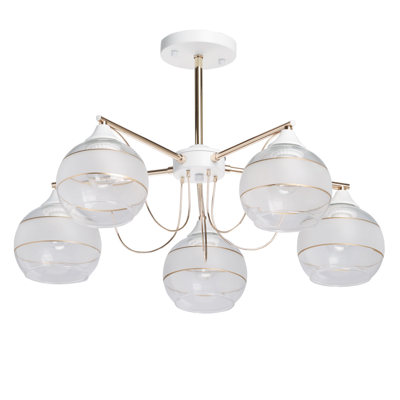 Гармоничное сочетание белого цвета и цвета золота выгодно подчеркнет современный стиль в интерьере. Изящные линии декора придают люстре объемности. Заменяемые источники света удобны в эксплуатации. Компактный размер потолочной люстры сохранит пространство комнаты при стандартных потолках.