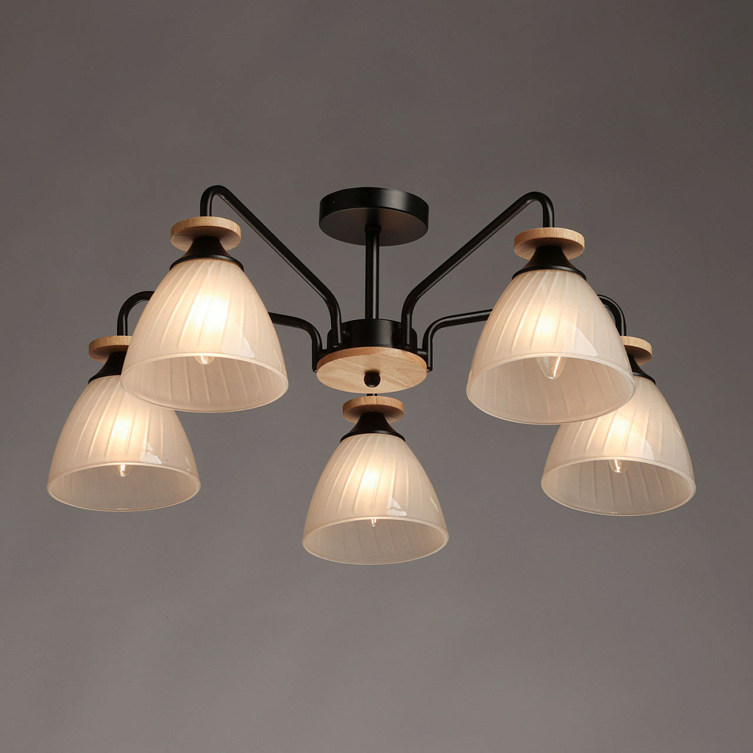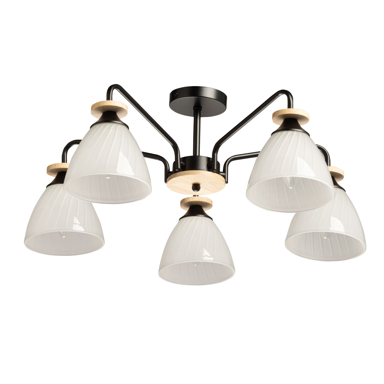 Благодаря простому и универсальному дизайну, эта люстра может быть использована в различных типах интерьеров, от современных до классических.Сочетание черного цвета и дерева является стильным и универсальным решением, которое вносит современность и элегантность в любой интерьер. Контраст этих двух элементов с белым цветом усиливает визуальное восприятие и добавляет изысканности пространству. Особый шарм создают белые стеклянные плафоны с лаконичным орнаментом, направленные вниз. Натуральности и теплоты в интерьер добавляют декоративные элементы из натурального дерева. Компактный размер люстры прекрасно подходит в интерьеры со стандартным потолком. Заменяемые источники света удобны в эксплуатации.