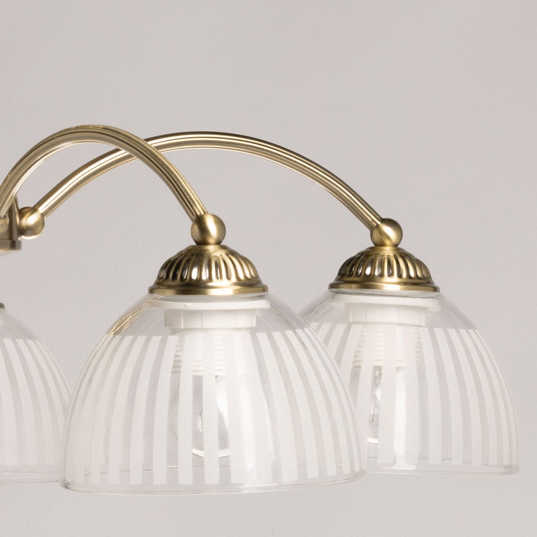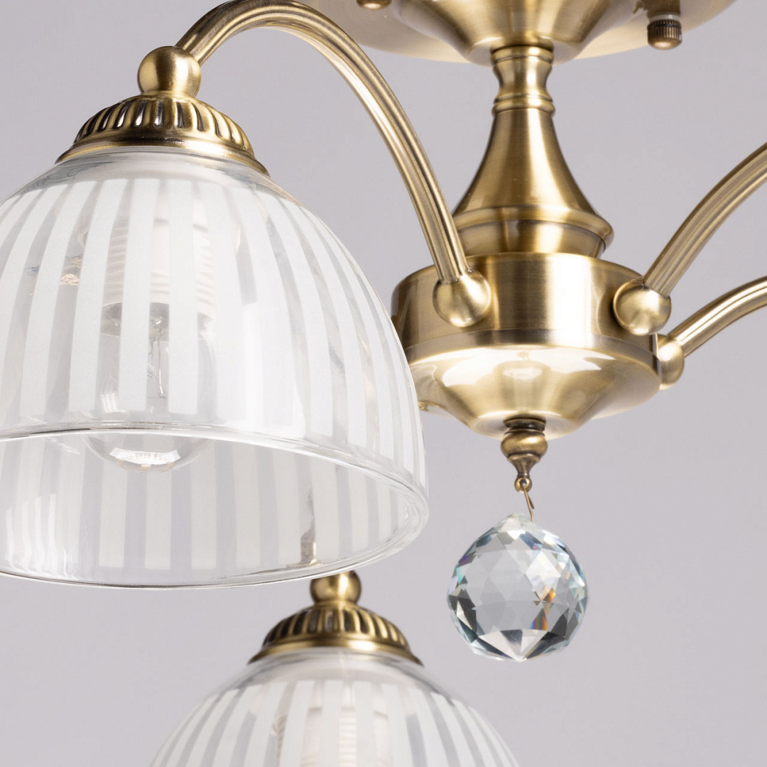 Элегантный золотой  цвет основания подчеркивает принадлежность люстры к классическому стилю. Прозрачные стеклянные плафоны направляют световой поток вниз, создавая яркое освещение. Компактный размер люстры прекрасно подойдет в помещения со стандартным потолком. Заменяемые источники света удобны в эксплуатации.